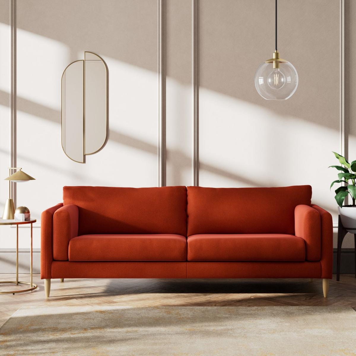 When it's made for you, you know you'll love it. The Newington is a contemporary 4-seater sofa with excellent credentials. It combines a modern linear design with plenty of cushioned comfort. There's even a smart pair of slim side bolsters to nestle against. Upholstered in rich velvet, The Newington has a luxe look. While wooden turned legs add the finishing touch. Offering relaxed comfort, the Newington's reversible seat cushions use high density foam core wrapped in soft fibre wadding to create the perfect balance of support, durability and recovery. Hand made to order in the UK, the Newington uses quality materials and traditional techniques for furniture that's unique to you. Available in a choice of sizes and fabrics including Aquaclean technology protection built into the yarn, which is easy to clean with just water. Part of the Newington collection. Material: Made from 100% recycled polyester. Wooden feet - ash. Removable seats with foam fibre wrap filling. Removable cushion(s) with foam fibre wrap filling. Free fabric swatch available on this line. Dimensions: Size H82, W216, D88cm. Floor to seat height: 47cm. Depth of seat: 55cm. Height of seat back: 40cm. Width of seating area between arms: 174cm. Height of arm rest: 68cm. Weight: 52kg. Packaged dimensions: Package size H57, W221, D93cm. General information: FSC certified meaning the materials used for this product are responsibly sourced. We do more than deliver your product, we unpack, set it up and take away the packaging. Manufactured in the UK using components sourced globally. Professional clean only. Plump cushions regularly to maintain shape. Manufacturer's 15 year frame guarantee.