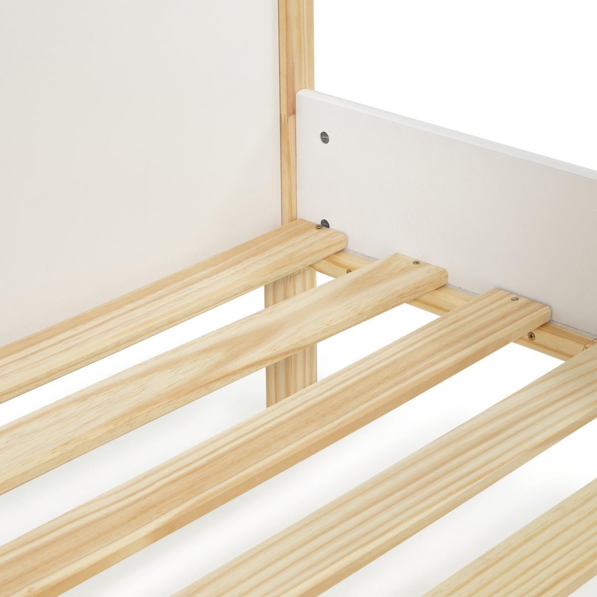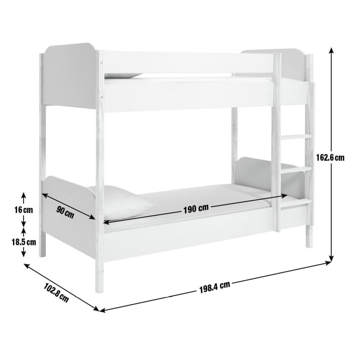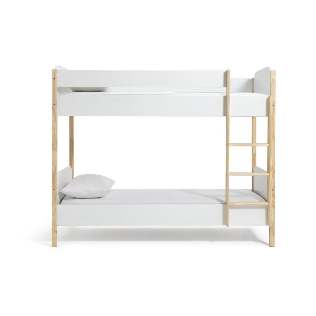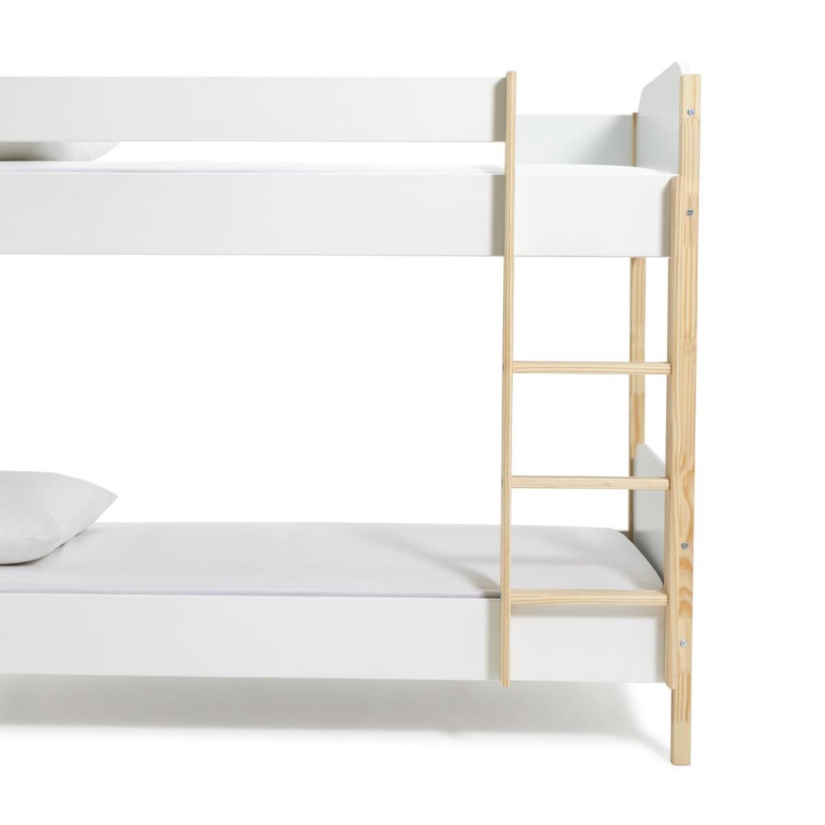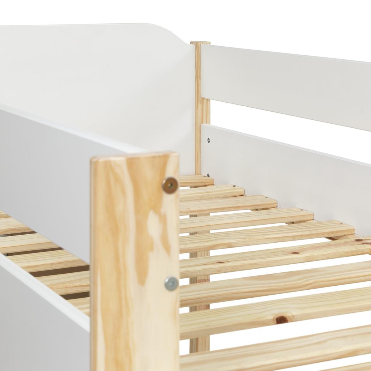 Snuggle in, Scandi style. Our cute kids two-tone bunk bed is part of the Nico collection. In bright white and natural pine it's simple, modern and versatile. The curved headboards and footboards and solid wood frame bring a clean, contemporary feel. And features a strong ladder and side guard on the top bunk. Sprung wooden slats make for a good night's rest, too, just add a couple of comfy mattresses. Sweet dreams, sleepyheads.