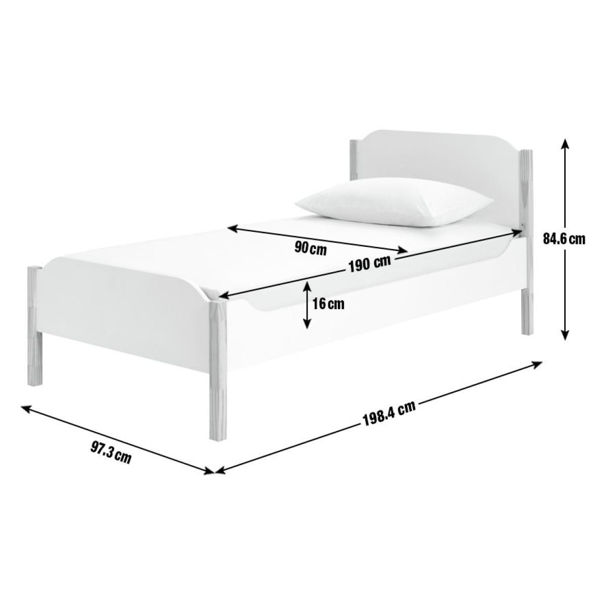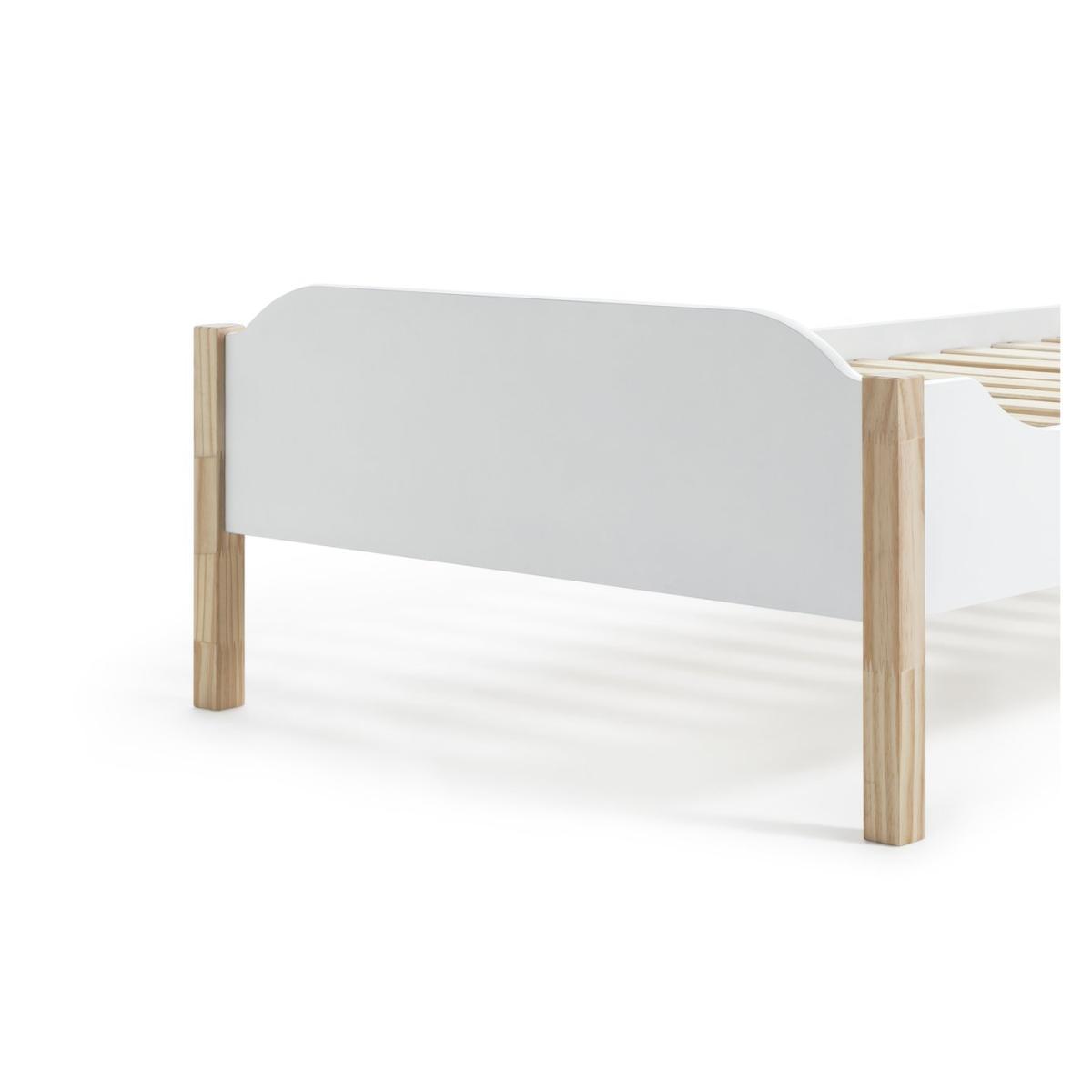 Snuggle in, Scandi style. This is Nico, our two-tone kids bed frame. In bright white and natural pine, it's simple, modern and versatile. A large, curved headboard and solid wood legs bring a fresh, contemporary feel to your youngster's bedroom. Weight tested to 100kg, it's built for bouncing. And sprung wooden slats make for a good night's rest, just add a mattress. Sweet dreams, sleepyhead.