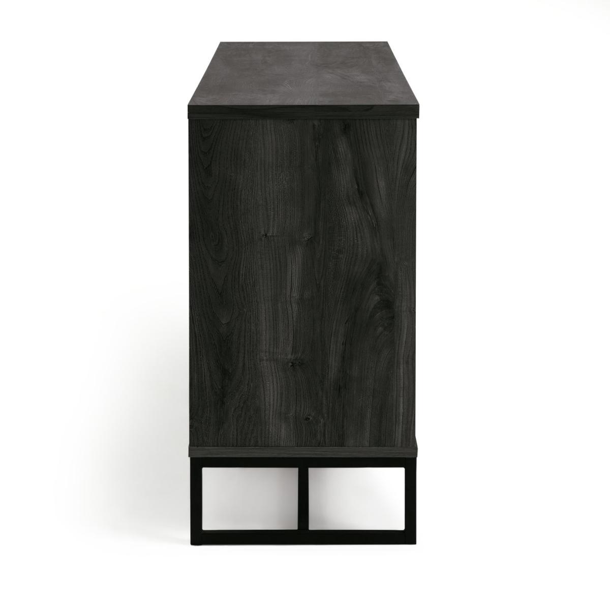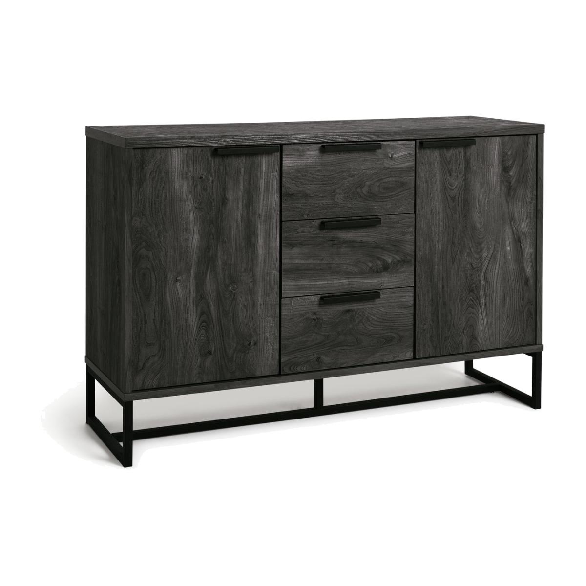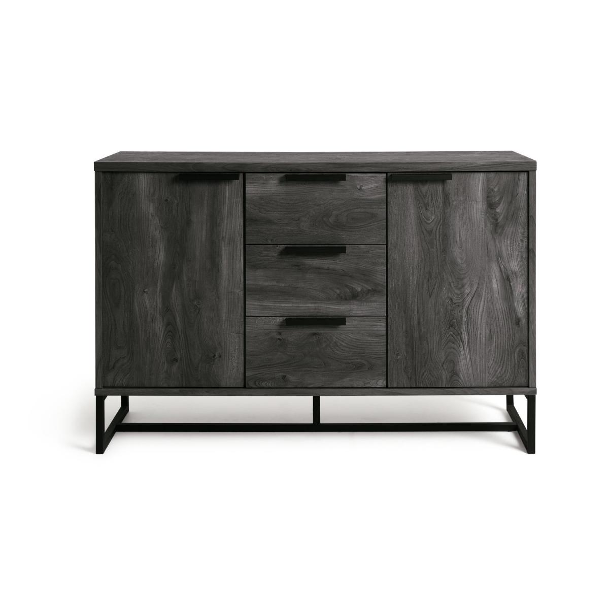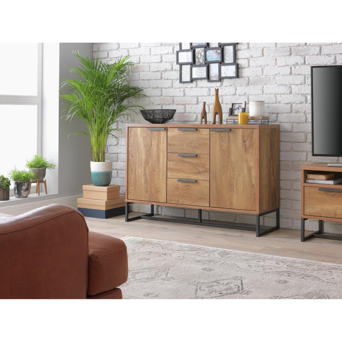 Tap into industrial chic. The Habitat Nomad display sideboard's mix of metal framework and rich wood-effect finish stuns. Get your living space in order. The top surface offers the perfect spot for your favourite family photos and treasured keepsakes. Say goodbye to clutter with the 3 drawers - perfect for tucking away your lounge bits and bobs. Even more storage can be found with the 2 side cupboards. Part of the Nomad collection. Made from MDF with a wood effect finish. Size H 80, W 118.4, D39.8cm. Black handles. 3 drawers with metal runners. 2 doors. 2 adjustable shelves. Weight 48kg. Self-assembly - 2 people recommended. Maximum load weight 50kg. If this product is over 60cm high it must be securely attached to the wall to prevent overturning. Package Dimensions: Package 1 dimensions: H21, W128.4, D41.7cm. Package 1 weight: 50.5kg. General information: We are excited to be welcoming some of our favourite HOME products into the Habitat range. Your product may arrive in Habitat or HOME packaging. FSC certified meaning the materials used for this product are responsibly sourced.