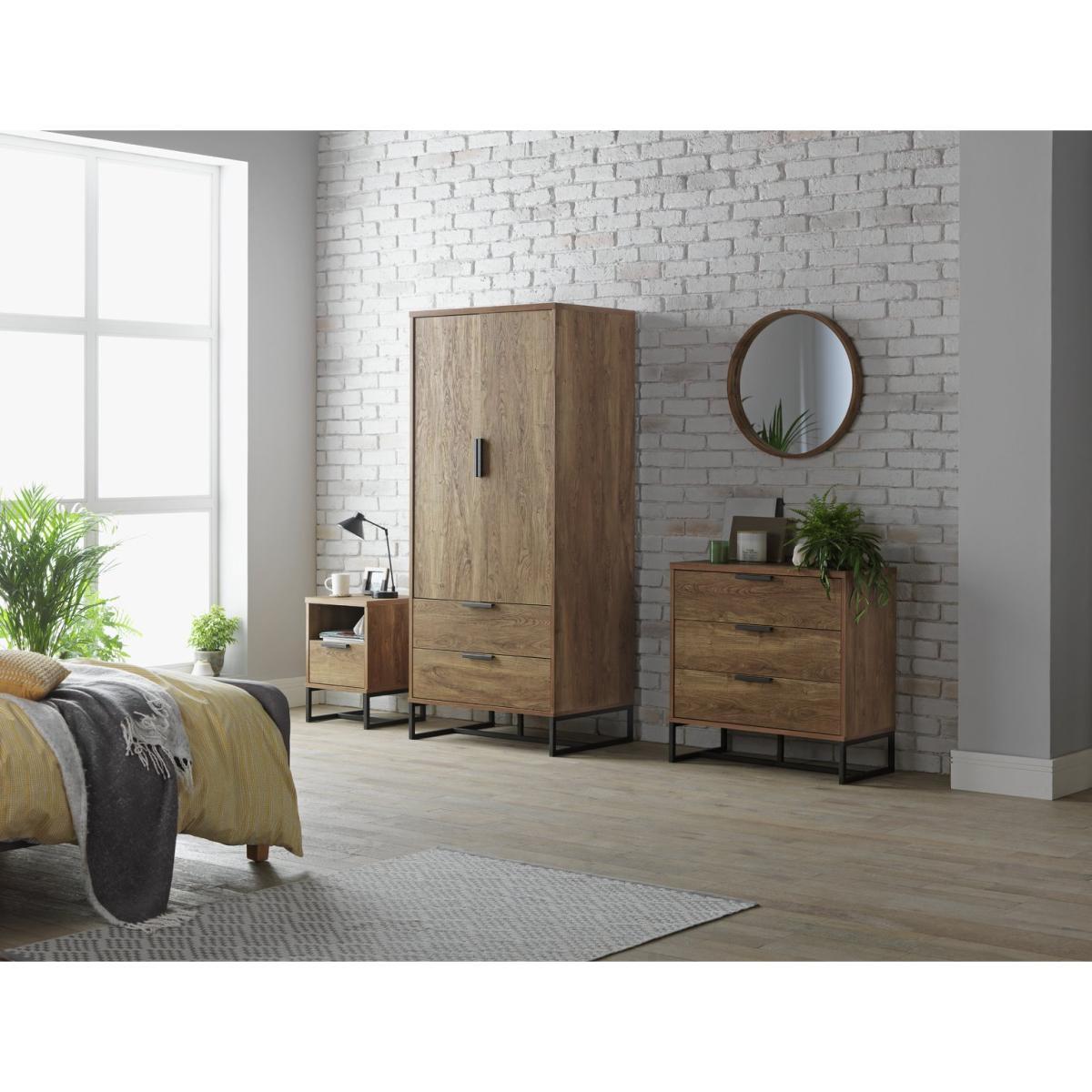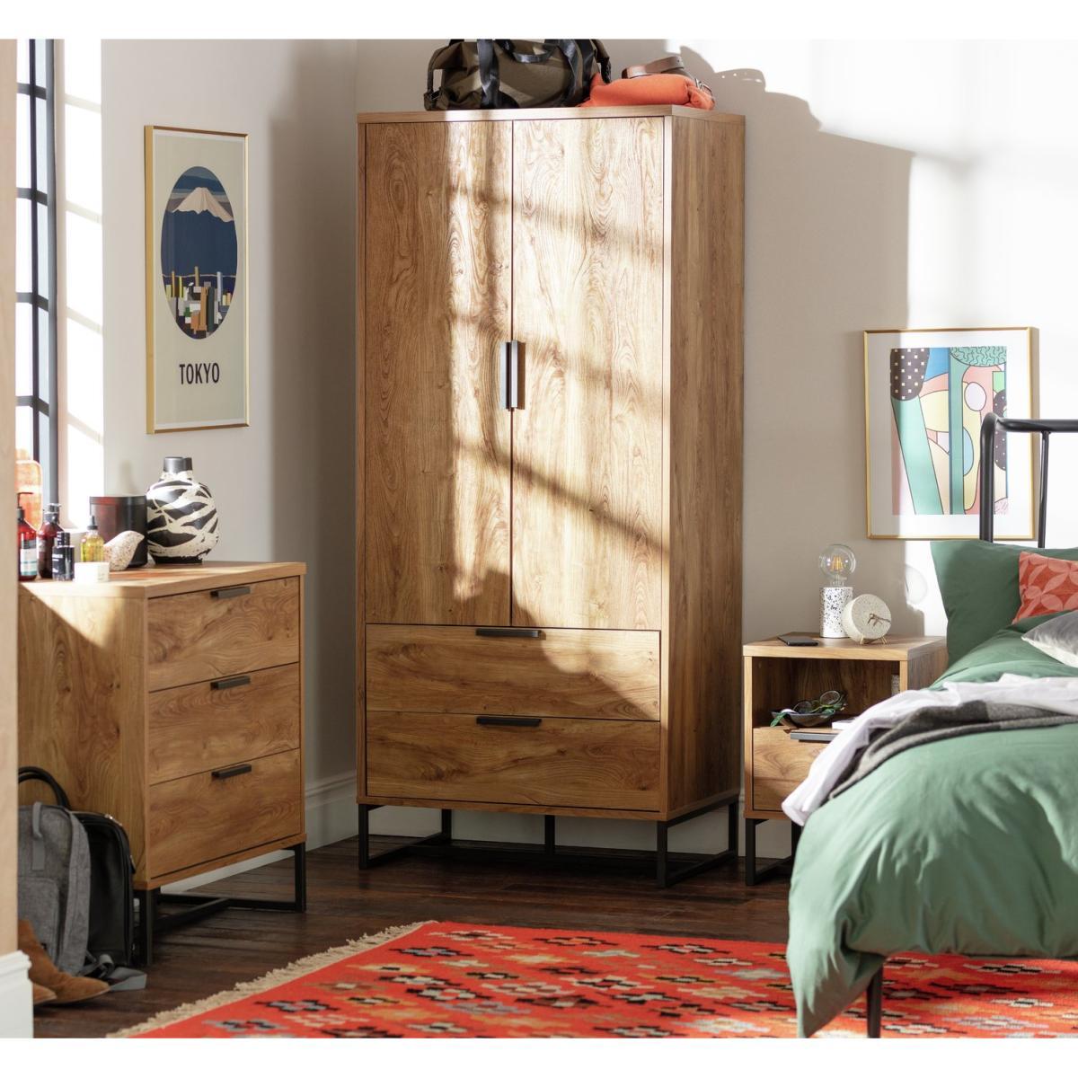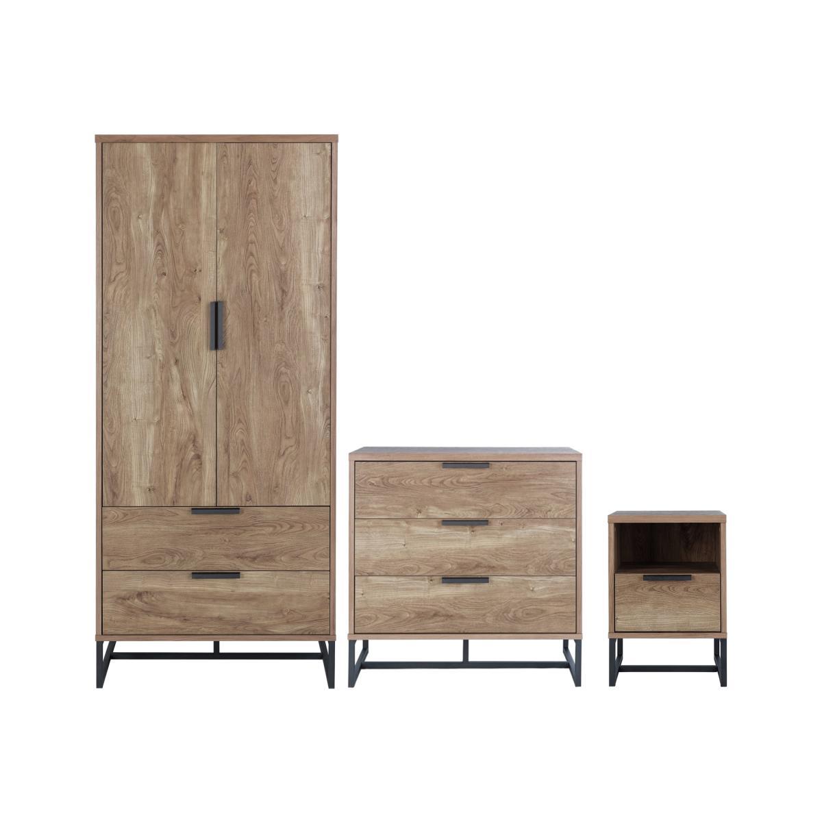 Industrial heritage with to die-for looks. Our bedroom set evokes loft living and authentic industrial styling with metal accents and an oak-effect finish. It comprises a fabulous 2-door drawer wardrobe, 3 door chest and a really chic bedside table. Plenty of storage space, all in one cool, modern look. The handles are all dark metal for that industrial edge and the drawers open easily on smooth metal runners. With plenty of hanging and folding space you can keep your room uncluttered and minimal, just as the look should be.