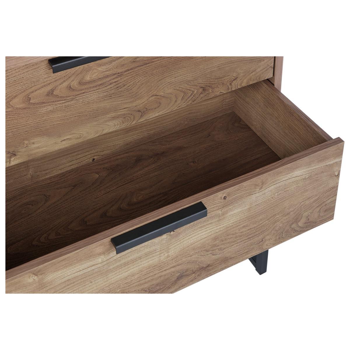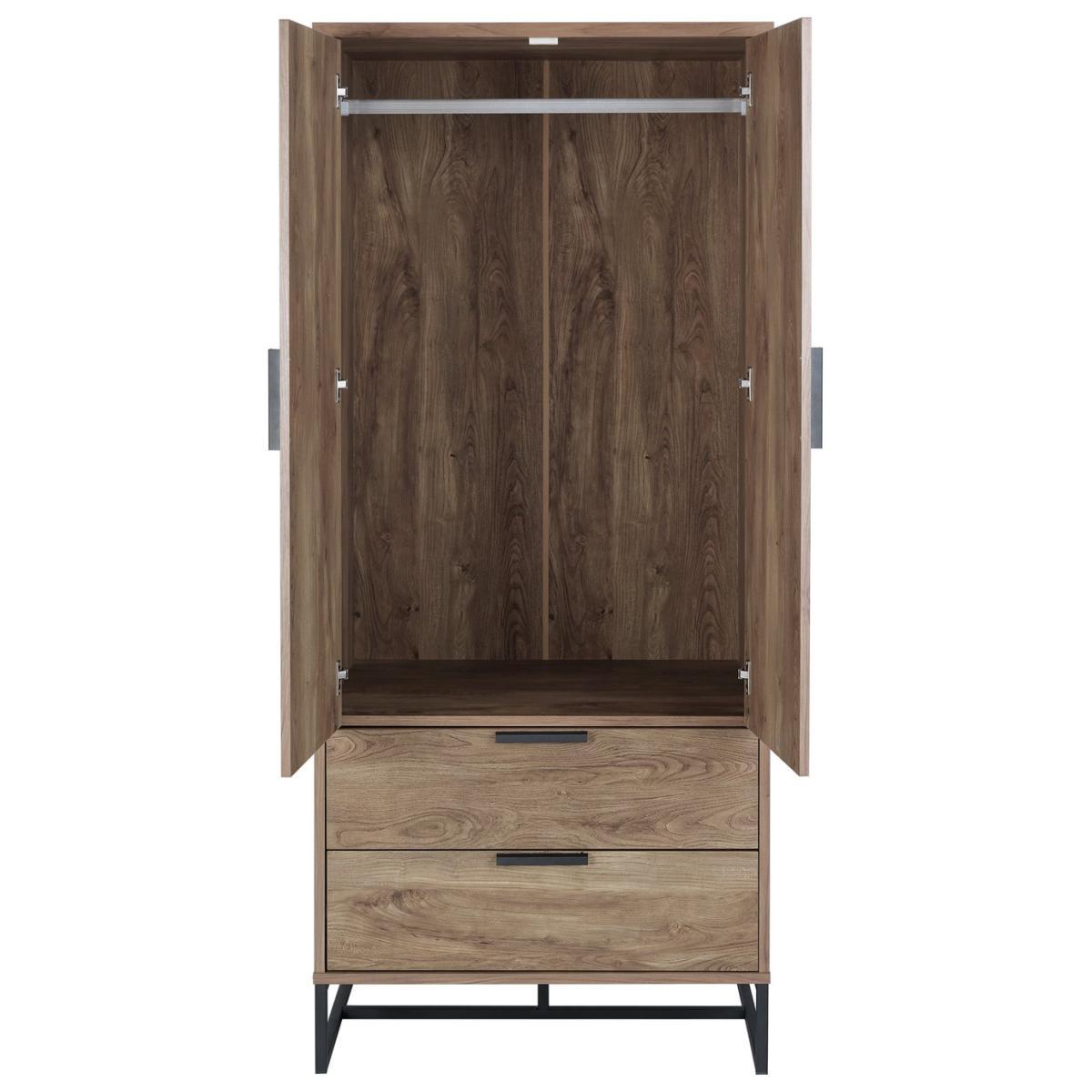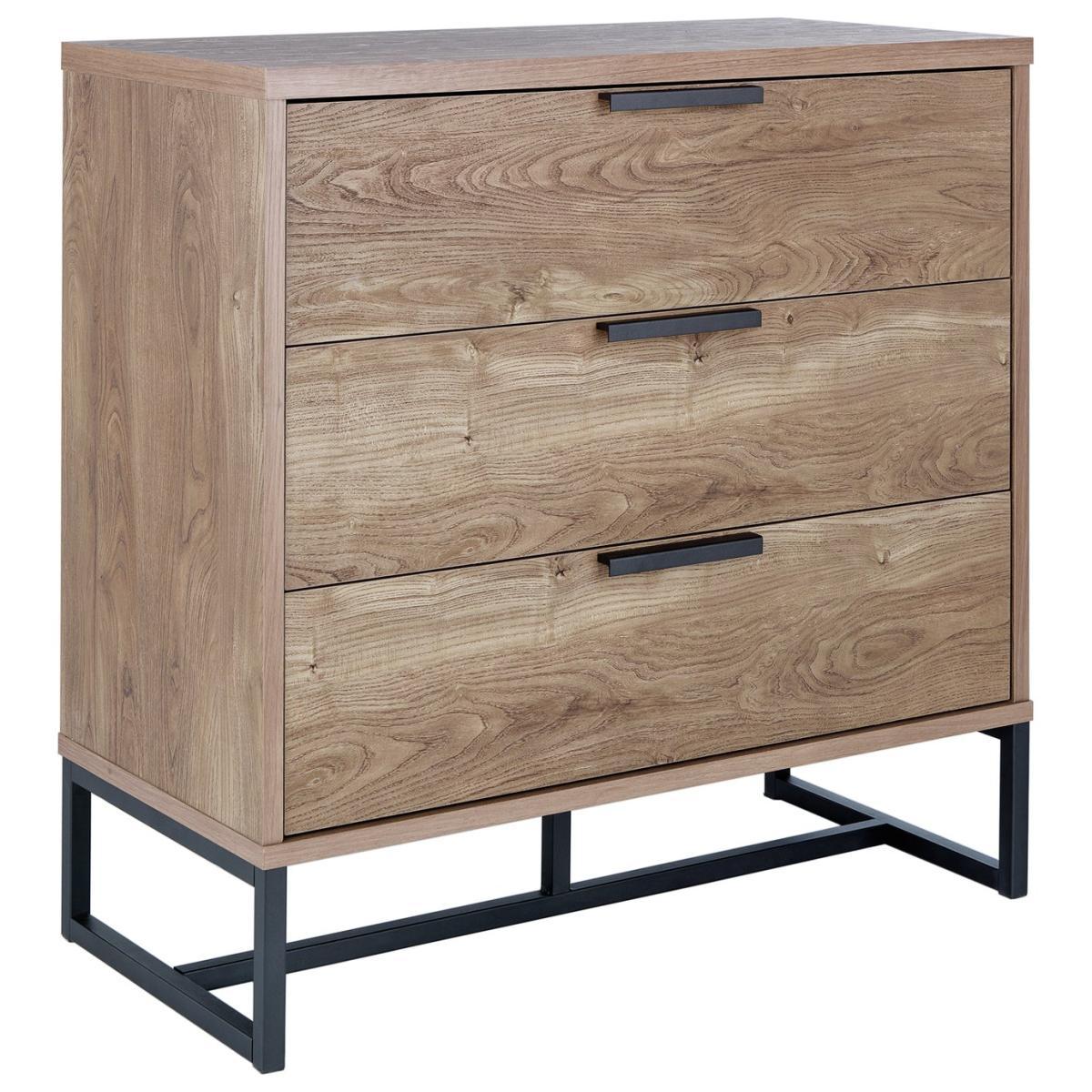 Industrial heritage with to die-for looks. Our bedroom set evokes loft living and authentic industrial styling with metal accents and an oak-effect finish. It comprises a fabulous 2-door drawer wardrobe, 3 door chest and a really chic bedside table. Plenty of storage space, all in one cool, modern look. The handles are all dark metal for that industrial edge and the drawers open easily on smooth metal runners. With plenty of hanging and folding space you can keep your room uncluttered and minimal, just as the look should be.
