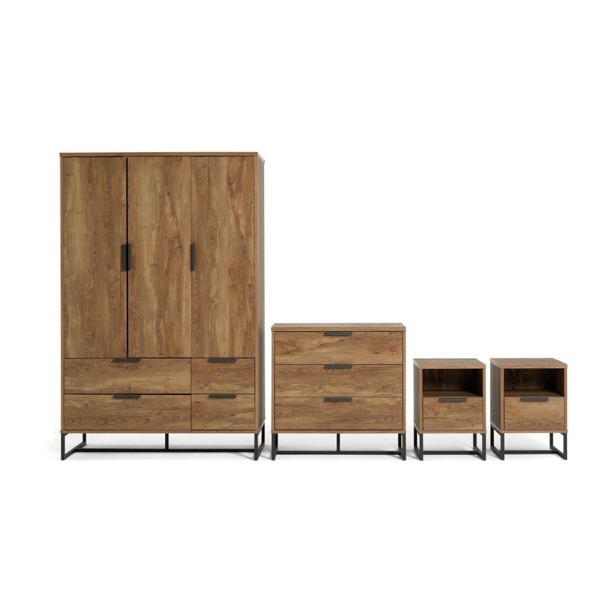 Industrial heritage with to die-for looks. Our bedroom set evokes loft living and authentic industrial styling with metal accents and an oak-effect finish. It comprises a fabulous 2-door drawer wardrobe, 3 door chest and a pair of really chic bedside tables. Plenty of storage space, all in one cool, modern look. The handles are all dark metal for that industrial edge and the drawers open easily on smooth metal runners. With plenty of hanging and folding space you can keep your room uncluttered and minimal, just as the look should be.