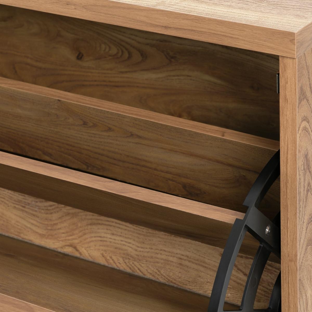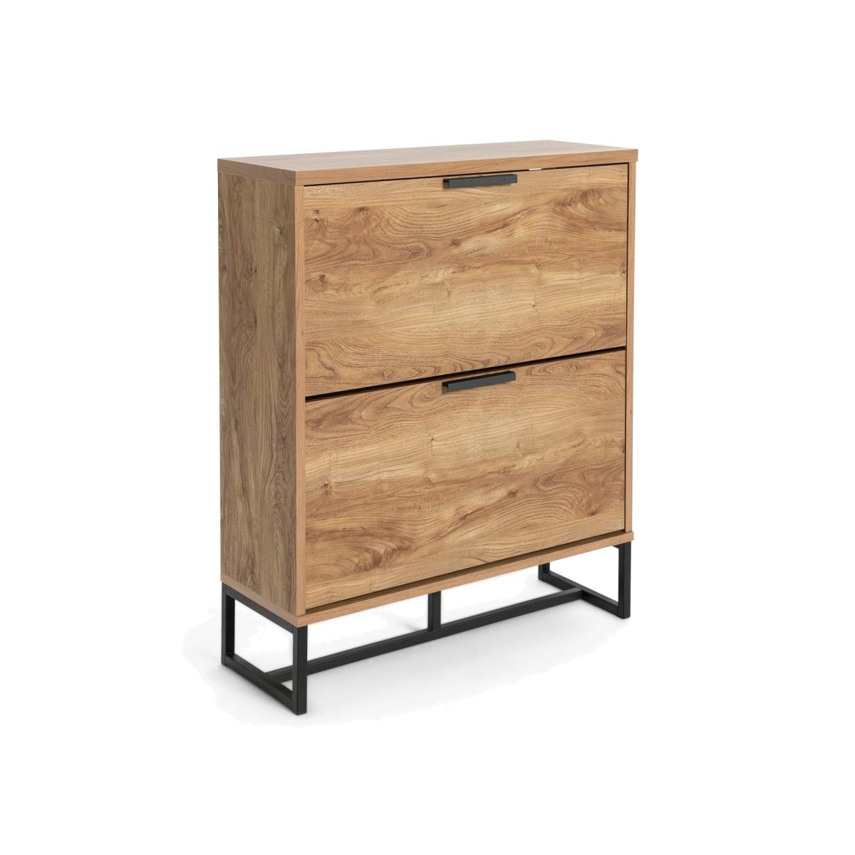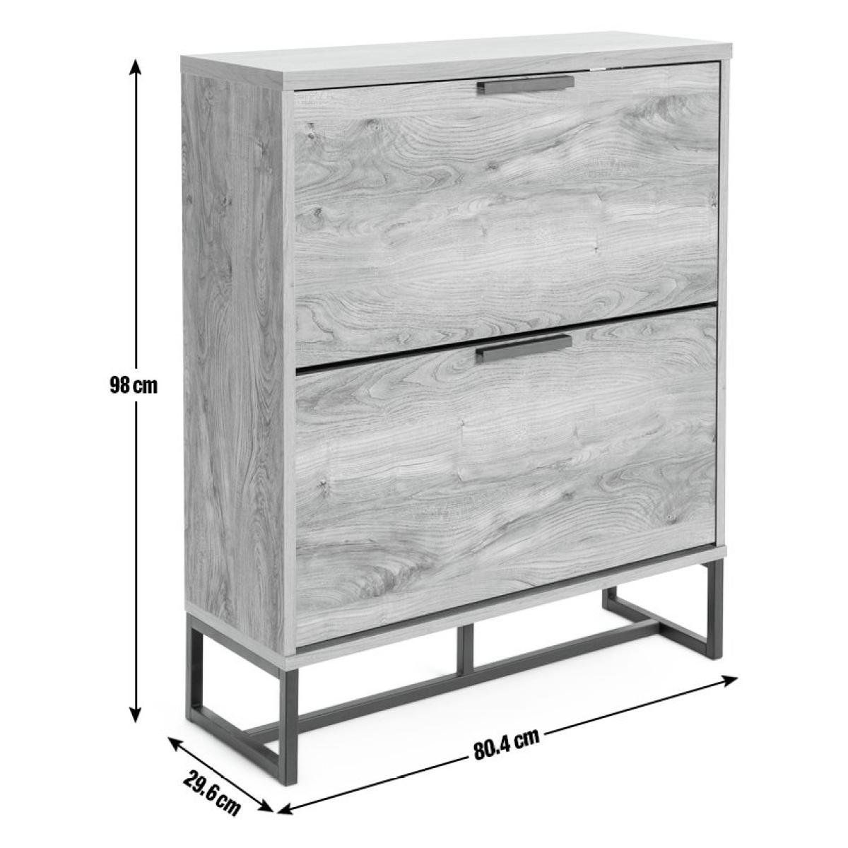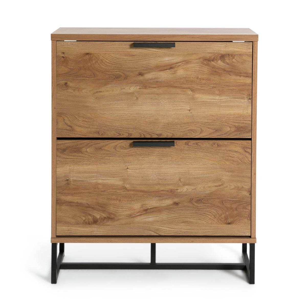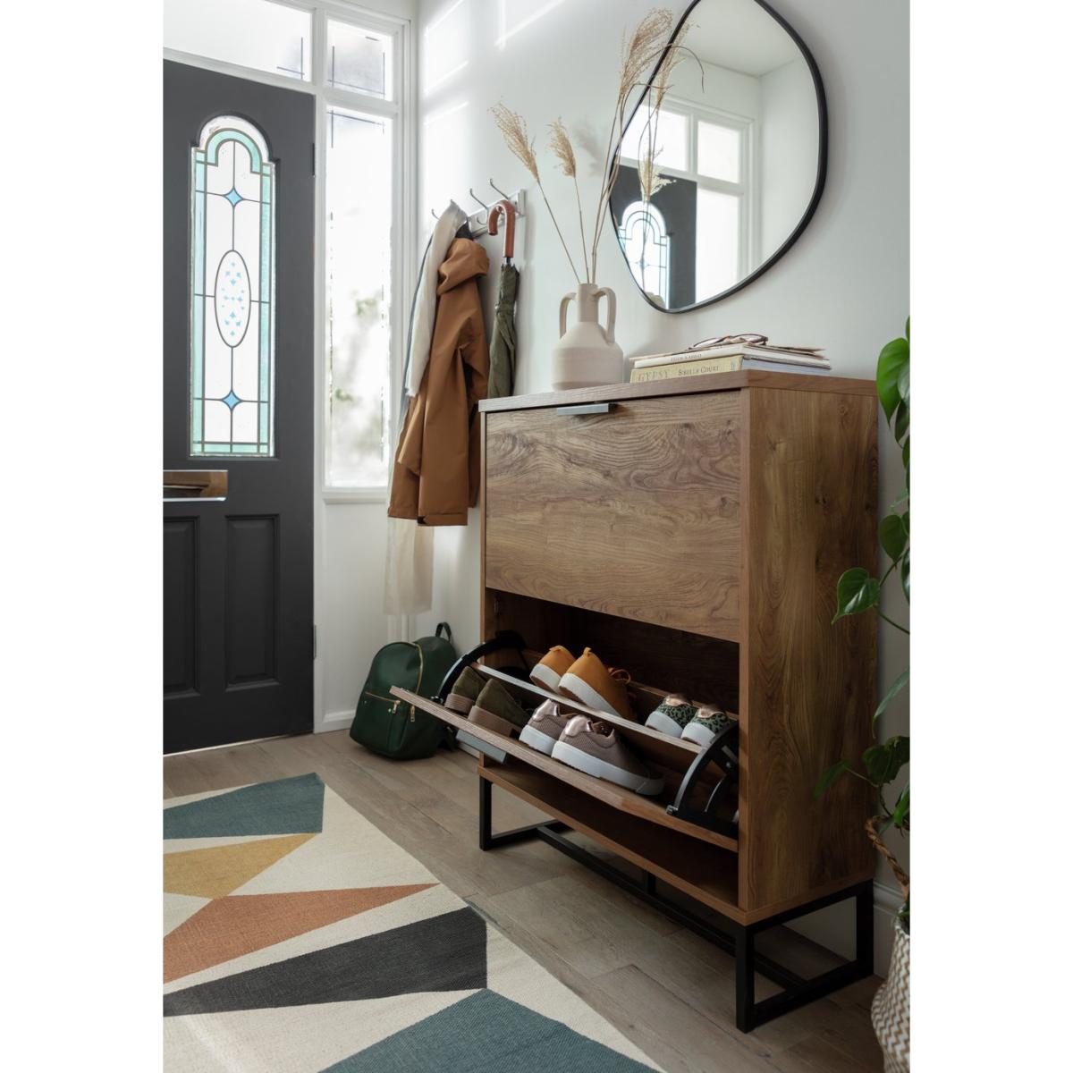 A space saving, shoe storing, stunner. With its metal accents and oak effect finish, our streamlined Nomad shoe storage unit offers authentic industrial styling. Behind the 2 pull down doors are 4 fixed shelves that will easily fit 12 pairs of footwear. So, plenty of space to pile in sneakers, sandals, dress shoes and more. A cool way to unclutter a hallway. Love the Nomad industrial style? Then wander around our other Nomad furniture and see what catches your eye. Part of the Nomad collection. Made from wood effect and particleboard with a wood effect finish. Size H98, W80.4, D29.6cm. Weight 27kg. Stores an average of 12 pairs of shoes. Maximum shoe size 10. 4 fixed shelves. Packed flat. If this product is over 60cm high it must be securely attached to the wall to prevent overturning. Package Dimensions: Package 1 dimensions: H24.5, W88.1, D40cm. Package 1 weight: 29kg. General Information: We are excited to be welcoming some of our favourite HOME products into the Habitat range. Your product may arrive in Habitat or HOME packaging.