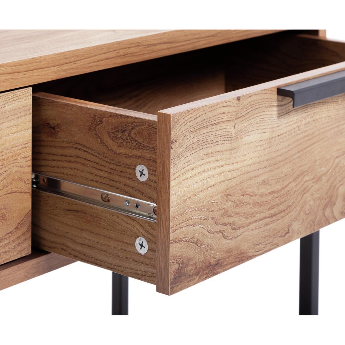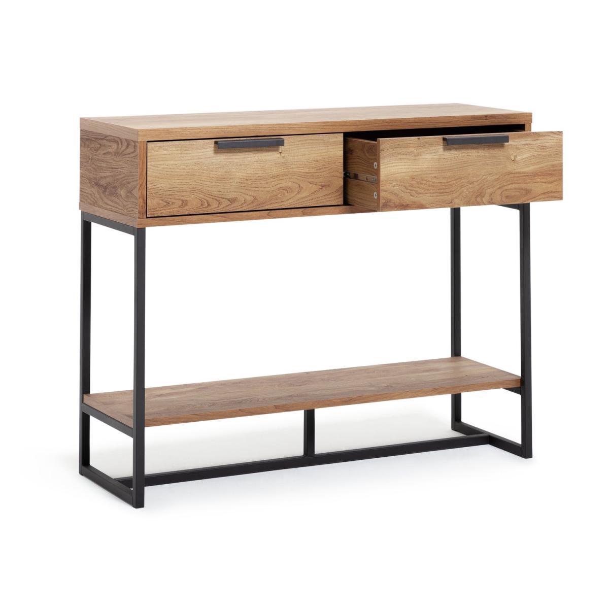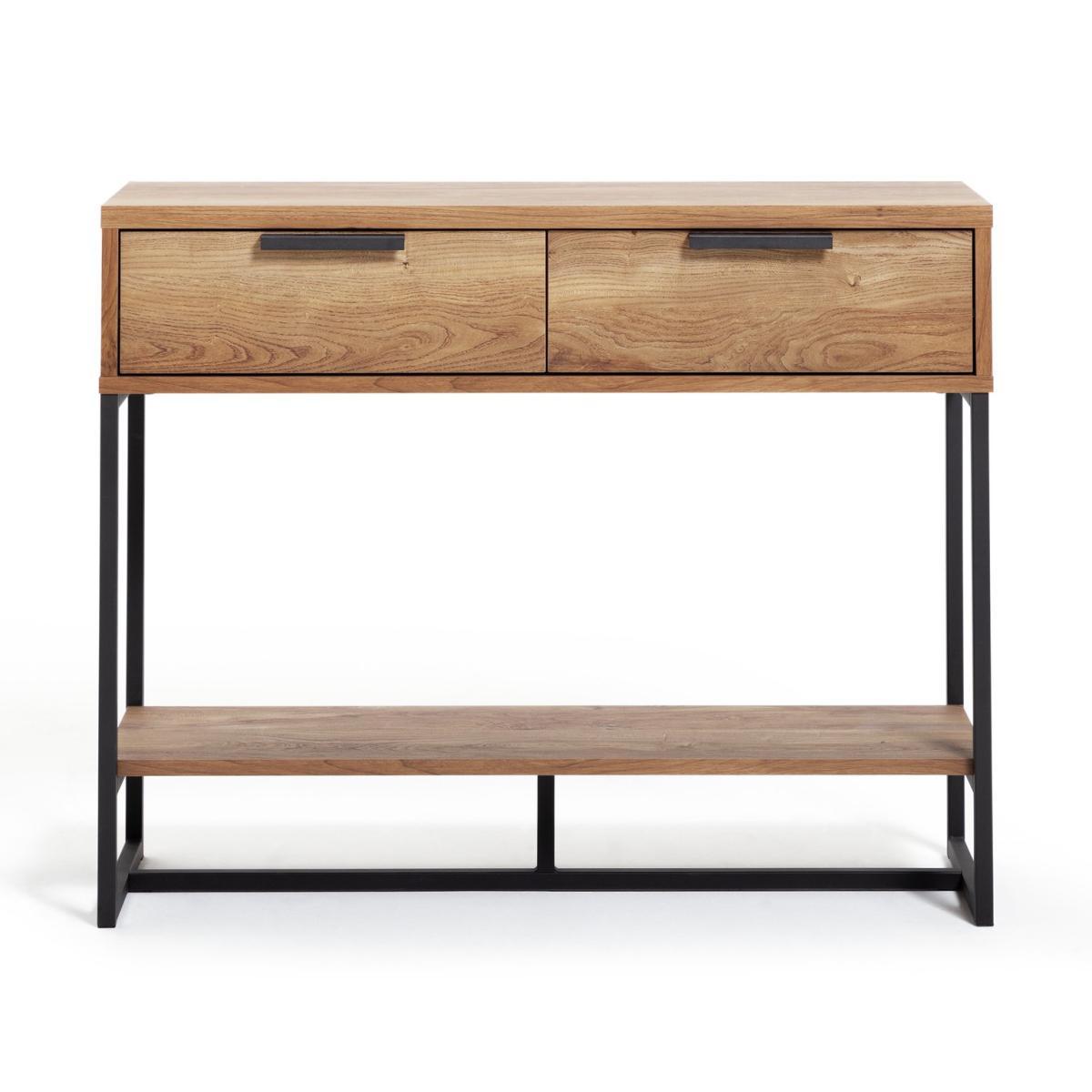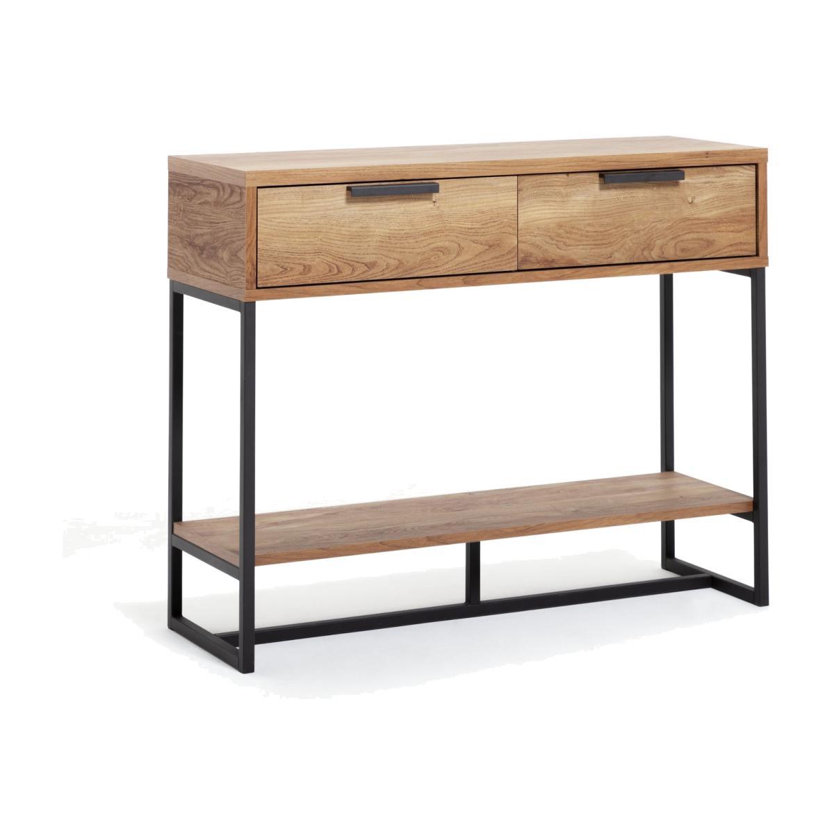 Here's a console table that's bang on trend – combining industrial-look black metal legs with rustic oak wood-effect storage. It's sure to enhance the look of any room. Beautifully slim, this console will look great in hallways, behind a sofa or as a slimline occasional table where space is tight. Two drawers with black metal handles open effortlessly on runners and provide extra storage for odds and ends. Style the bottom shelf with decorative boxes, books and oversized vases. You'll love the look. Like this? Then you'll love matching furniture pieces from our Nomad collection. Part of the Nomad collection. Size H 80, W 100, D 34.2cm. Made from wood effect and particleboard with a wood effect finish.2 drawers with metal runners. 1 undershelf. Weight 30.5kg. Self-assembly - 2 people recommended. Maximum load weight 50kg. Package Dimensions: Package 1 dimensions: H19.8, W110.8, D37.7cm. Package 1 weight: 32kg. General information:Manufacturer's 1 year guarantee.