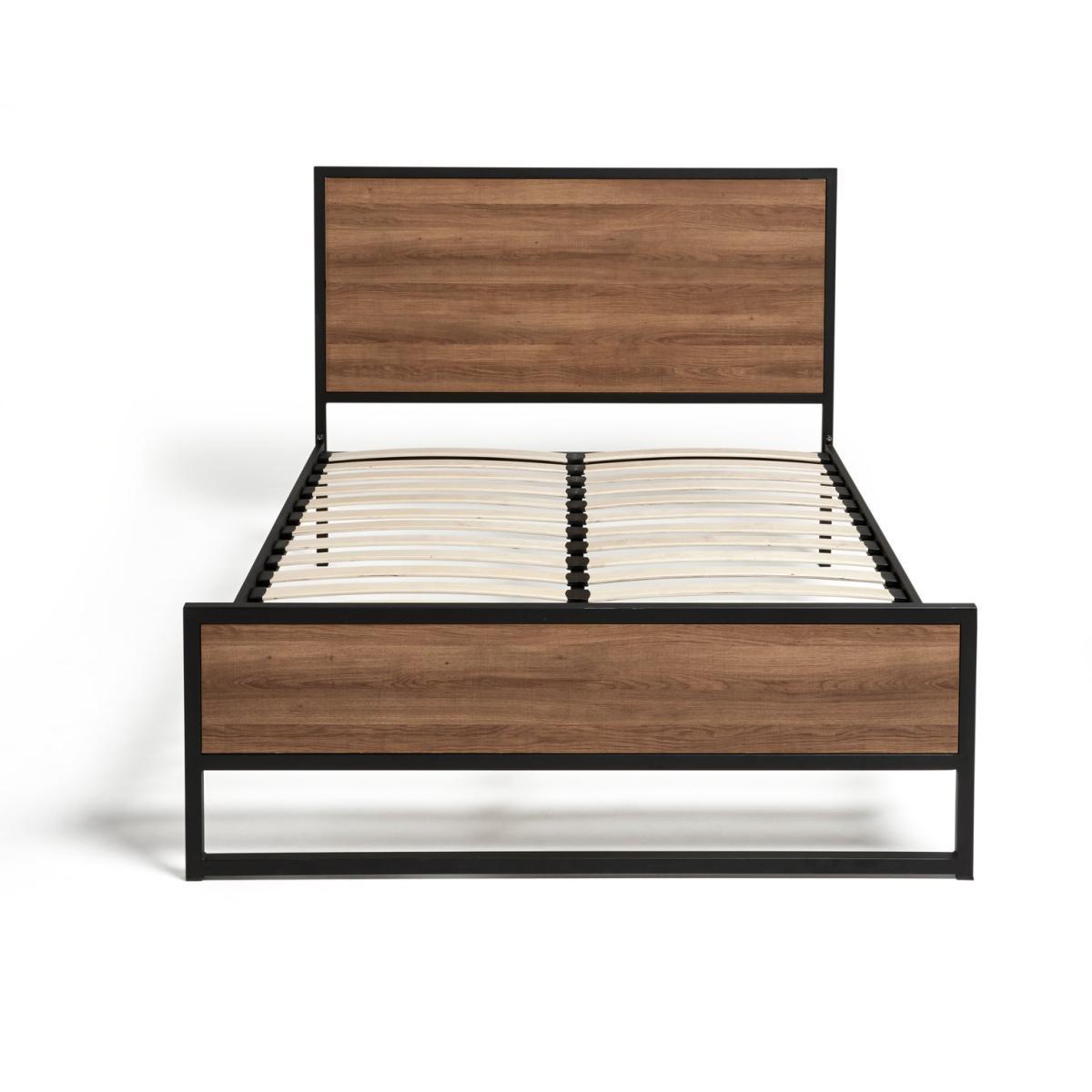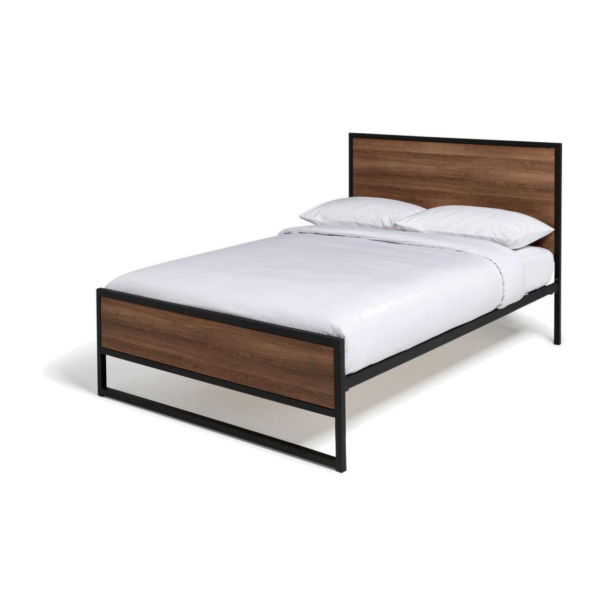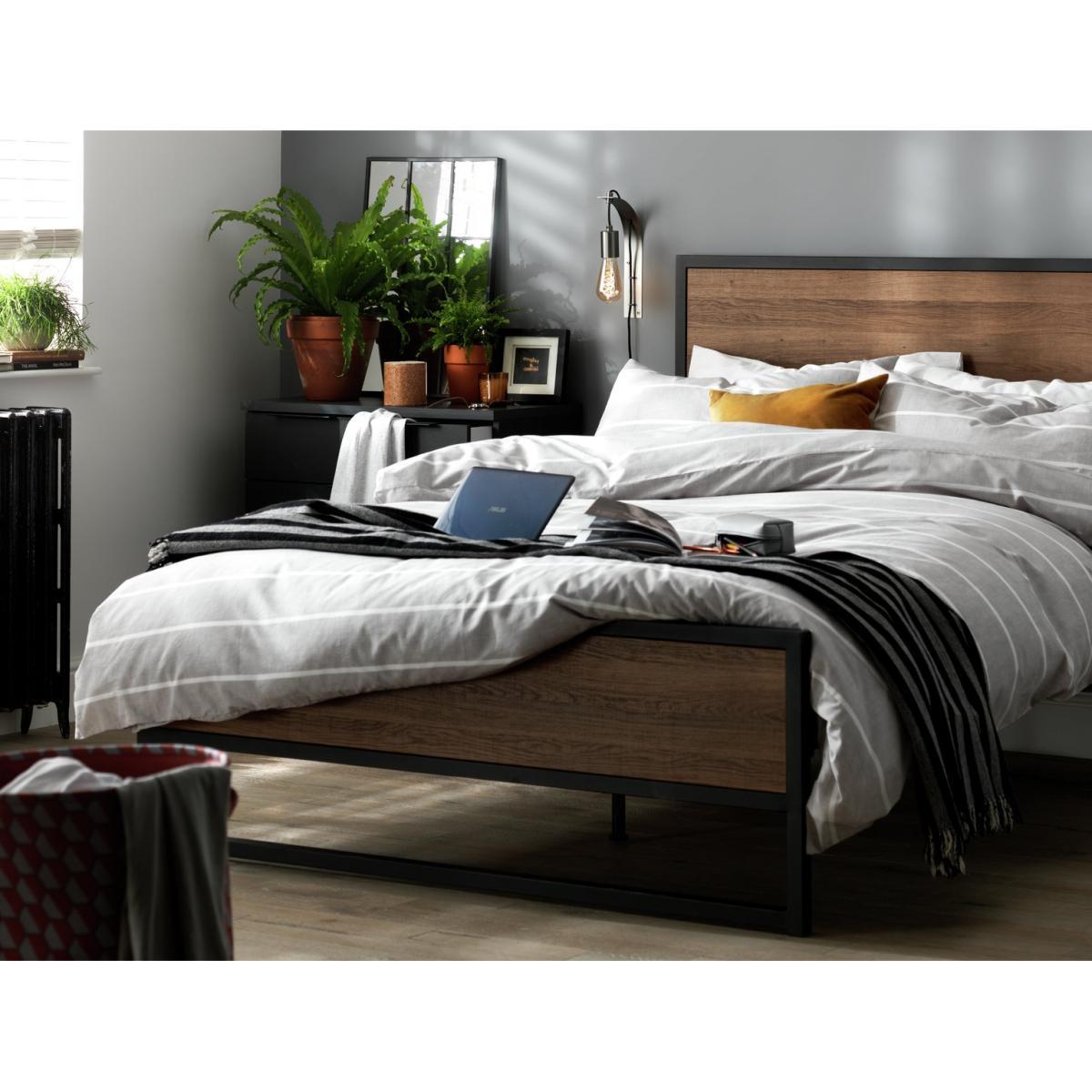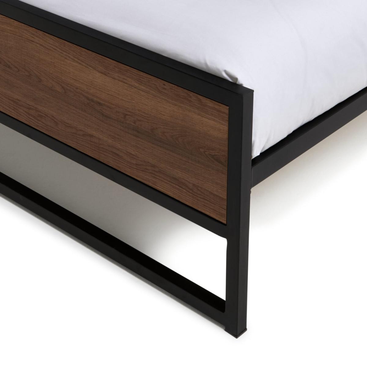 Live the dream. Our uber cool, loft apartment-style bed has designer industrial chic in bundles. With a classic and functional look, it is crafted in long lasting modern materials. Metal and rich wood veneer effect make a stunning double bedframe combo. A wooden slatted base both supports and provides healthy ventilation for your mattress. Very hip.