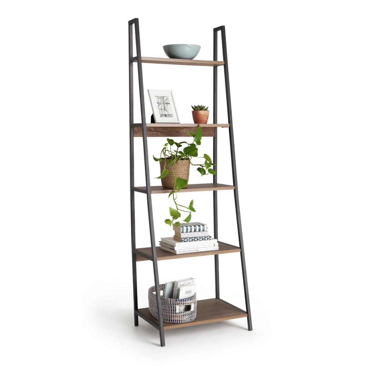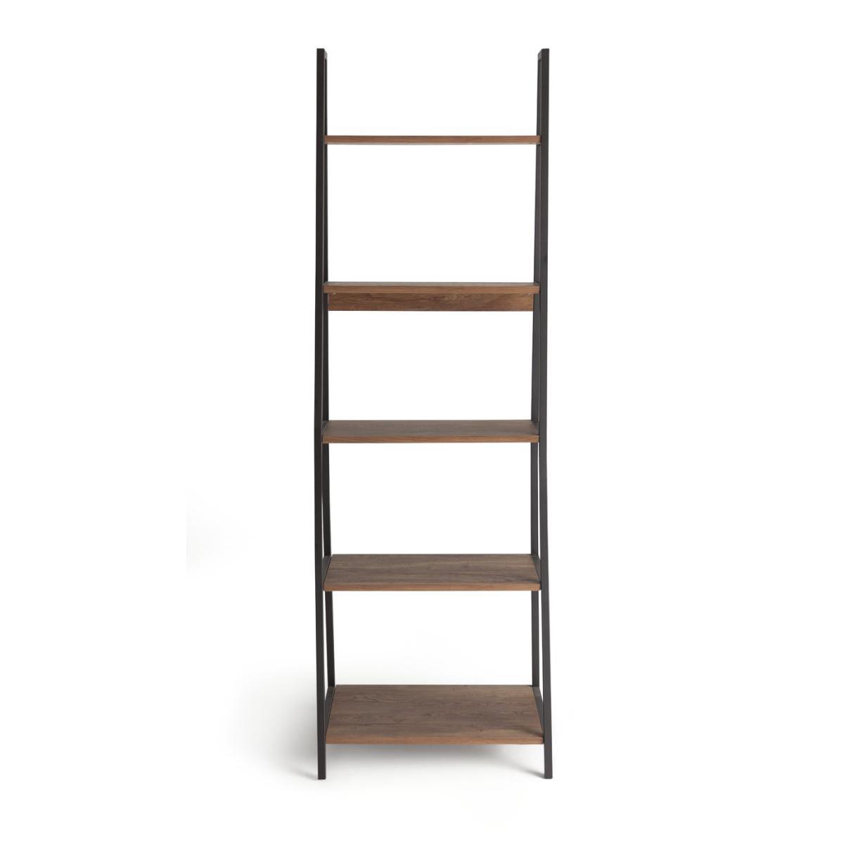 Tap into industrial chic. The Habitat Nomad leaning shelf's mix of metal framework and rich wood-effect finish stuns. Get your living space in order. There are 5 shelves on this open and airy design. They offer the perfect spot to show off your favourite trinkets or books. Effortlessly cool.