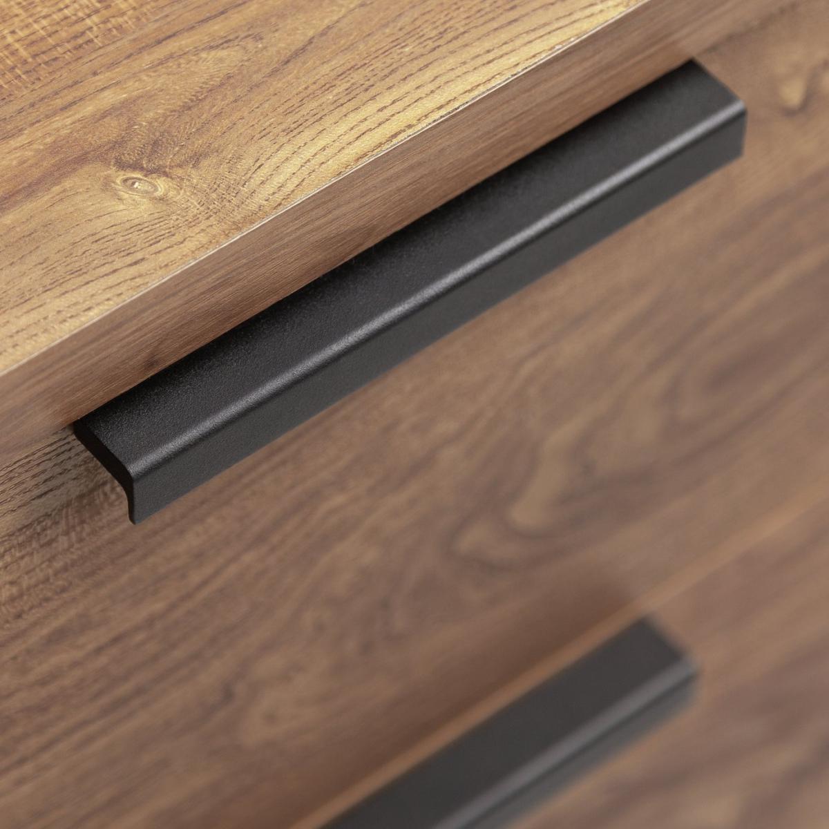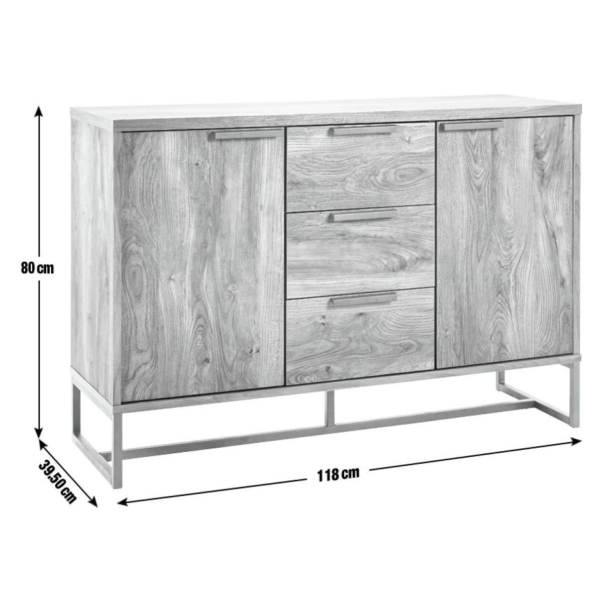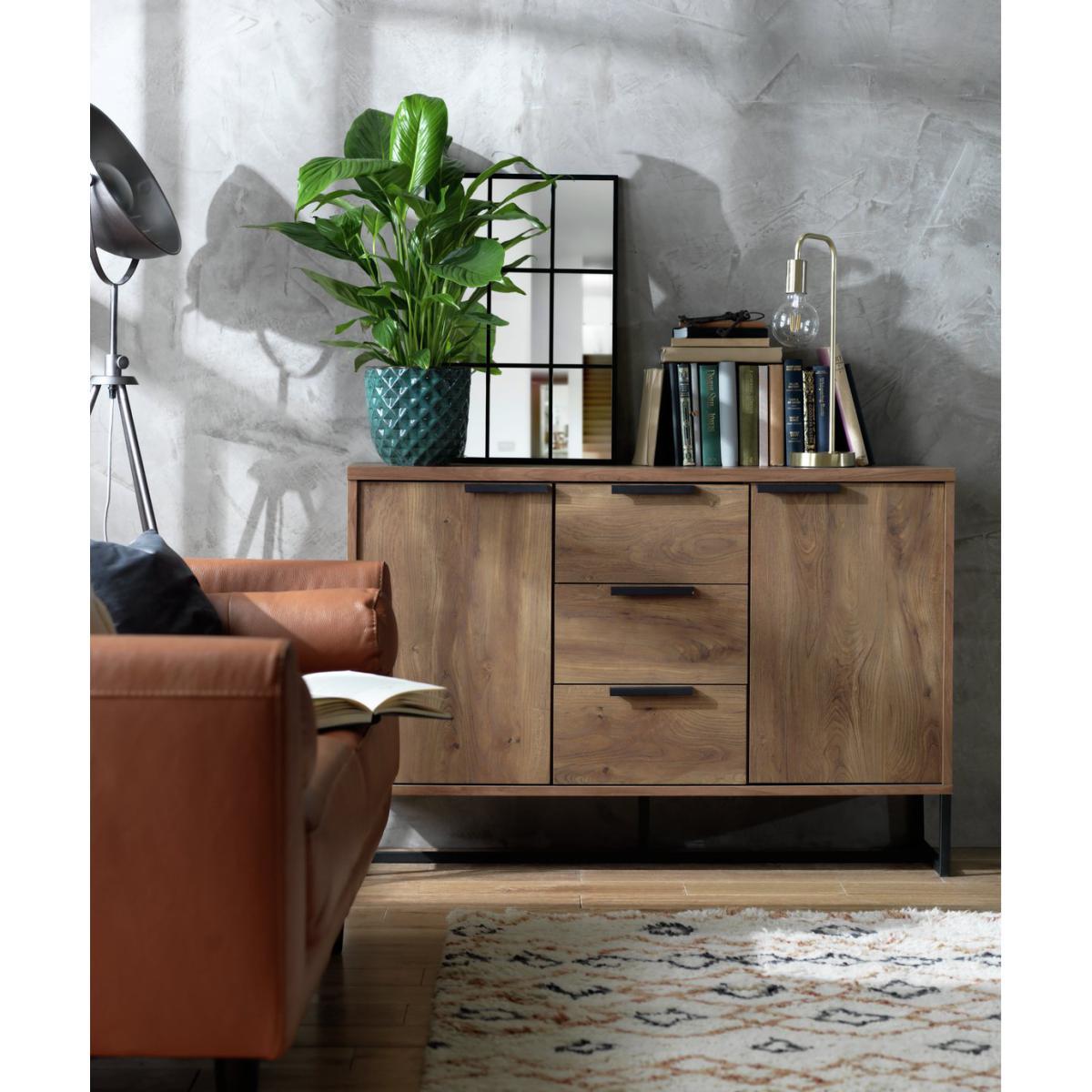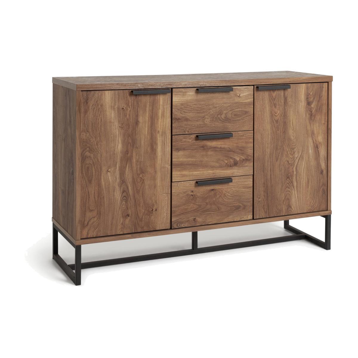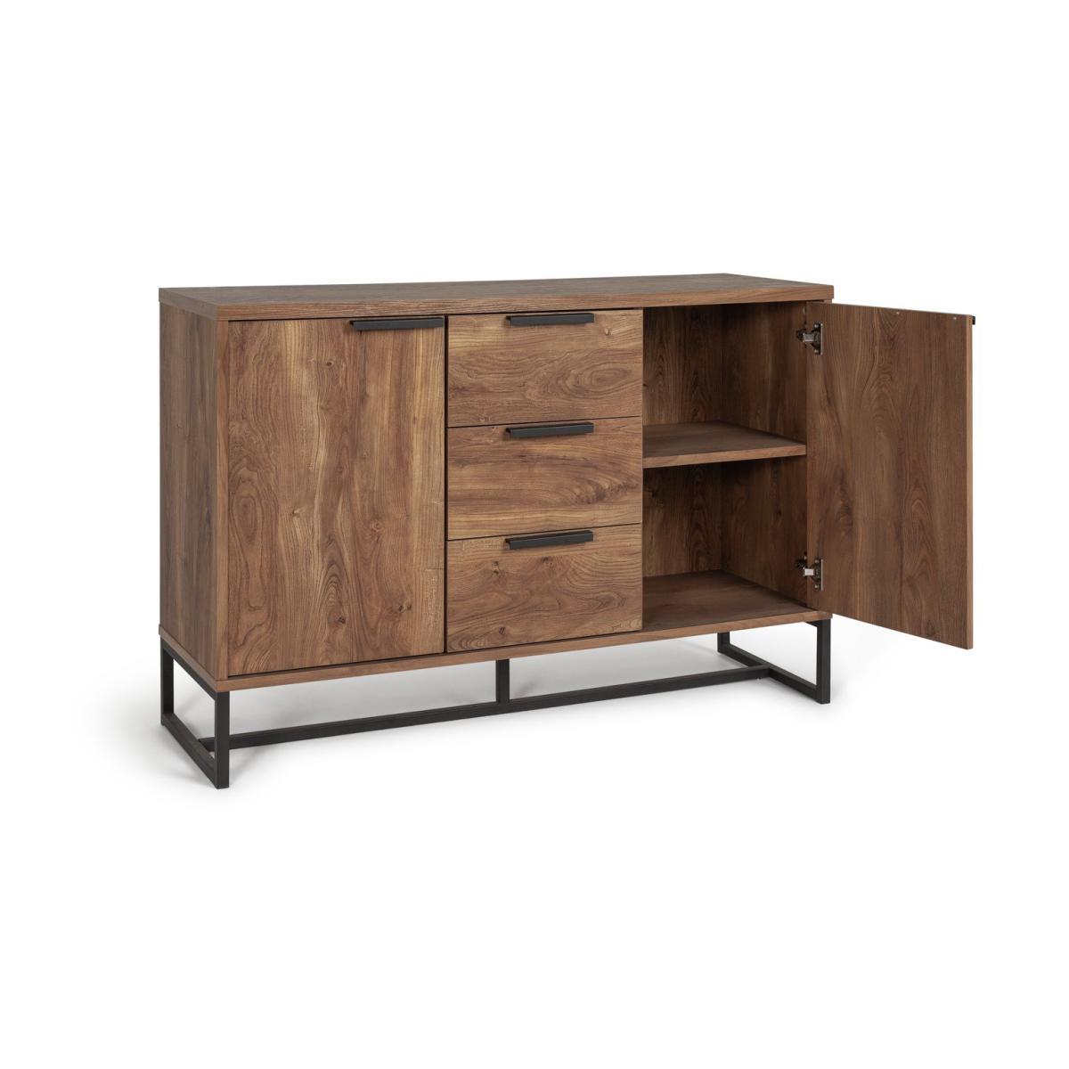 Tap into industrial chic. The Habitat Nomad display sideboard's mix of metal framework and rich wood-effect finish stuns. Get your living space in order. The top surface offers the perfect spot for your favourite family photos and treasured keepsakes. Say goodbye to clutter with the 3 drawers - perfect for tucking away your lounge bits and bobs. Even more storage can be found with the 2 side cupboards.