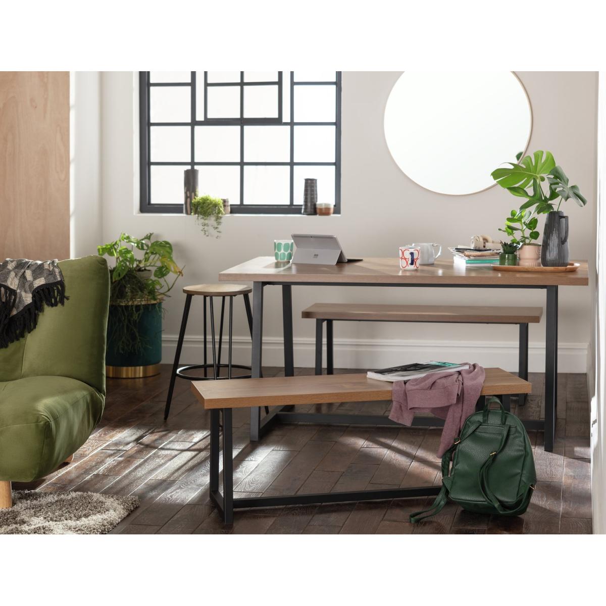 Dish up a dose of industrial chic. The pair of Habitat Nomad dining benches are strong and stylish. For casual, laid-back dining, the whole family can squeeze round your dining table, catch up and chow down. They easily tuck underneath when not in use, ensuring your dining set doesn't take up too much space in your home. Or why not use them as standalone pieces without a dining table? They make great additional seating for your home. The perfect pair. Part of the Nomad collection. Chair: Size H45.5, W120, D30cm. Seat height 45cm. Metal frame with metal legs. 2 benches. Bench made from metal frame. Wood effect seat pad. Self-assembly - 1 person recommended. Max user weight per chair 130kg. Individual chair weight 33.2kg. Dust or wipe with a damp cloth only. Package Dimensions: Chair package size: H16.8, W143, D48cm. General information: Manufacturer's 1 year guarantee. FSC certified meaning the materials used for this product are responsibly sourced.