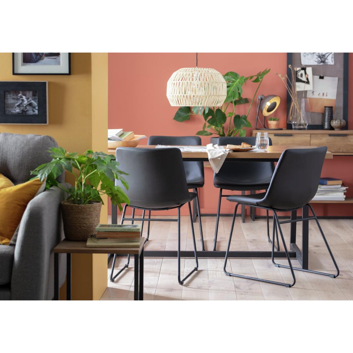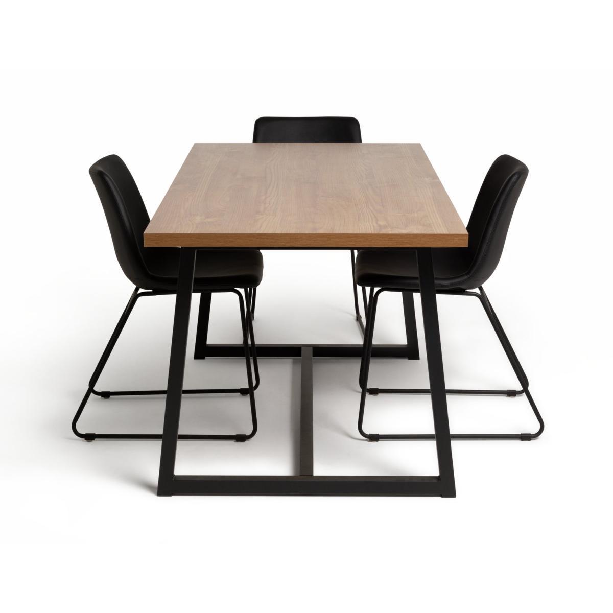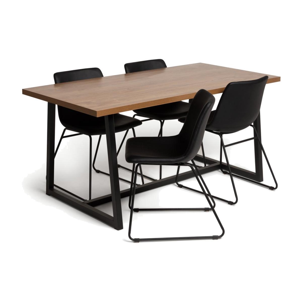 People round for dinner, nab yourself a winner. Our dining table and 4 matching chairs look expensive, but guess what? This oak wood effect table and luxury feel black chairs are a handsome sight. A clever blend of modern and traditional. Looks at home in a contemporary setting. Or just as inviting amongst classic decor. The table's solid metal legs are designed for your guests' comfort. As are the chairs. Soft seat pads have the look and feel of leather, without the upkeep. So, comfy, good looking and practical. We said it was a winner.