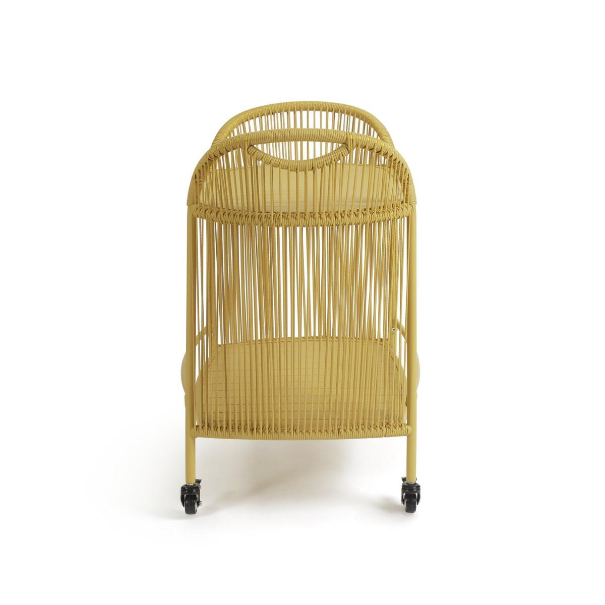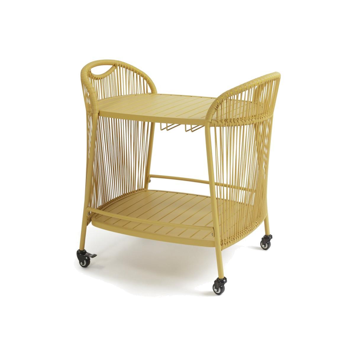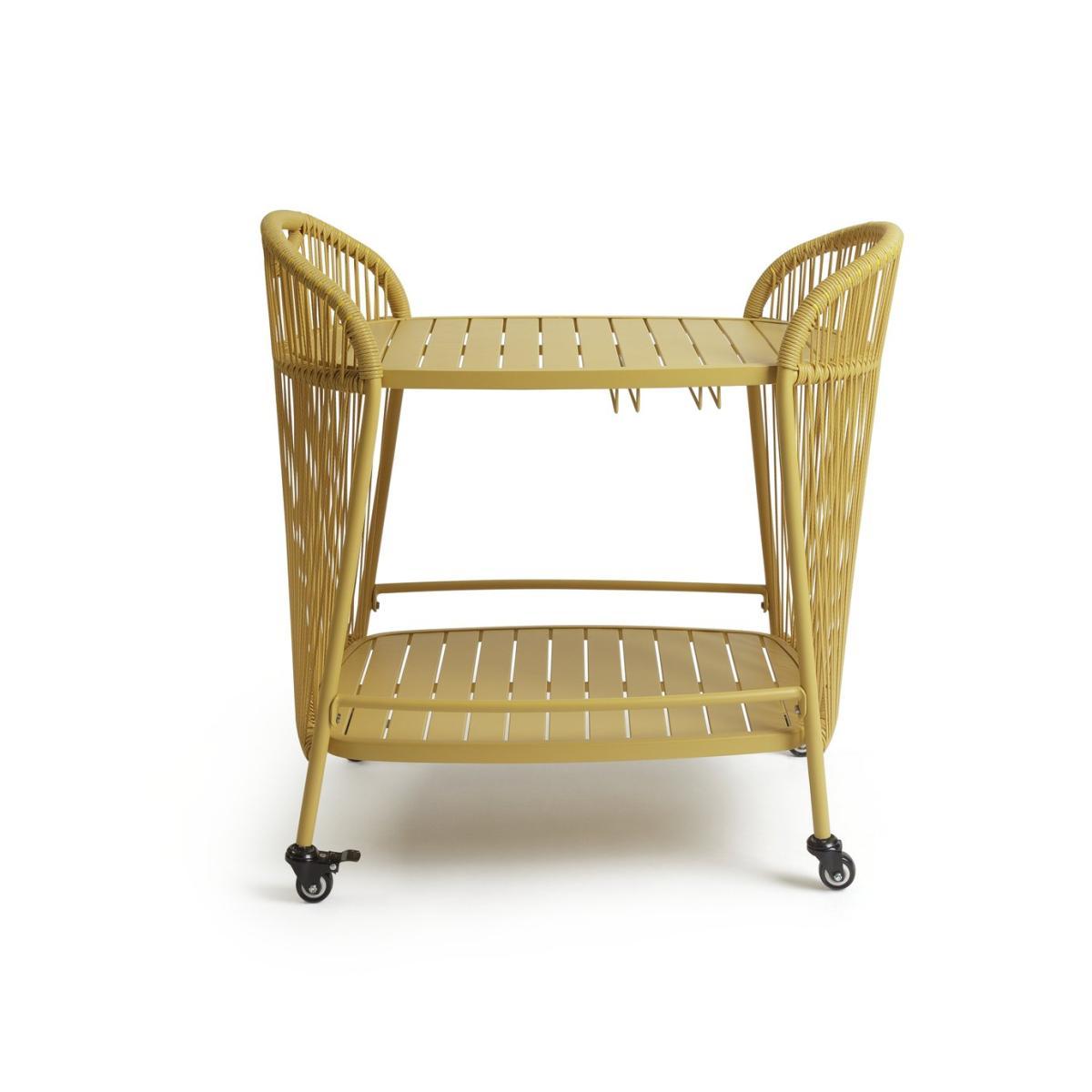 Ta dah! So Scandi and such fun. A nifty little trolley to carry drinks and nibbles from the kitchen to your guests wherever they are. Chilling in the garden or mingling in the house. Just load up and push. Handy right? A handwoven, rattan curtain in sunny yellow encloses two wide shelves, one slatted and one glass. Wine glasses travel safely in the integral rail. And, when it's time to serve drinks from the trolley, it's super easy to lock two of the castors in place. Get ready, get set, go all out to impress.