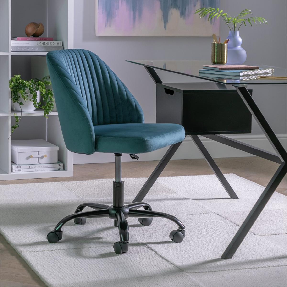 Go on, give us a twirl Nori. Love that fluted backrest, gently supportive sides and velvety finish. What a superb swiveling seat you are. Firm but comfy, with a height adjustable lever, and easy-roll coasters. With luxe looks too, the office job's yours. Part of the Nori collection. Metal frame with velvet seatpad and velvet backrest. Swivel. Mounted on castors for easy mobility. Self-assembly. Dimensions: Overall maximum chair size H87.5, W48, D57cm. Seat height adjustable from 42.5 to 54.5cm. Seat height 54.5cm. Seat size W48, D44cm. Maximum user weight tested for 110kg. Weight 7.6kg. Packaged dimensions: Package size H56, W32, D58cm. General information: Manufacturer's 1 year guarantee. FSC certified meaning the materials used for this product are responsibly sourced.