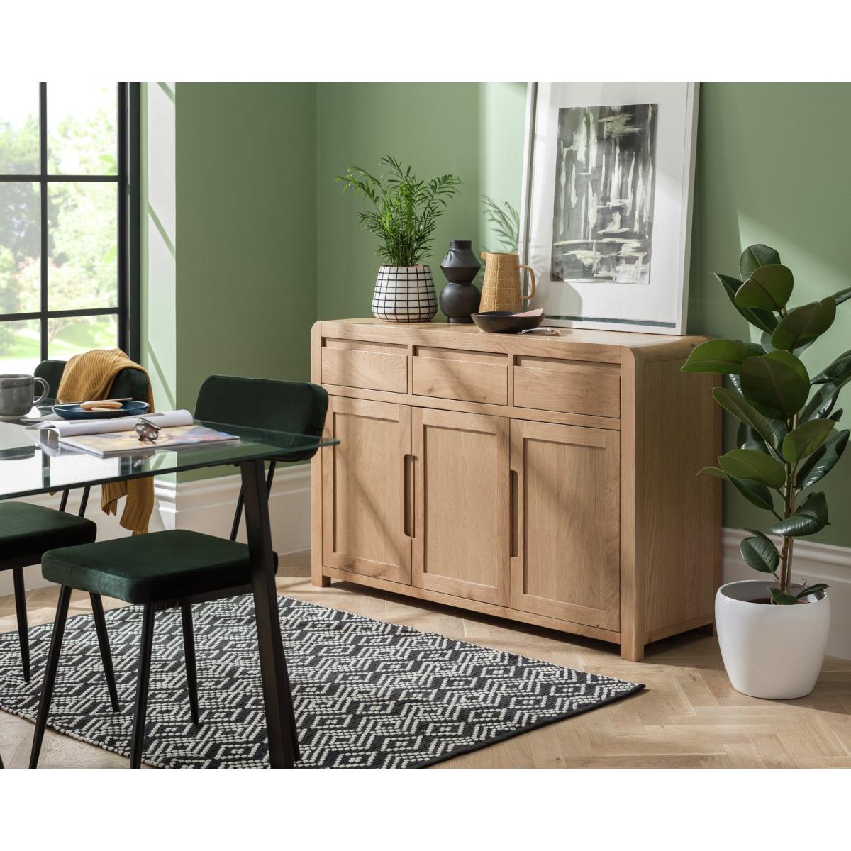I love this sideboard for its clean, natural oak veneer finish, which adds warmth and a hint of Scandinavian minimalism to any room. It works particularly well in contemporary or rustic interiors, but can also complement a more eclectic style when styled with decorative objects or statement accessories. Practical styling tips include using top surface space for decorative lamps, plants, or bowls, while the three drawers and cabinets provide ample storage for tableware, linens, or everyday essentials. Its neutral tone makes it versatile enough to pair with colour-rich or monochrome interiors, making it a flexible and stylish solution for both living and dining areas.