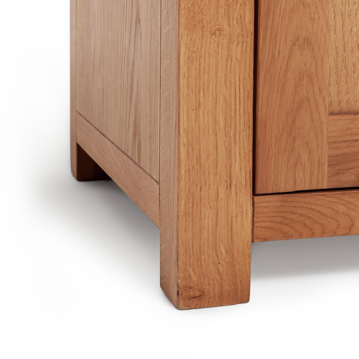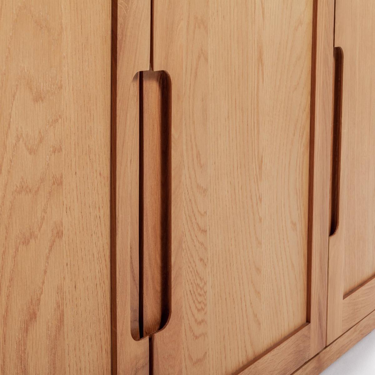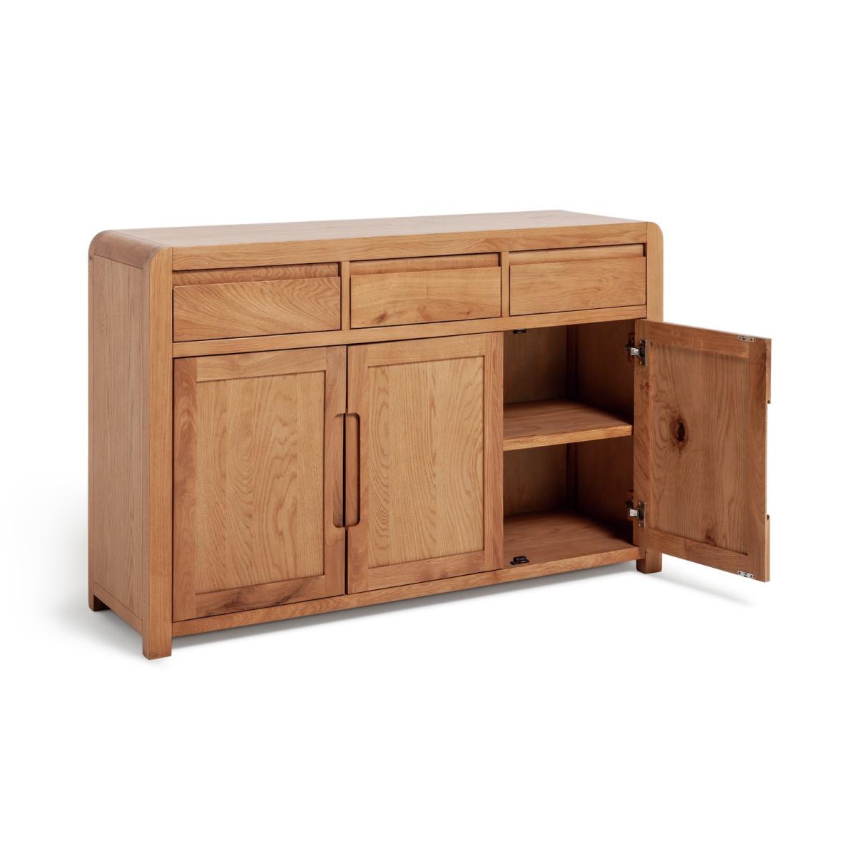 Give your lounge a modern makeover. The Habitat Novara sideboard is crafted from solid oak and oak veneer. This quality desk features smooth, curved edges and cut-out handles for a sleek, streamlined finish. Perfect for keeping clutter at bay, it has 3 drawers and 2 adjustable shelves inside.