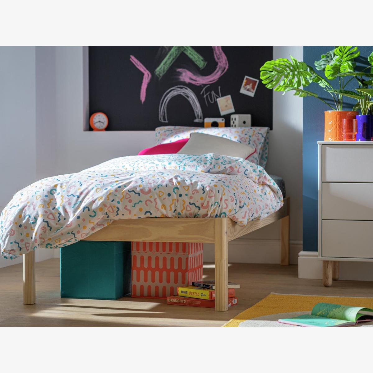 Pining for a comfy modern kids bed? You're in luck. Our Odin platform bed is made from solid pine with a whitewash finish that shows off the wood's natural grain. With its clean lines, it has a no-nonsense Nordic feel. The anti-allergy sprung mattress is supportive with enough squidge-ability to aid a good night's sleep. And it rests on wooden slates, so that's good to know. Smart, simple and streamlined.