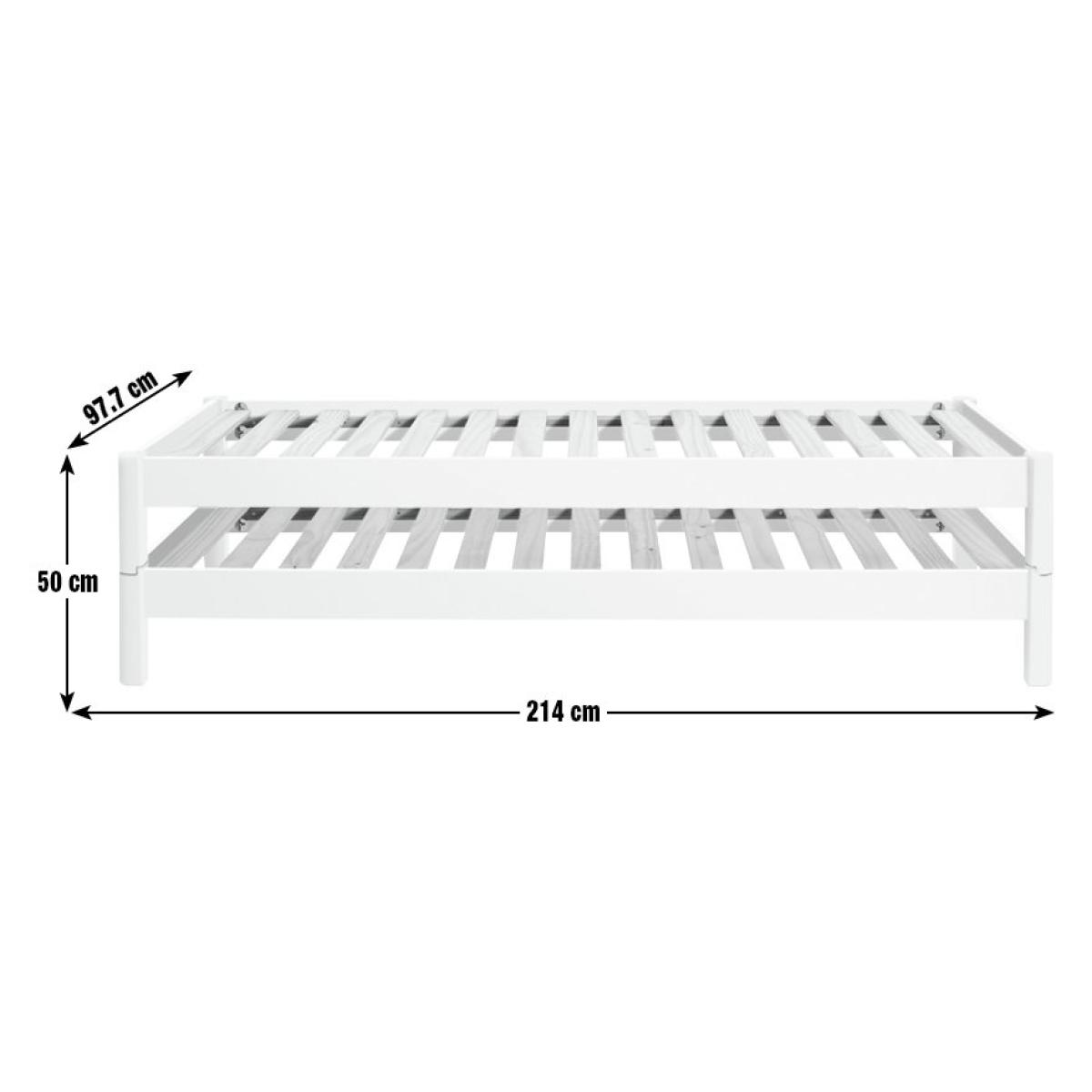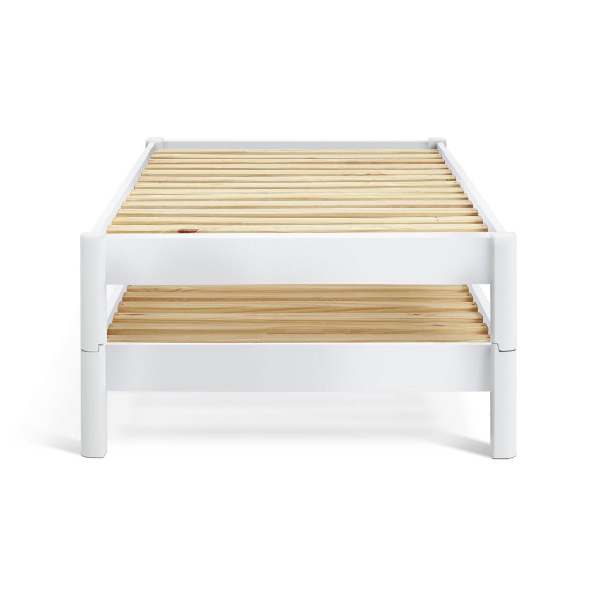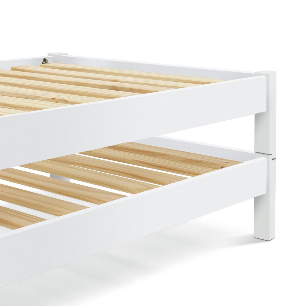 Spontaneous sleepover? No problem. Odin is made from 2 solid pine stackable bedframes that fit on top of each other to form one bed. And here's the smart part. When you need a spare, Odin separates into 2 beds. Clever, eh? Both frames have sprung wooden slats for comfortable, healthy support. Height between bottom and top bed once stacked is 19.8cm. Part of the Odin collection. Includes wooden slats. Size W97.7, L214, H50cm. Clearance between floor and underside of bed 14.7cm. For ages 4 years and over. Weight 34.8kg. Packed flat. Fits L190, W90, D10cm size mattress. Mattress not included. Suitable for adult use (safety tested to 100kg). Self assembly: 2 people recommended. FSC certified meaning the materials used for this product are responsibly sourced.