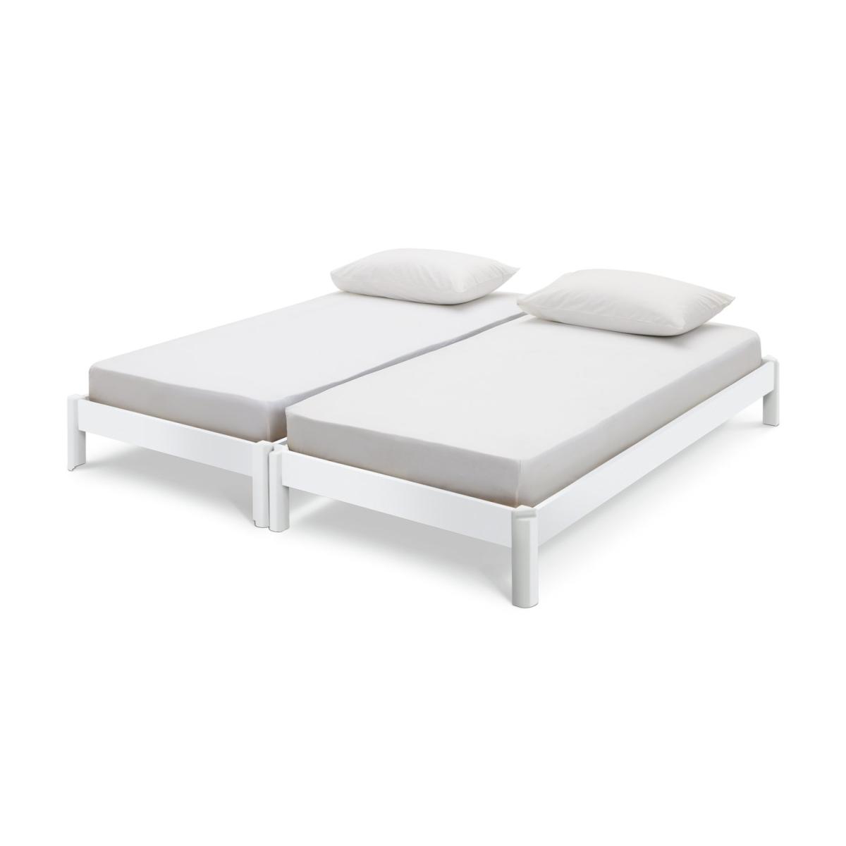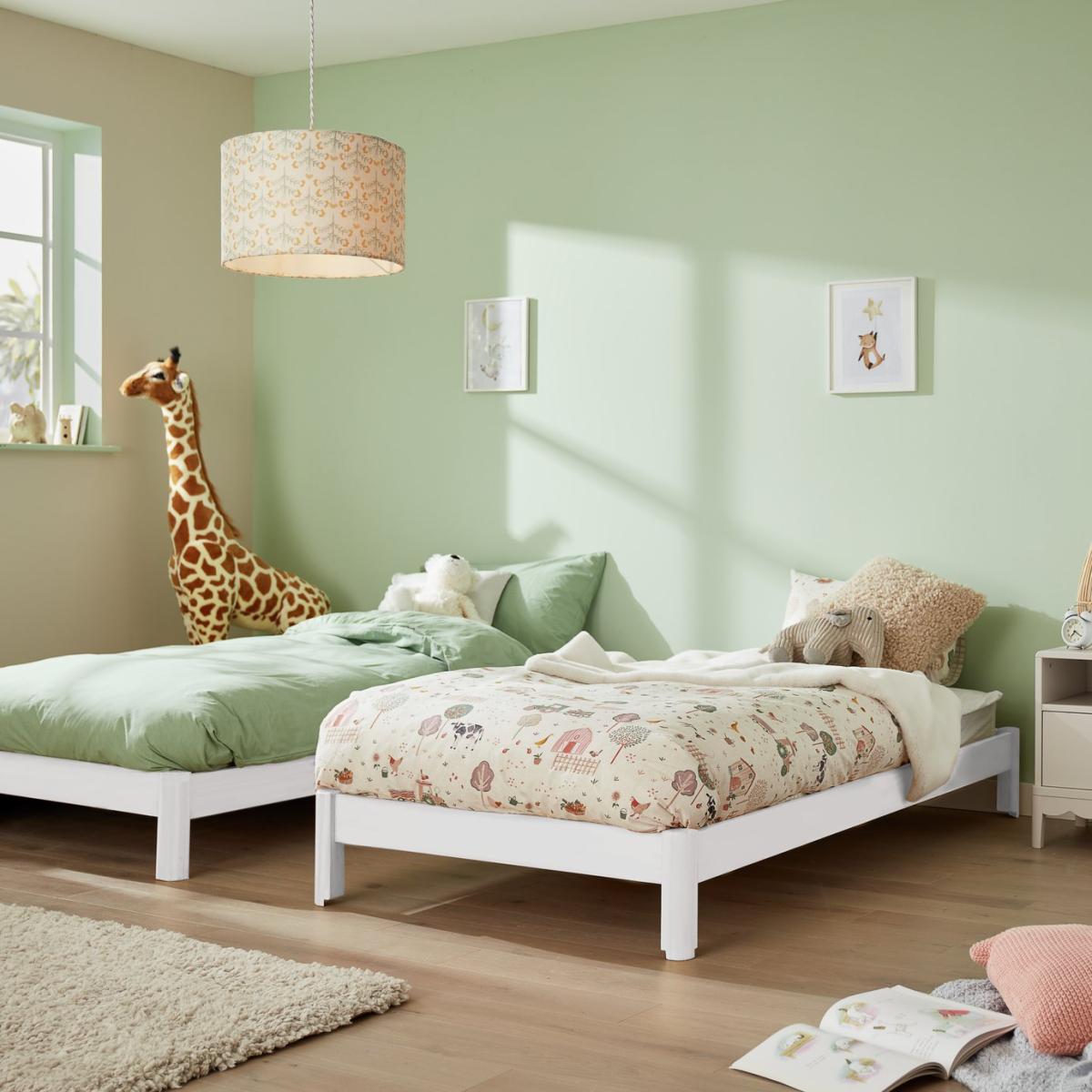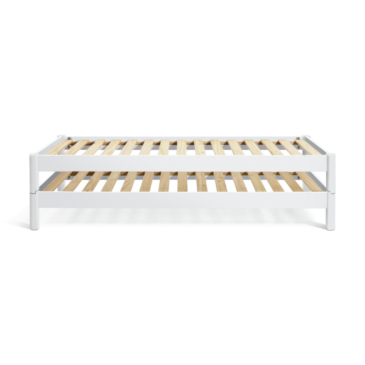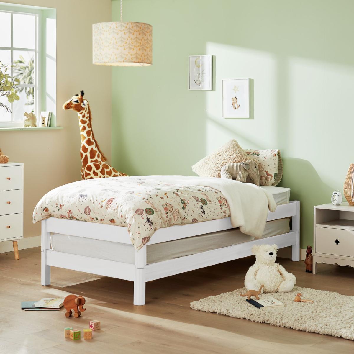Spontaneous sleepover? No problem. Odin is made from 2 solid pine stackable bedframes that fit on top of each other to form one bed. And here's the smart part. When you need a spare, Odin separates into 2 beds. Clever, eh? Both frames have sprung wooden slats for comfortable, healthy support. Height between bottom and top bed once stacked is 19.8cm. Part of the Odin collection. Includes wooden slats. Size W97.7, L214, H50cm. Clearance between floor and underside of bed 14.7cm. For ages 4 years and over. Weight 34.8kg. Packed flat. Fits L190, W90, D10cm size mattress. Mattress not included. Suitable for adult use (safety tested to 100kg). Self assembly: 2 people recommended. FSC certified meaning the materials used for this product are responsibly sourced.