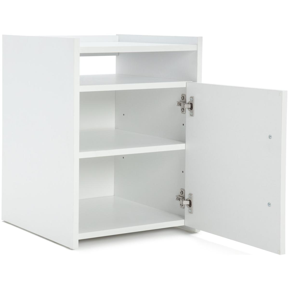Simple, smart, storage. That's our Oldham bedside table. Open the cupboard door to reveal an adjustable shelf and 2 spacious areas for bedtime essentials. And there's a handy open shelf above for your phone, book or other bits and bobs. Pop a lamp or alarm clock on the lipped surface and you're all set. In cool white with slim black handles, it's a neat modern way to get organised.