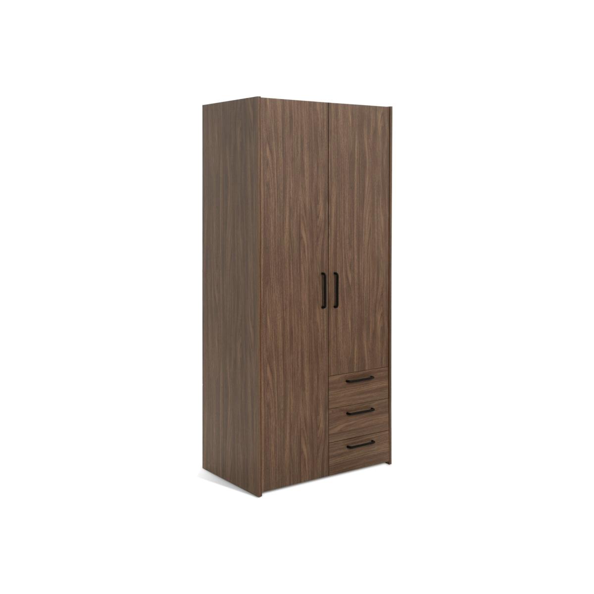 Need flexible storage but short on space? Our Oldham 2-door wardrobe offers long and short hanging, plus shelves and drawer space all-in-one. Visually pleasing it comes in walnut with decorative black handle detail. A simple and smart storage solution. Made in the UK. Part of the Oldham collection. Made of particleboard. Plastic handles. 2 doors. 3 drawers with metal runners. 1 fixed hanging rail. Hanging rail holds up to 12kg. 1 fixed shelf. Self-assembly - 2 people recommended (includes wall fixings). If this product is over 60cm high it must be securely attached to the wall to prevent overturning. Dimensions: Size H180, W81.9, D49cm. Internal hanging space H171, W78.9, D46.9cm. Internal drawer H9.75, W36.3, D33.3cm. Handle size: L16, W1cm. Weight 58kg. General information: FSC certified meaning the materials used for this product are responsibly sourced. We are excited to be welcoming some of our favourite HOME products into the Habitat range. Your product may arrive in Habitat or HOME packaging.