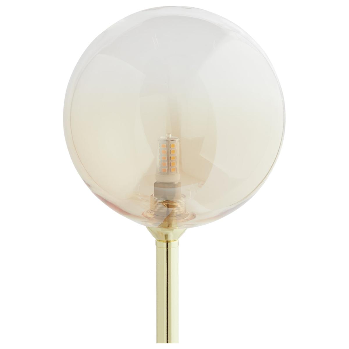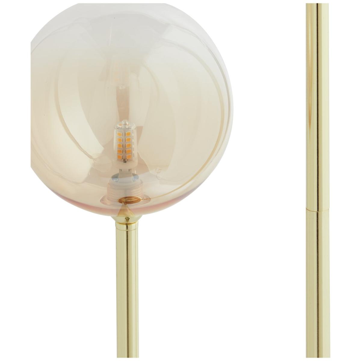 Have a ball with your floor lamp. The fusion of champagne tinted glass and gleaming brass is a glamourous combo. The 2 asymmetrical ombre globes are perfectly paired with a slim, elegantly curved stand. Relax in its warm glow. This is luxe lighting to lounge with. No reaching up to turn this lamp on and off. It has a floor switch for toe tapping convenience. Dimensions: Size H146, W28, Diameter 25cm. Diameter of base 25cm. Shade size H15, D15cm. Cord length 1.8m. Bulb Information: Bulb required 2 x classic capsule G9 LED (not included). 4 watts. (bulb not included). LED bulb only. General Information: Foot switch. IP 20 - not suitable for bathroom use. Self-assembly. This lighting product is a class 2 fitting. Weight 3.05kg. Ombre Glass. Manufacturer's 1 year guarantee.