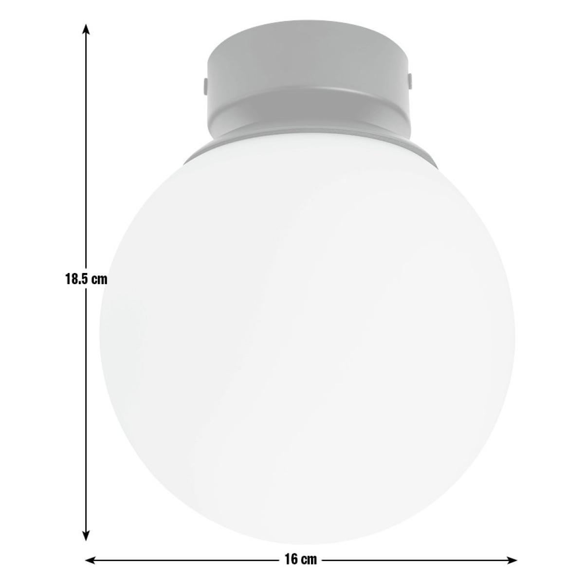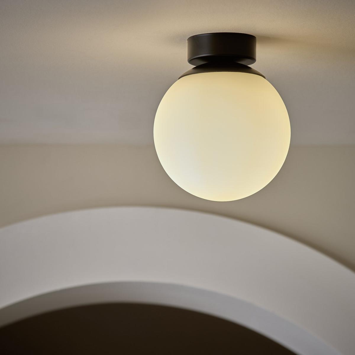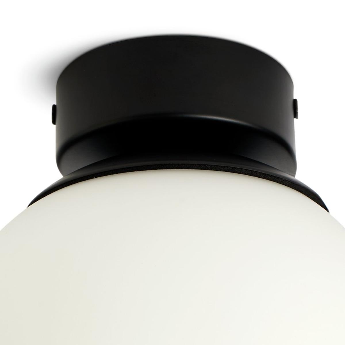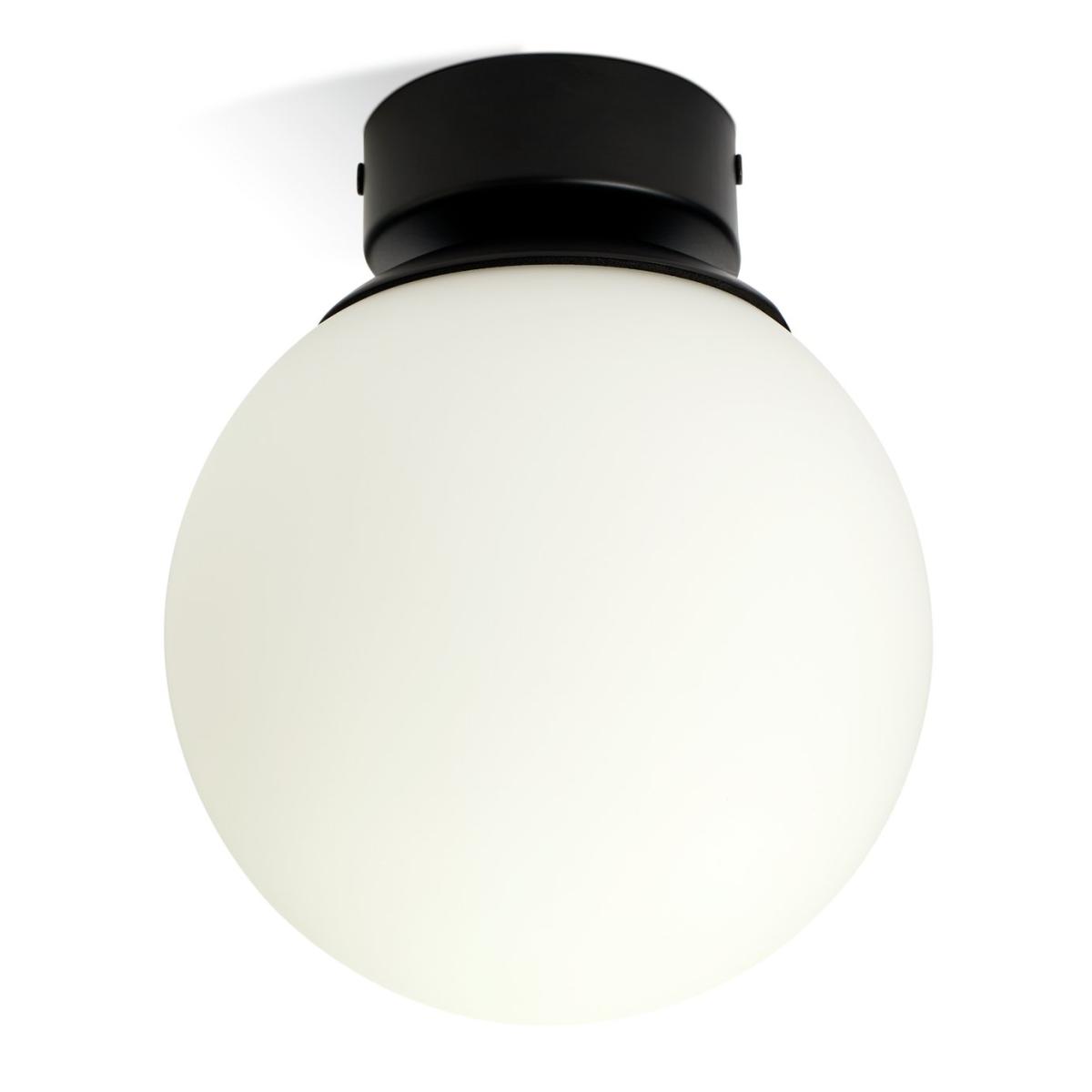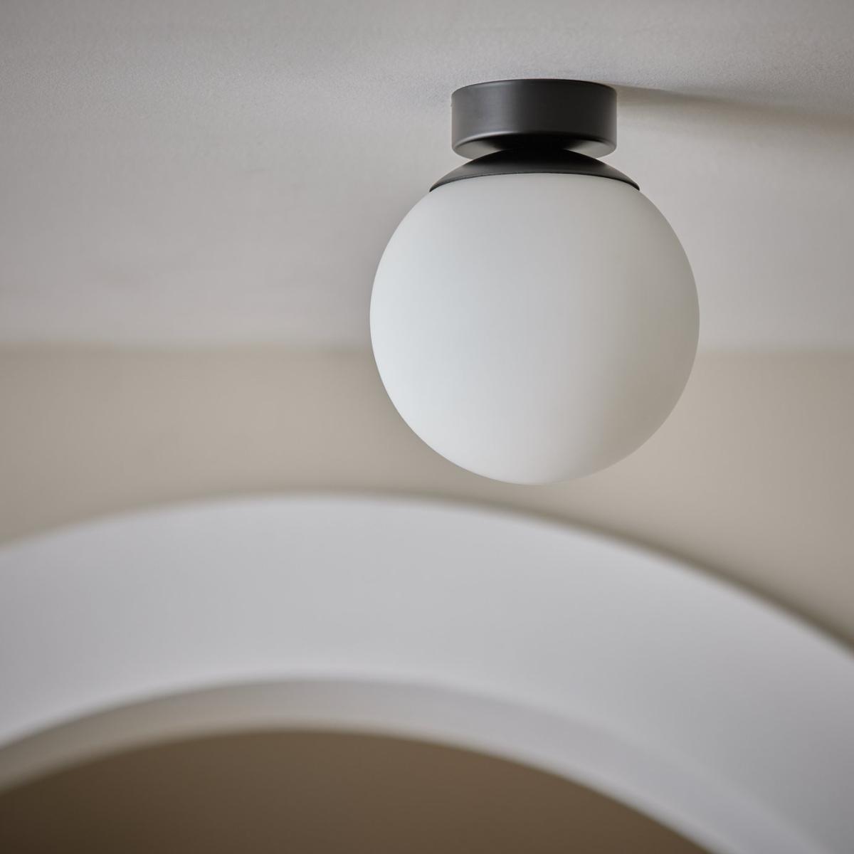 Illuminate your bathroom with this chic ceiling light. With a satin black base and opaque opal glass shade, it's contemporary, simple and effortlessly minimalist. Part of the Opal Glass Bathroom collection. Dimensions: Size H18.5, W16, D16cm. Diameter 16cm. None adjustable drop. 18.5 - 18.5cm drop. Bulb Information: Bulbs required 1 x globe E14 small edison screw LED (not included). Recommended maximum wattage: 10 watts. Can be used with a dimmer switch. LED bulb only. General Information: Glass and Metal. Bathroom Lighting area use: ceiling. IP rating 44 - suitable for use in the bathroom in Zone 2 and outside zones. Weight: 0.7kg. Minimal assembly. Product is hard-wired into electrics. This lighting product is a class 2 fitting.