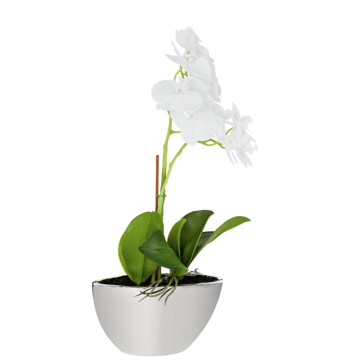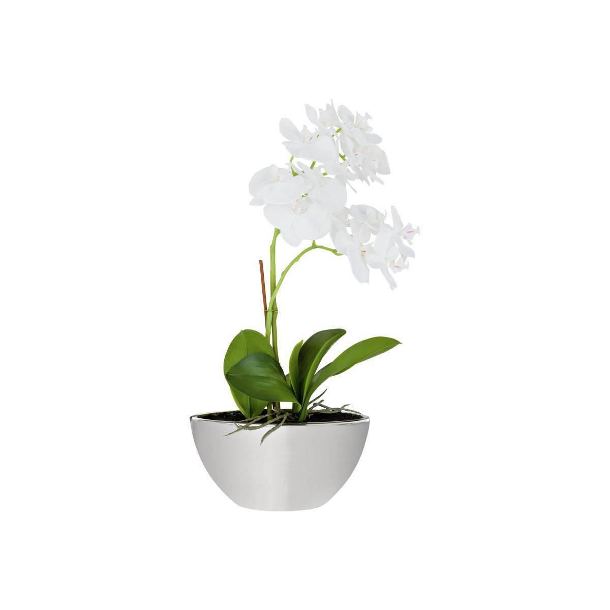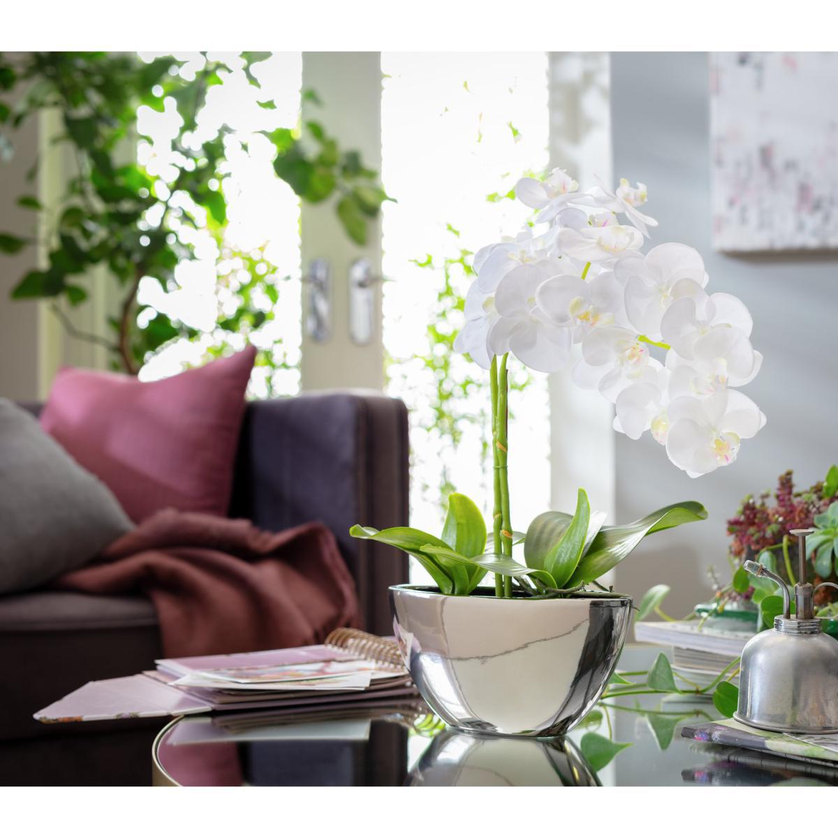 In full bloom. Accessorizea plain desk or sideboard with this refreshing large white orchid arrangement. Perfect for creating a tranquil atmosphere, this pretty artificial plant comes in a smooth mirrored pot and has a simple, contemporary style. No pruning required.