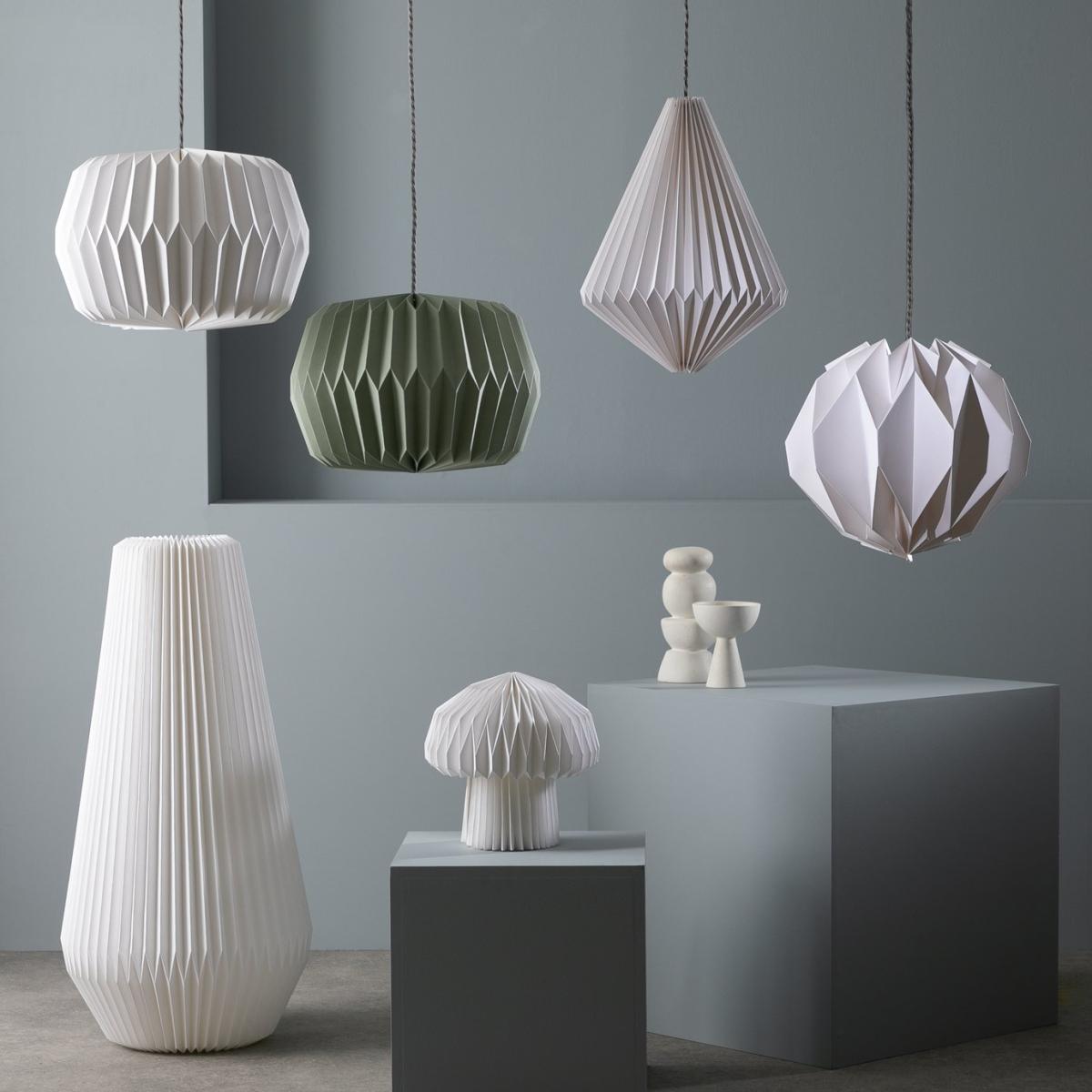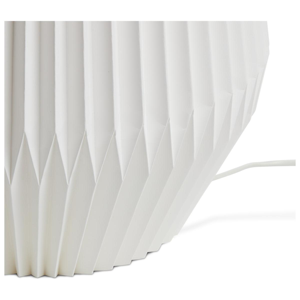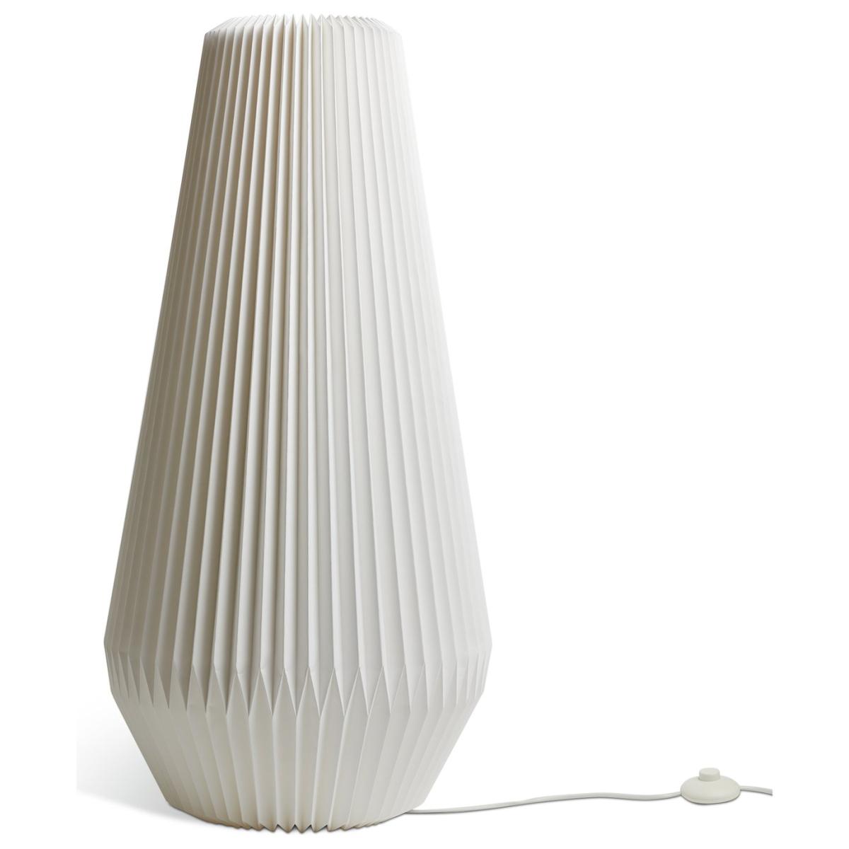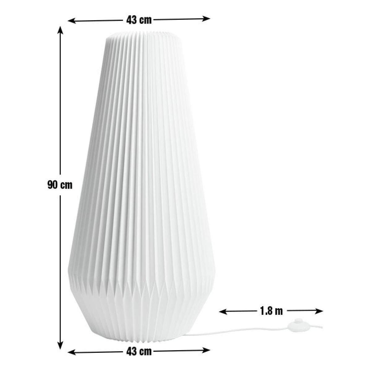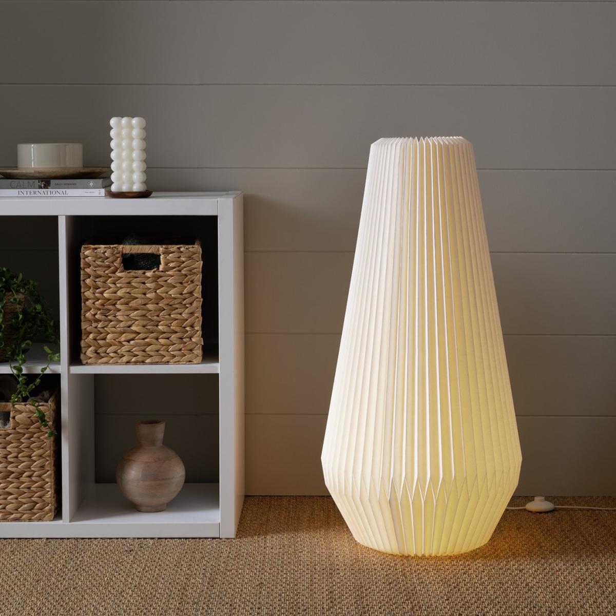 Simply striking. Inspired by Japanese design, our white paper floor lamp has a folded origami-like structure that really makes a statement. Place in the living room or bedroom for a soft, warm glow and a cosy atmosphere. An inline foot switch lets you effortlessly tap on, tap off. How relaxing. Dimensions: Size H90, Diameter 43cm. Diameter of base 43cm. Shade size H90, D43cm. Cord length 1.8m. Bulb Information: Bulb required 1 x globe E27 edison screw LED (not included). 10 watts. LED bulb only. General Information: Foot switch. IP 20 - not suitable for bathroom use. Self-assembly. Product is mains powered plug in. This lighting product is a class 2 fitting. Weight 0.92kg. Origami. Manufacturer's 1 year guarantee.