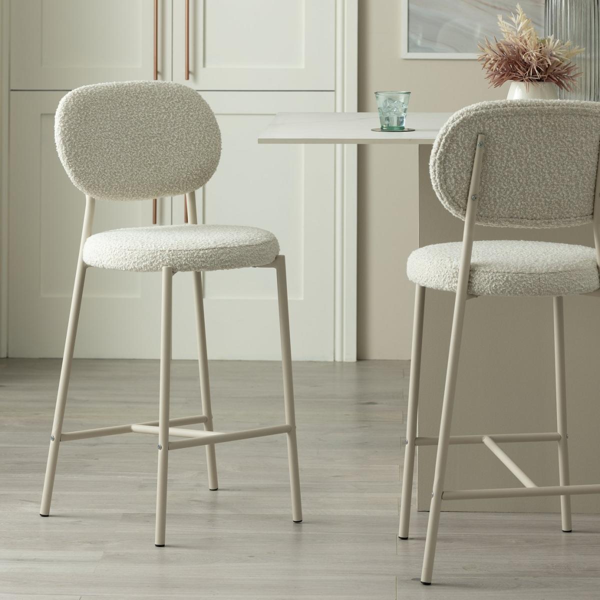 Our plush Orson barstool is chic, padded and comfy. Upholstered in soft boucle fabric with slim metal legs and a built-in footrest. Part of the Orson collection. Chair: 1 chair supplied. Size H101, W52, D48cm. Seat height 67cm. Foot rest. Metal frame with metal legs. Fabric seat pad. Self-assembly - 1 person recommended. Max user weight per chair 130kg. Individual chair weight 6kg. Wipe clean with a damp cloth. Package Dimensions: Chair package size: H13, W100, D57cm. General information: Manufacturer's 1 year guarantee. FSC certified meaning the materials used for this product are responsibly sourced.