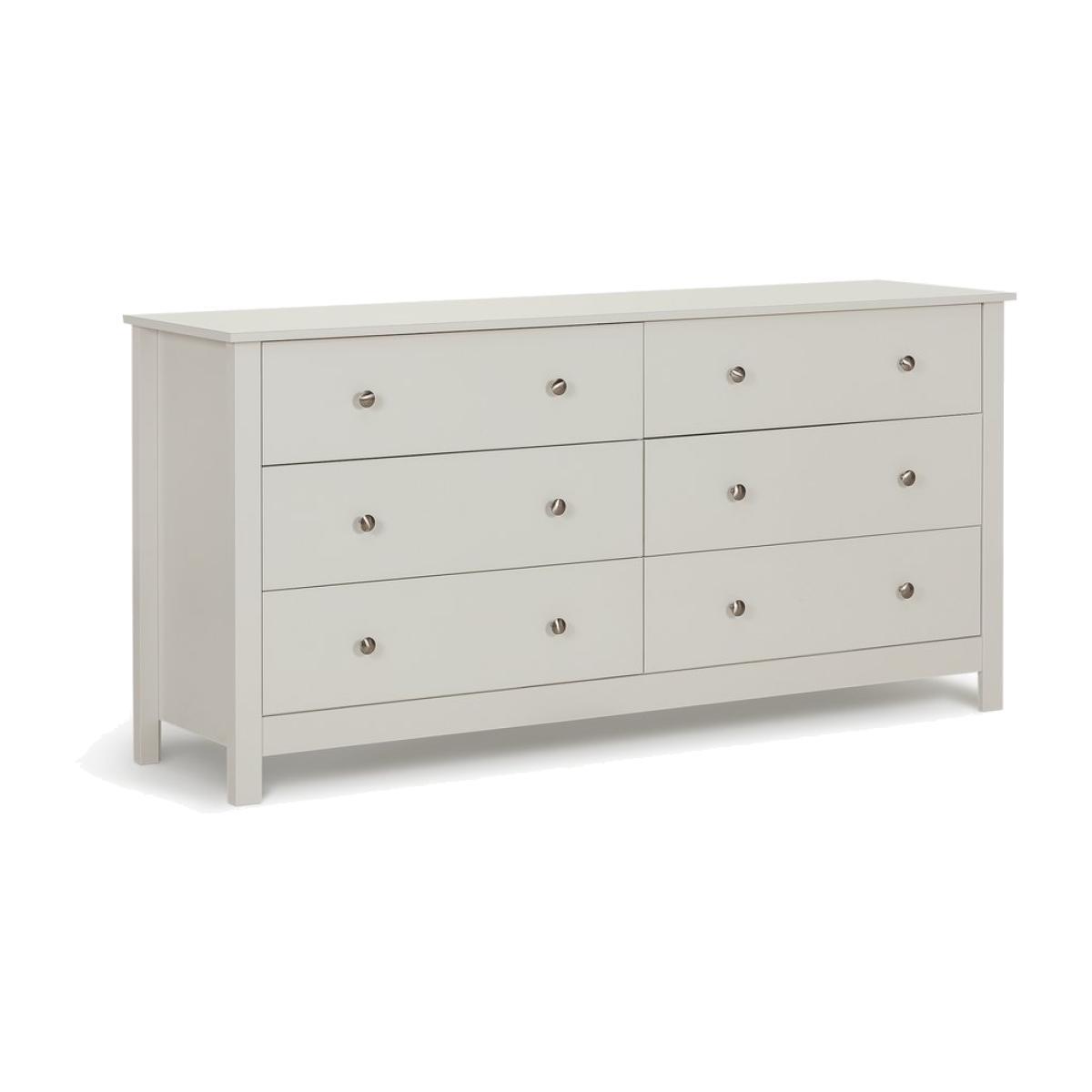 Trendy Osaka. Our wide 6 drawer chest offers a minimal but classy look. Polished metal handles and easy glide runners promise smooth operation. Neat looks on the outside are matched by the opportunity for neat folding on the inside. 6 spacious drawers in our chest give clothes plenty of breathing space. In a soft grey painted finish Osaka is where freshness meets function. Dress the surface like a sideboard, with vases, plants or a lamp in pops of colour you love. Even a TV or an MP3 player won't look out of place on versatile Osaka.