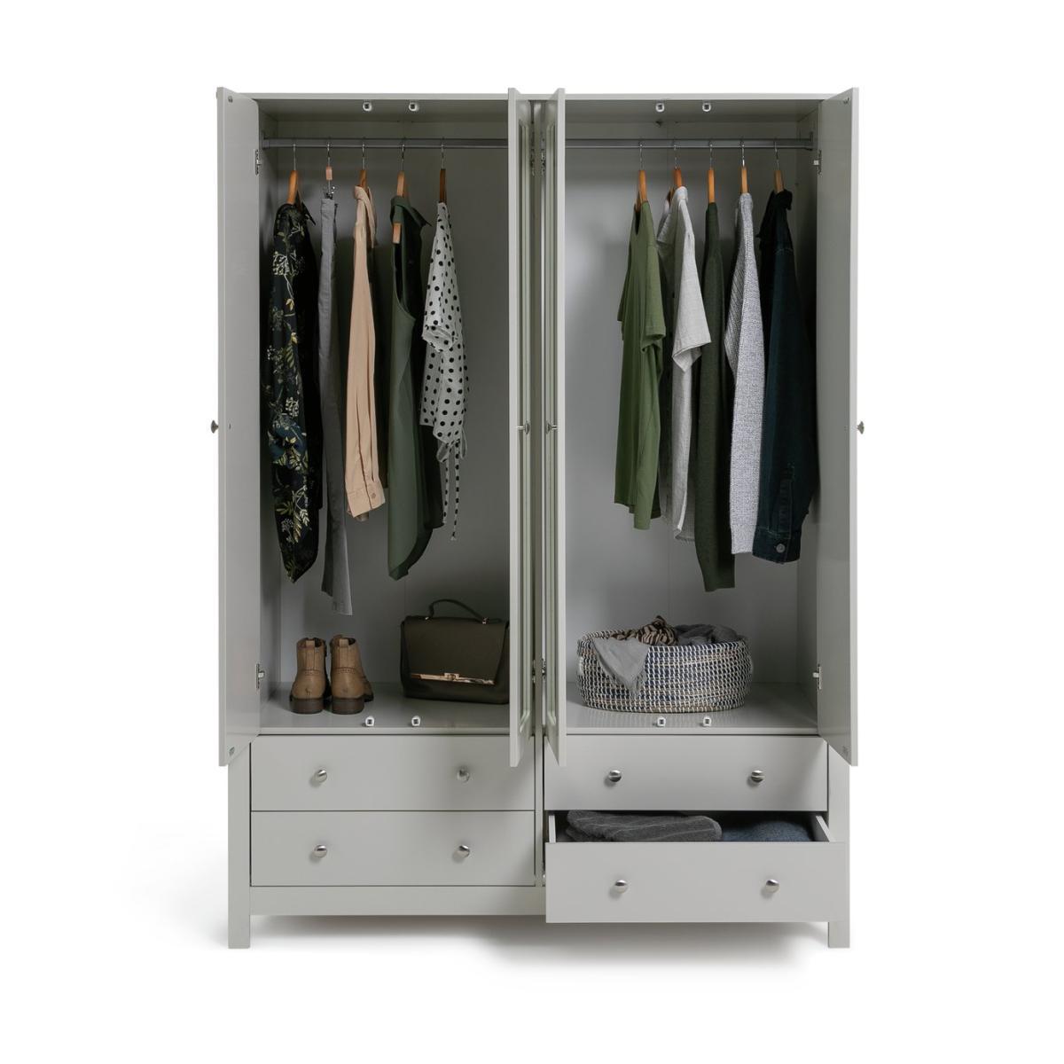 I love this wardrobe for its versatile grey tone and classic design, making it an excellent fit for contemporary or minimal interiors. Its mirror front adds a practical touch, helping to maximize light and space in smaller rooms. It works well in bedrooms that embrace Scandi or modern aesthetics, and it can be styled effortlessly with both soft textiles and sleek accessories. Practical tips include pairing it with neutral or pastel colour schemes to keep the look fresh, and considering open shelving or decorative baskets inside to keep organisation simple but stylish. Overall, it’s a functional piece that brings clean lines and understated elegance to a variety of interior styles.