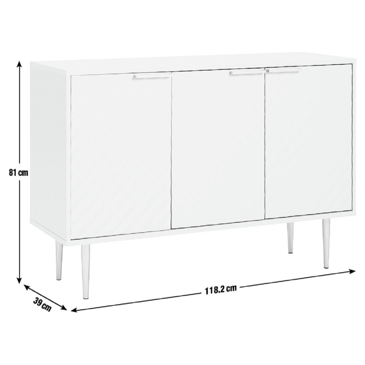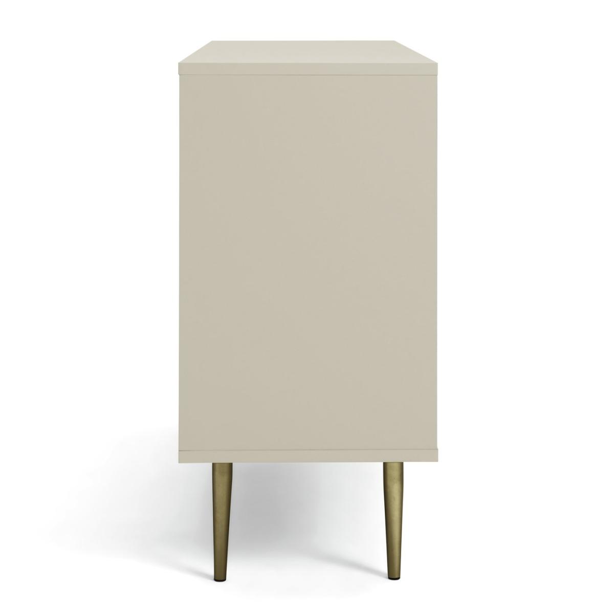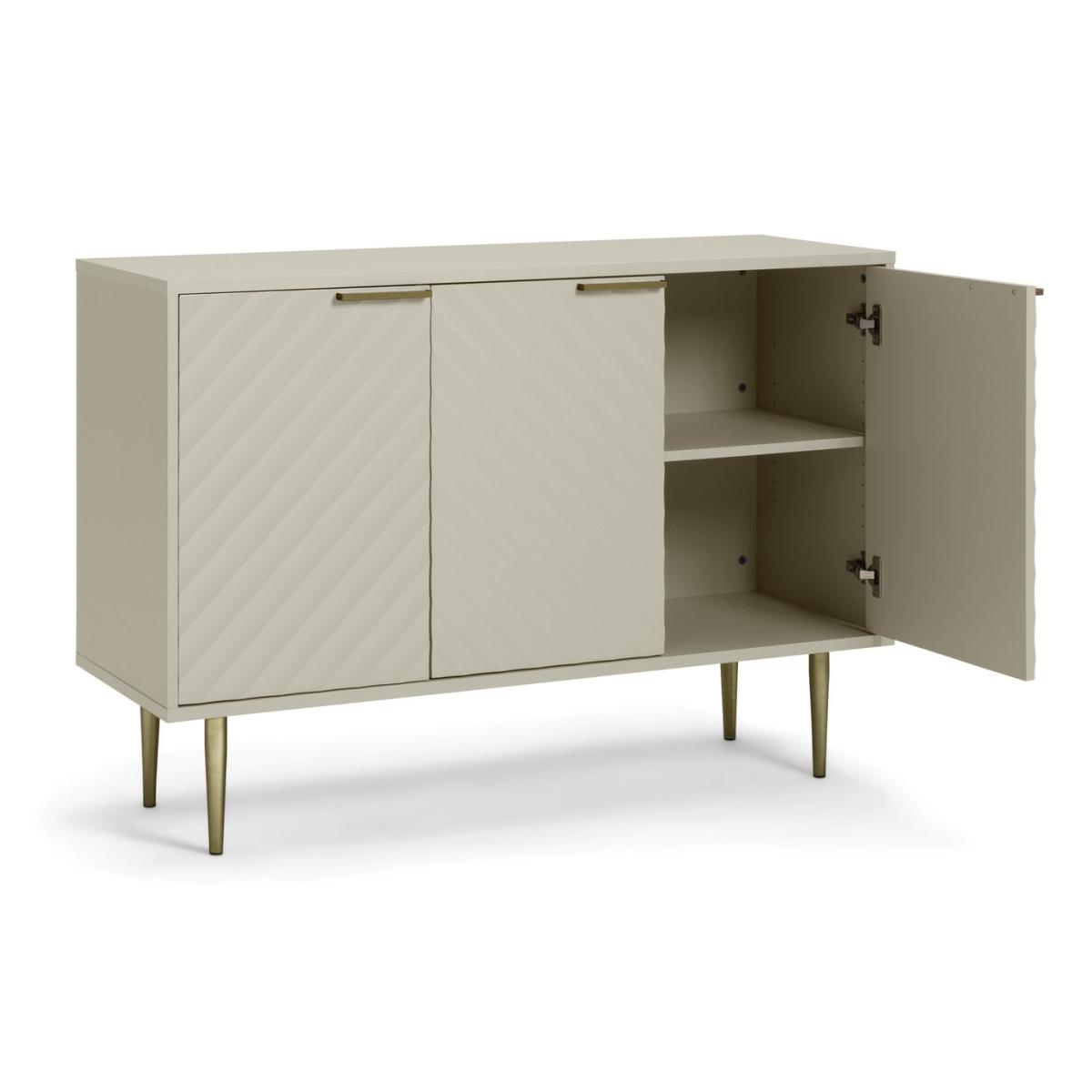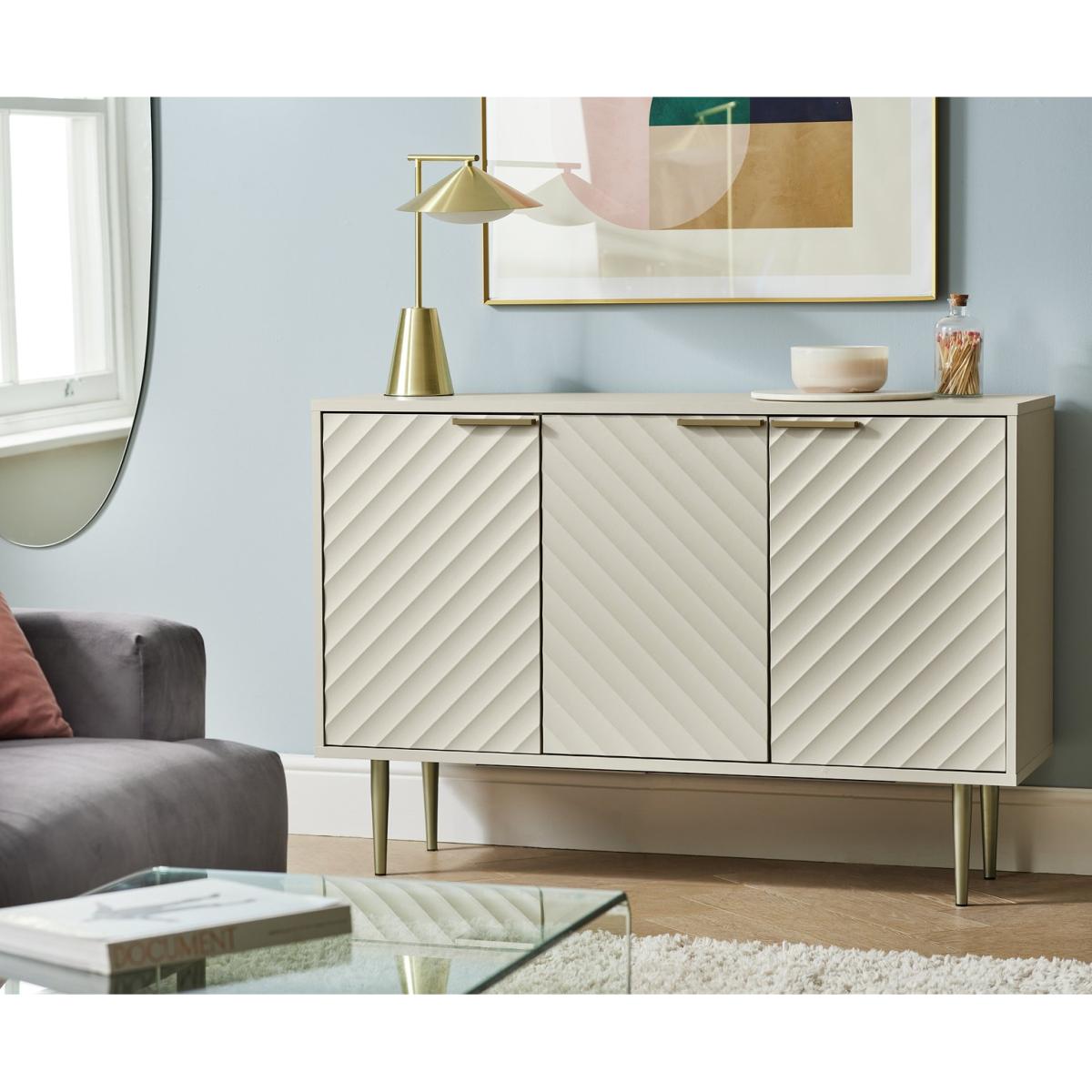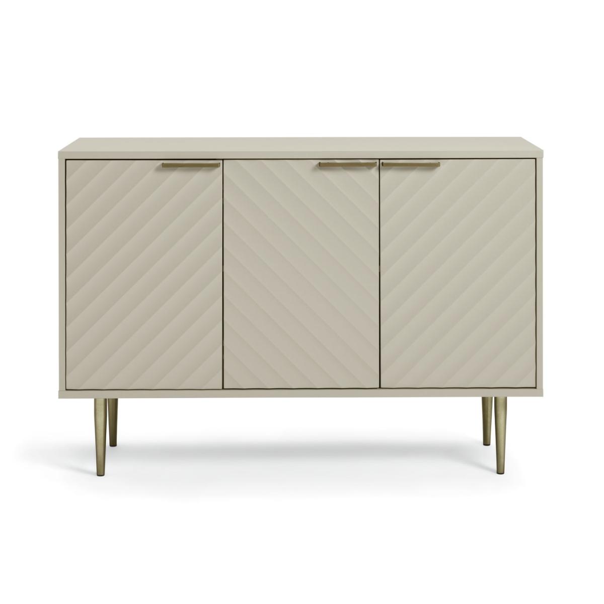 Delicious diagonals make our 3-door Oti sideboard a bit of a stand-out sensation. Very upscale minimal but gloriously glam. Love the blend of warm grey against champagne toned handles and legs. Nice combo, and adjustable shelves inside are an added bonus. Just the right size to be the star of the room without dominating the space. Part of the Oti collection. Made from MDF with a wood effect finish. Size H 81, W 118.2, D39cm. 3 doors. 3 adjustable shelves. Weight 40.5kg. Self-assembly - 2 people recommended. Maximum load weight 50kg. If this product is over 60cm high it must be securely attached to the wall to prevent overturning. Package Dimensions: Package 1 dimensions: H14.8, W126, D41.8cm. Package 1 weight: 42kg. General information: We are excited to be welcoming some of our favourite HOME products into the Habitat range. Your product may arrive in Habitat or HOME packaging.