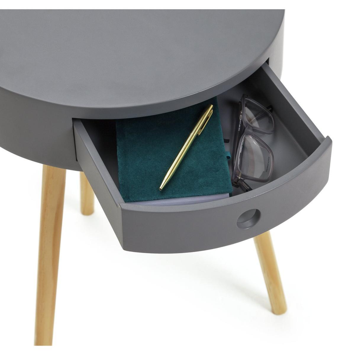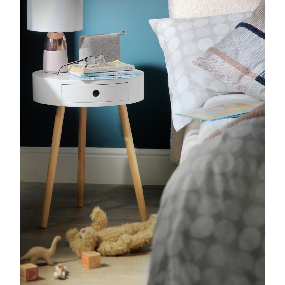 I love this bedside table for its clean, modern silhouette and functional design. The circular shape adds a soft, inviting touch, and the grey finish makes it versatile enough to suit a variety of interiors-from contemporary to Scandinavian, or even minimal schemes. Its small size makes it ideal for compact bedrooms, while the drawer provides handy storage for essentials like books, glasses, or remotes. When styling, try pairing it with textured bedding and simple lamp lighting for a sleek look, or add a pop of colour with accessories on top to personalise the space. The natural wood legs bring warmth and contrast, which works well in both warm-toned or cool-toned schemes. Overall, it’s a practical yet stylish choice that can easily be integrated into many bedroom interiors.