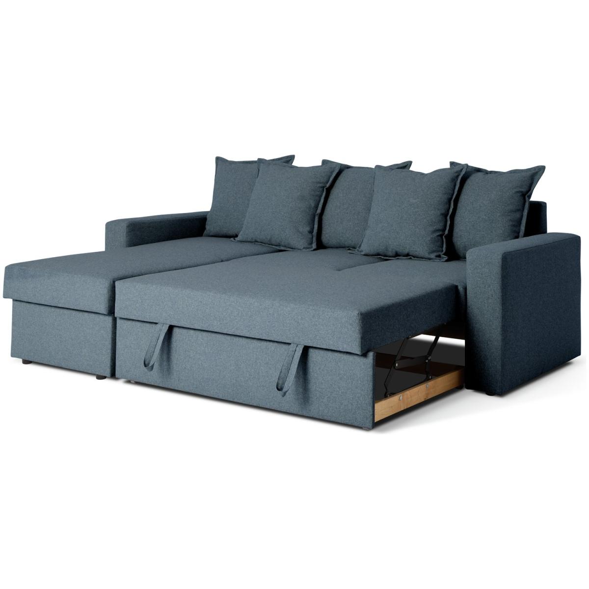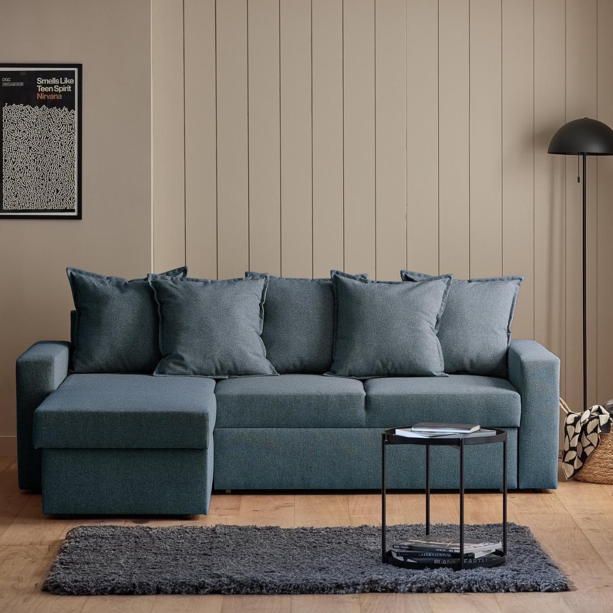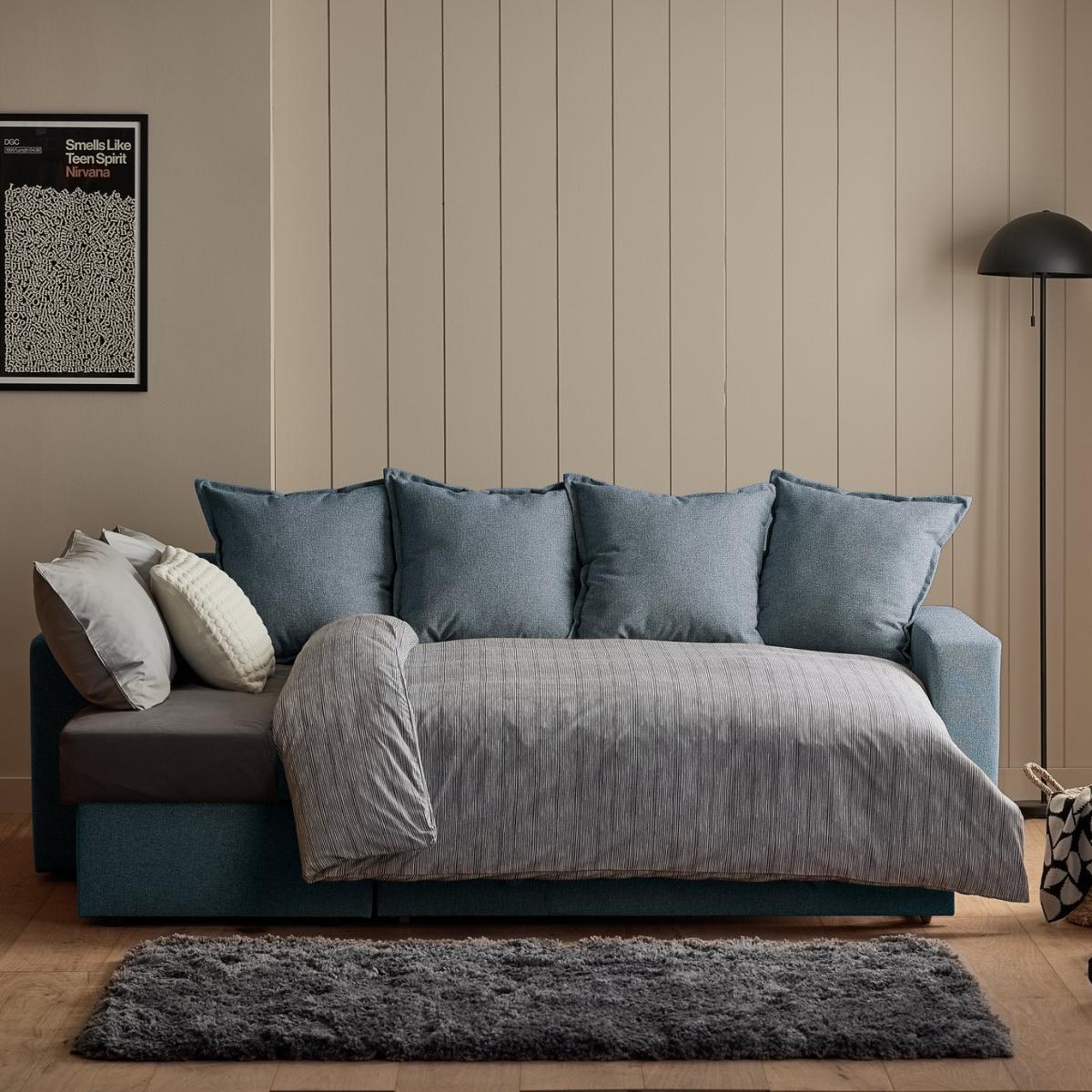 Stretch out, sleep in. This multi-purpose chaise is built for laid back living. Upholstered in a relaxing blue shade, the deep foam and fibre filled seats and abundance of Oxford edged cushions are comfortably inviting. Plus, this smart L-shaped sofa quickly converts into a spare bed too. And as an extra bonus, it even has hidden storage space underneath. Part of the Oxford collection. Metal action mechanism. Material: Made from 100% polyester. Plastic feet. Fixed seats with foam fibre wrap filling. Removable cushion(s) with crumb foam fibre mix filling. Free fabric swatch available on this line. Dimensions: Overall size H87, longer width 230, D167cm. Size of sleeping area W132, L197cm. Floor to seat height: 44cm. Depth of seat: 60cm. Width of shorter seating area between arms: 197cm. Height of arm rest: 58cm. Overall weight 109kg. Storage capacity: 210 litres. Dust or wipe with a damp cloth only. Minimal assembly. Maximum individual user weight 110kg. Packaged dimensions: Package size H76, W154, D93cm. Second package size H76, W162, D90cm. General information: Manufacturer's 2 year frame guarantee. FSC certified meaning the materials used for this product are responsibly sourced.