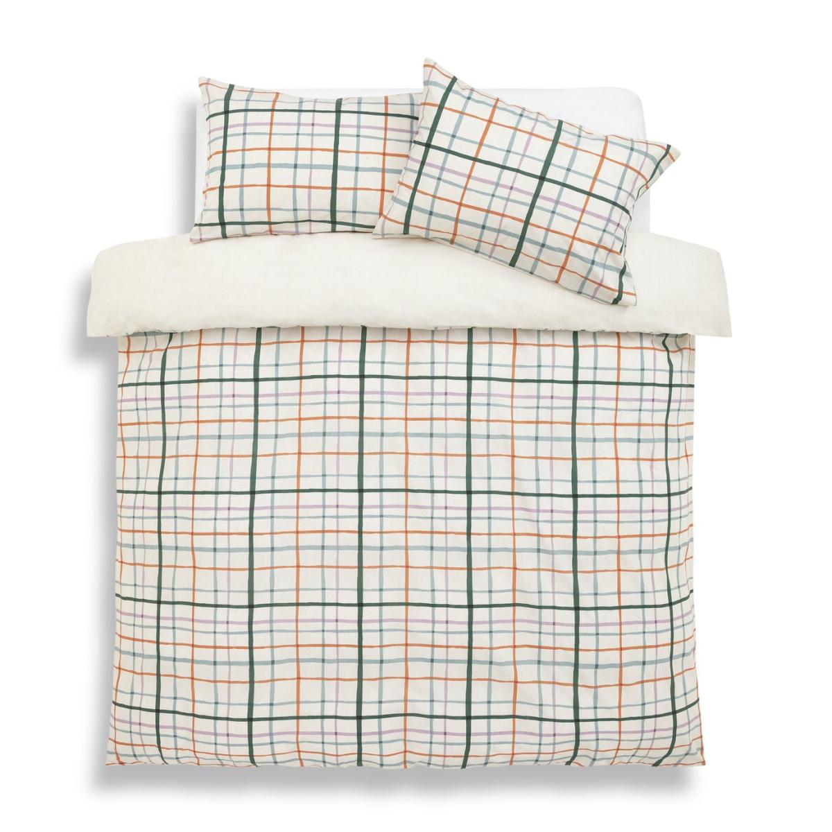Check out this bedding set. Fresh in style and super soft to the touch. Totally reversible with a check print one side. Just flip to change your look. This item carries the STANDARD 100 by OEKO-TEX logo, which means you can be certain that every component has been tested for harmful substances and is therefore harmless to human health. Finish: woven. 50% cotton , 50% recycled polyester. 144 thread count. Set includes 1 duvet cover and 1 pillowcase. Bed size: single. Length 200cm, Width 135cm. Standard pillowcase (s). Pillow case length 75cm, Width 50cm. Reversible pillowcase (s). Machine washable at low temperature. Suitable for tumble drying.