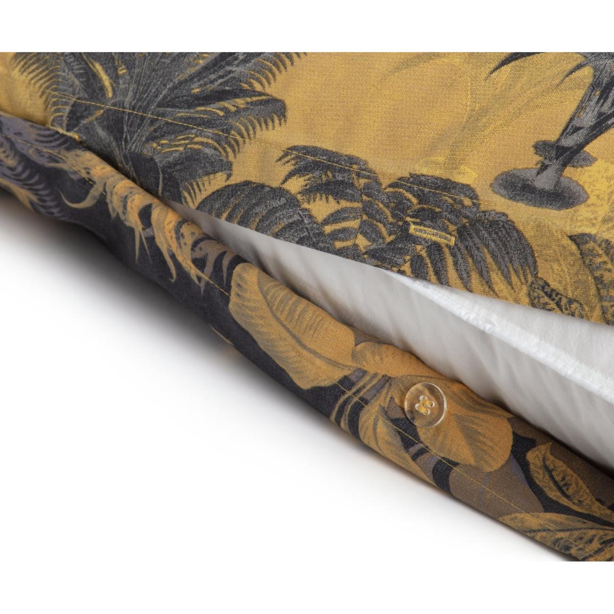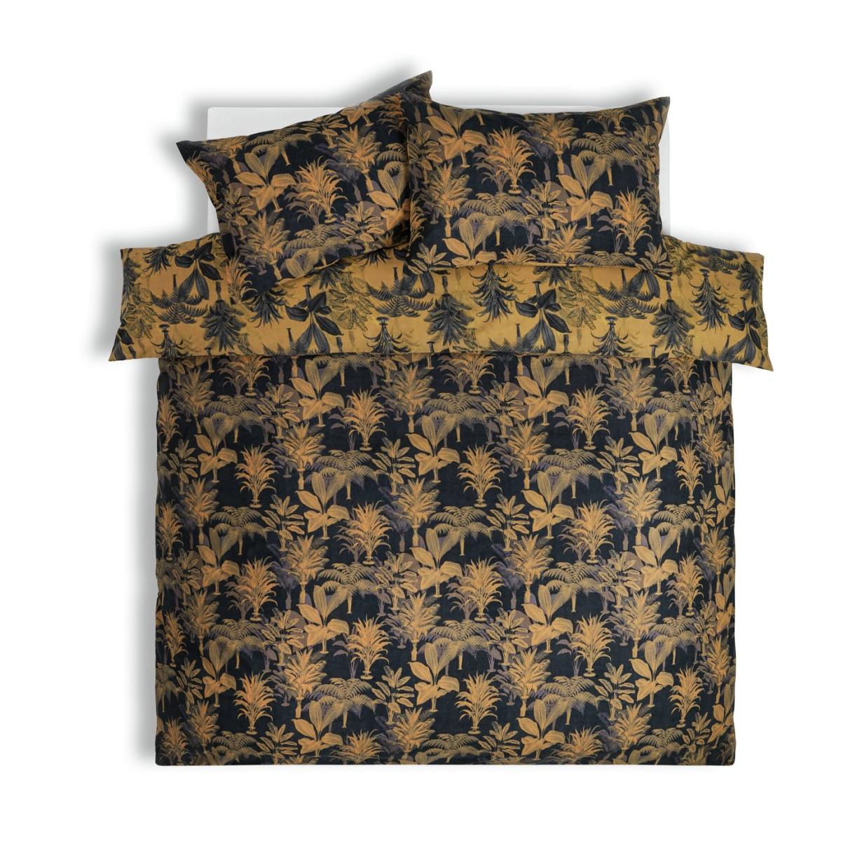 A sensational and opulent bedding set. Swaying palms on muted mustard create an extravagant result. A fusion of classic design and contemporary style. Our set is fully reversible too, with brilliant botanical prints both sides. Ritzy, glam and gorgeous whichever way you look at it. Sleep sumptuously. This item carries the STANDARD 100 by OEKO-TEX logo, which means you can be certain that every component has been tested for harmful substances and is therefore harmless to human health. 52% polyester , 48% cotton. 144 thread count. Set includes 1 duvet cover and 1 pillowcase. Bed size: single. Length 200cm, Width 135cm. Buttons for fastening. Standard pillowcase (s). Pillow case length 75cm, Width 50cm. Machine washable at low temperature. Suitable for tumble drying.