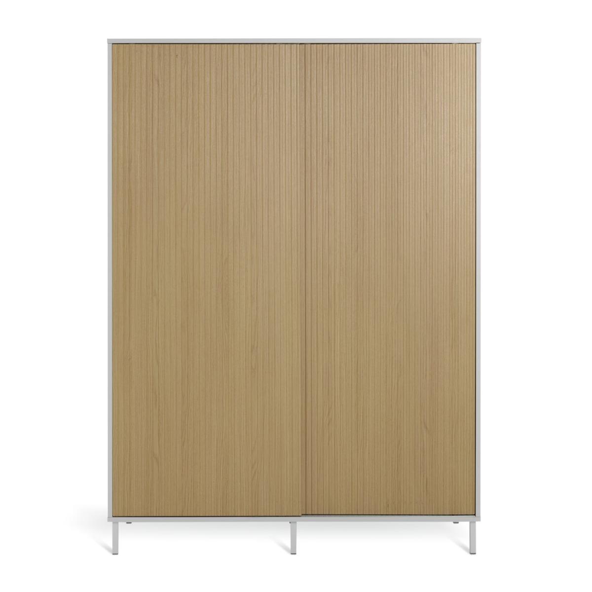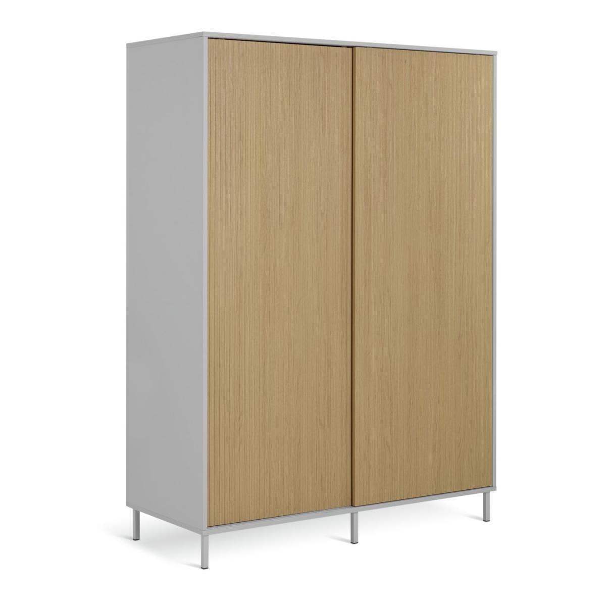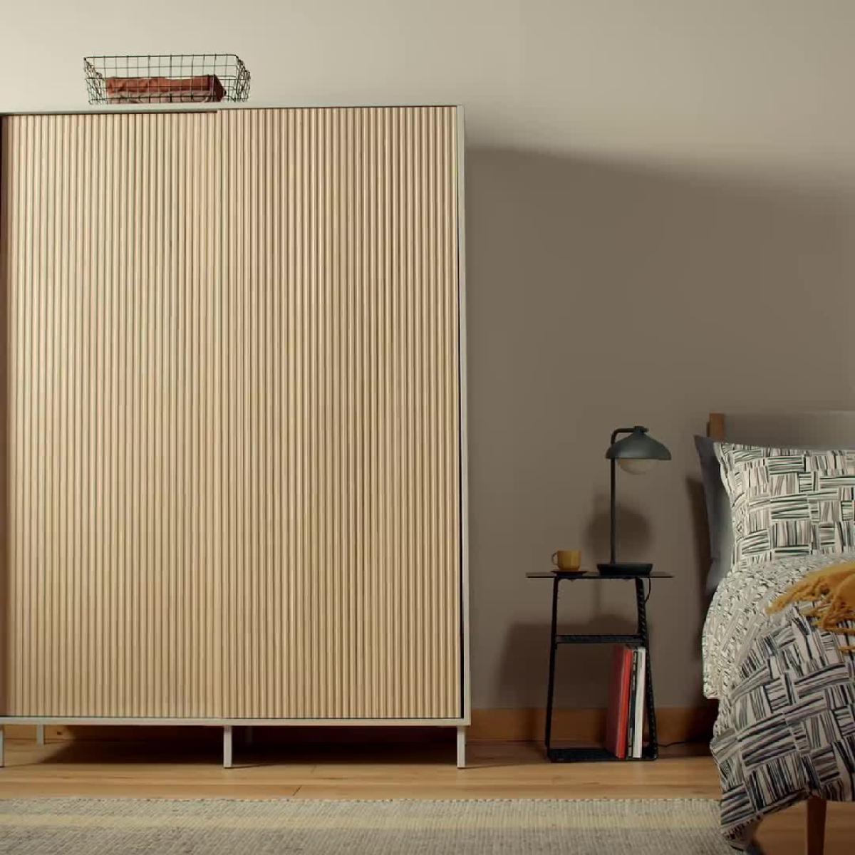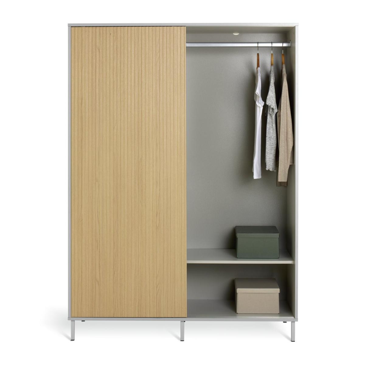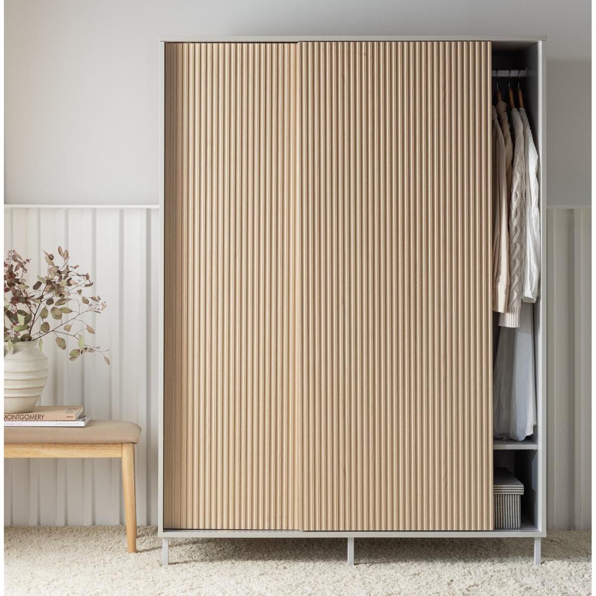 A space saving, door sliding, style boosting, wardrobe. What a smart way to store your clothes. The handless sliding doors have an irresistibly tactile linear oak finish while the contemporary elevated grey PCV frame complements the warmth of the wood. Inside, the hanging rail and 2 shelves give you plenty of ways to store your clothes, shoes and accessories. Part of the Palma collection. Made of particleboard and PVC. 2 doors. 2 fixed shelves. Self-assembly - 2 people recommended. If this product is over 60cm high it must be securely attached to the wall to prevent overturning. Dimensions: Size H180, W130, D55cm. Internal hanging space H120, W124.8, D46.2cm. Weight 87kg. Package Dimensions: Package 1 dimensions: H7.4, W142.4, D68.6cm. Package 1 weight: 27kg. Package 2 dimensions: H4.8, W178.6, D68.6cm. Package 2 weight: 31kg. Package 3 dimensions: H5.8, W177.2, D58.5cm. Package 3 weight: 28kg. General information: FSC certified meaning the materials used for this product are responsibly sourced.