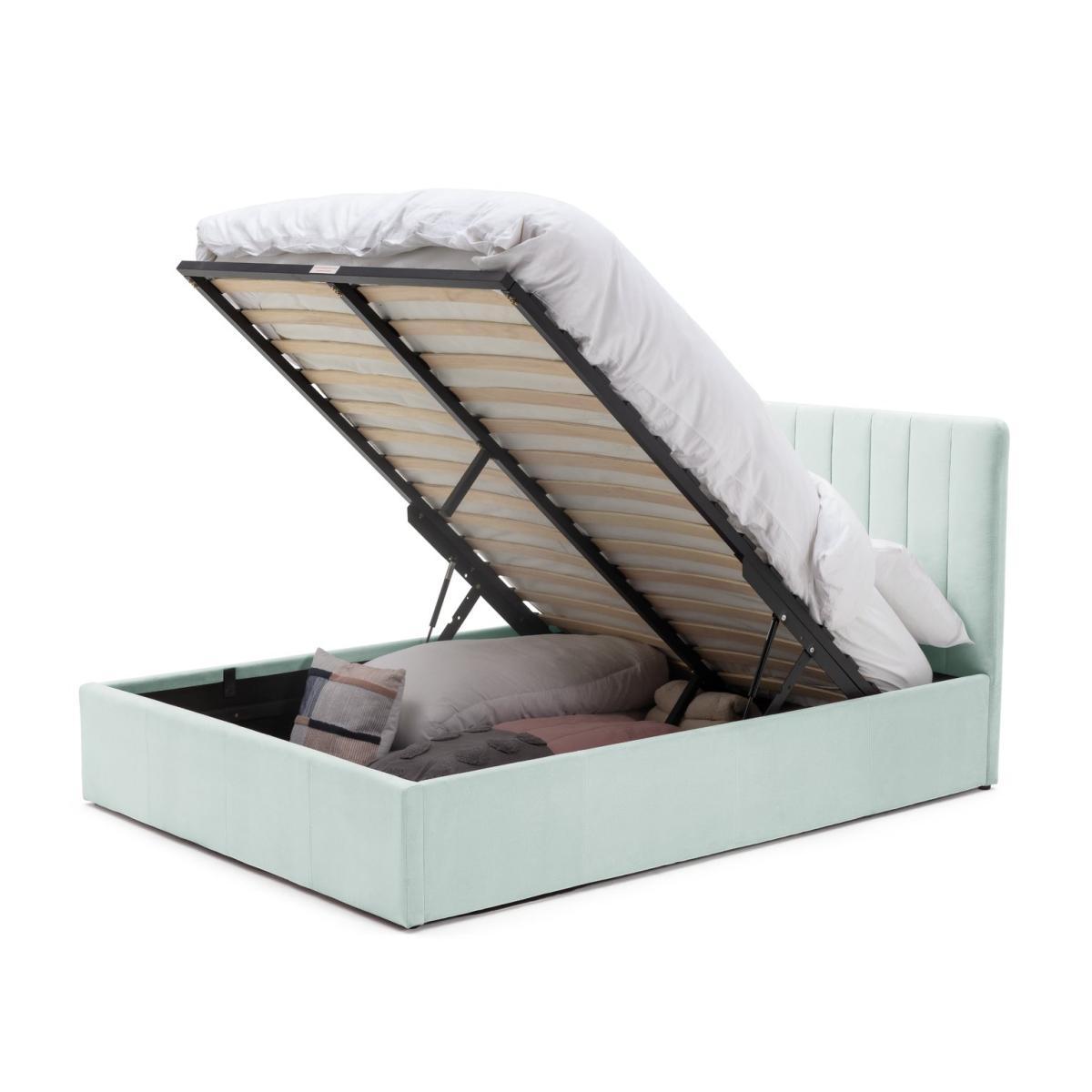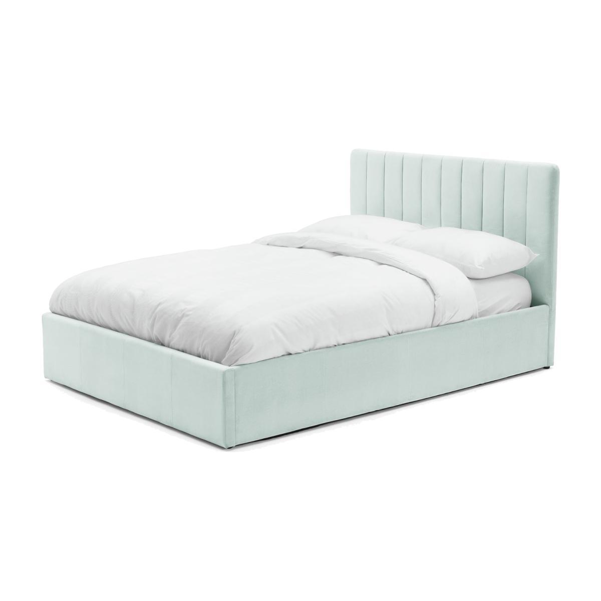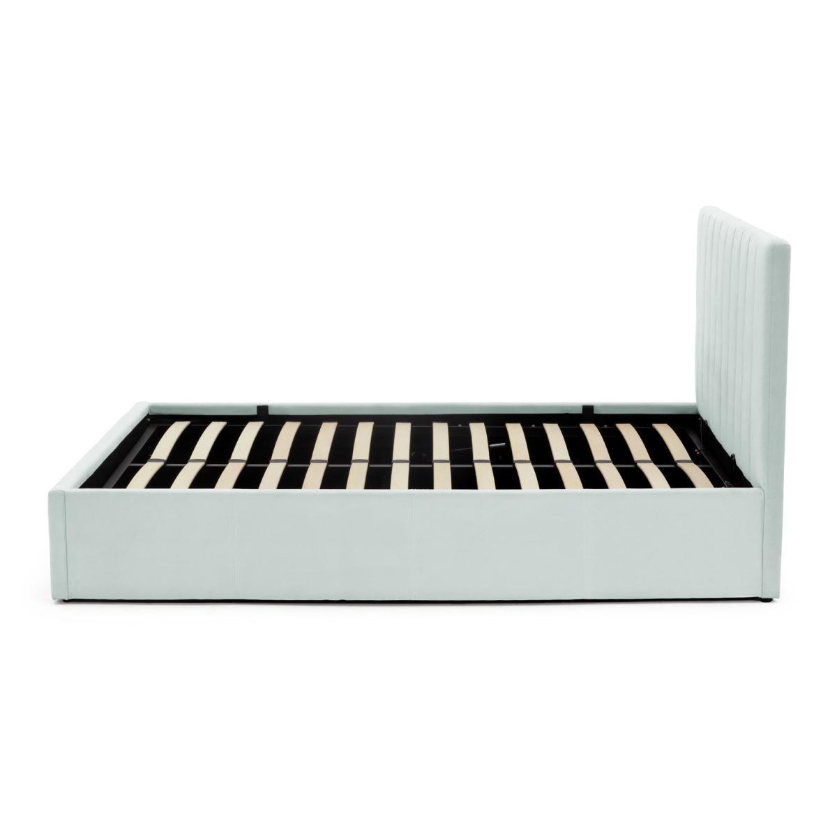 Sleep and store in style. Our Pandora bed frame in blue is as functional as it is fabulous. Time for a tidy? Lift up the end of the bed to reveal lots of space for clothes, pillows and bedlinen. The soft fabric headboard has a subtle groove design that offers a clean, modern look. While sprung wooden slats give a comfy foundation for your mattress. Ideal for nap times and neat times.