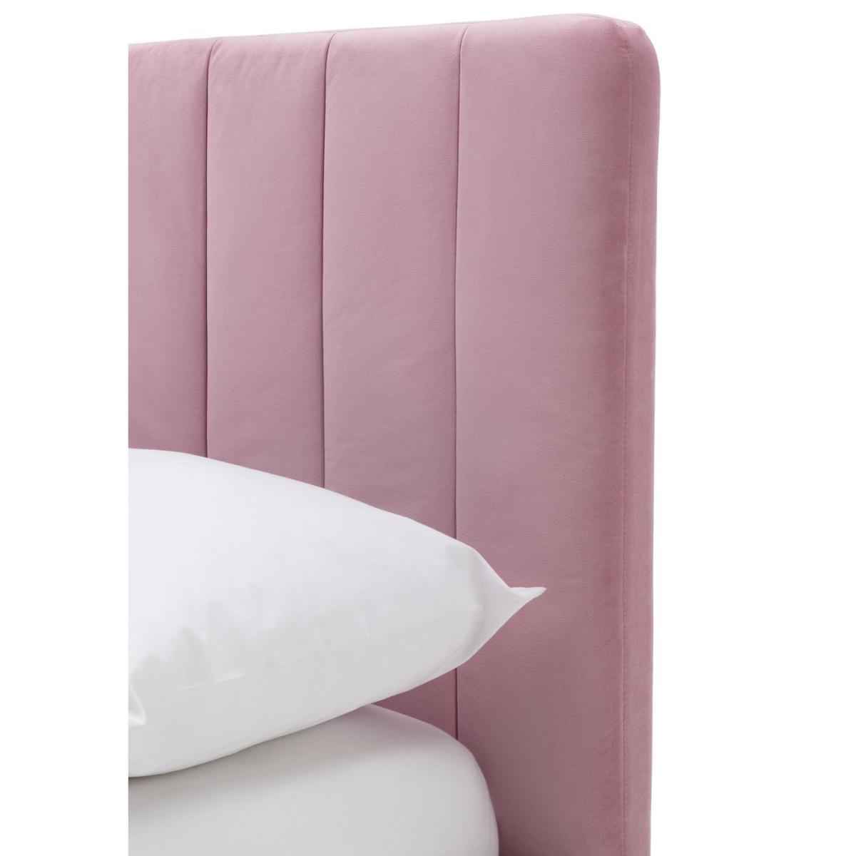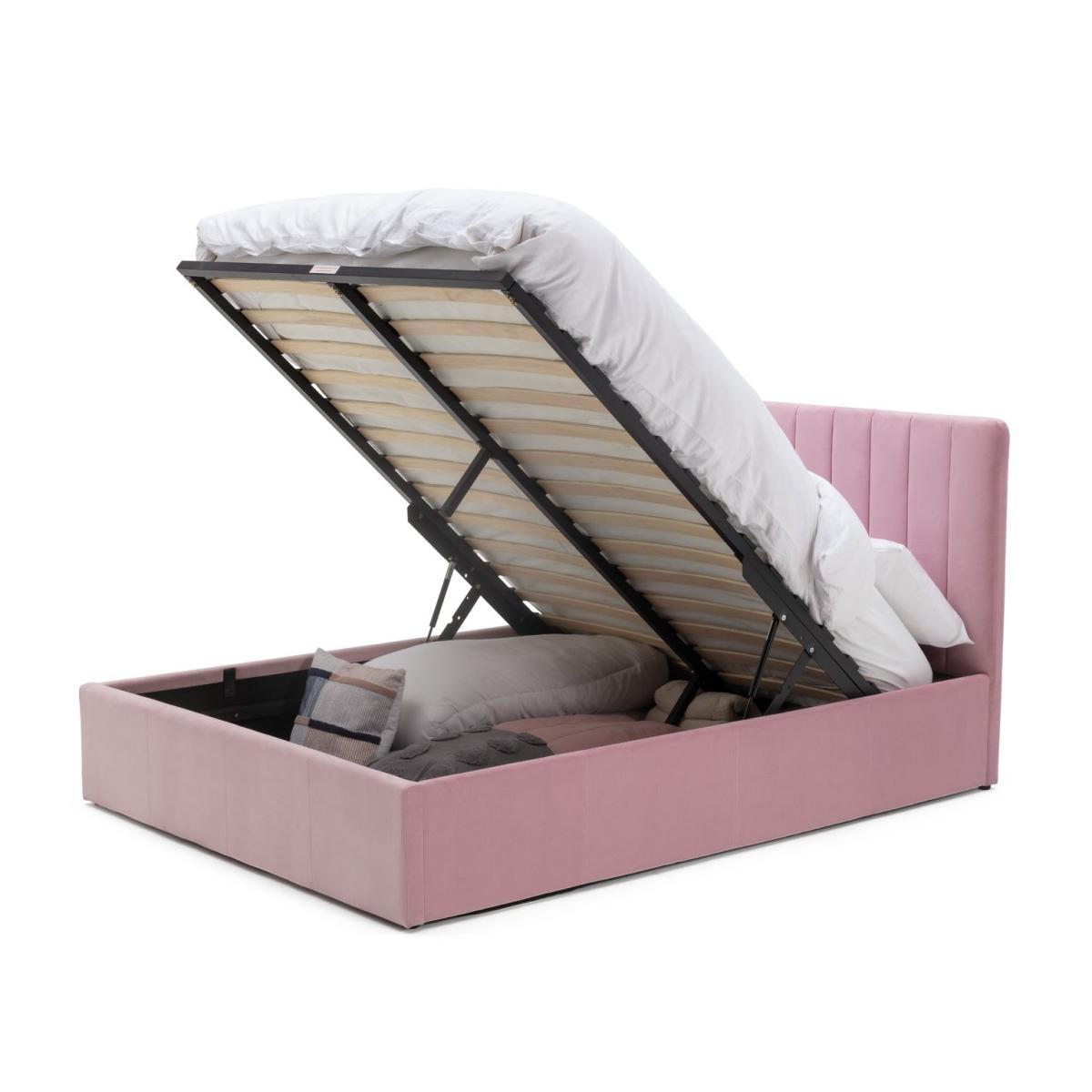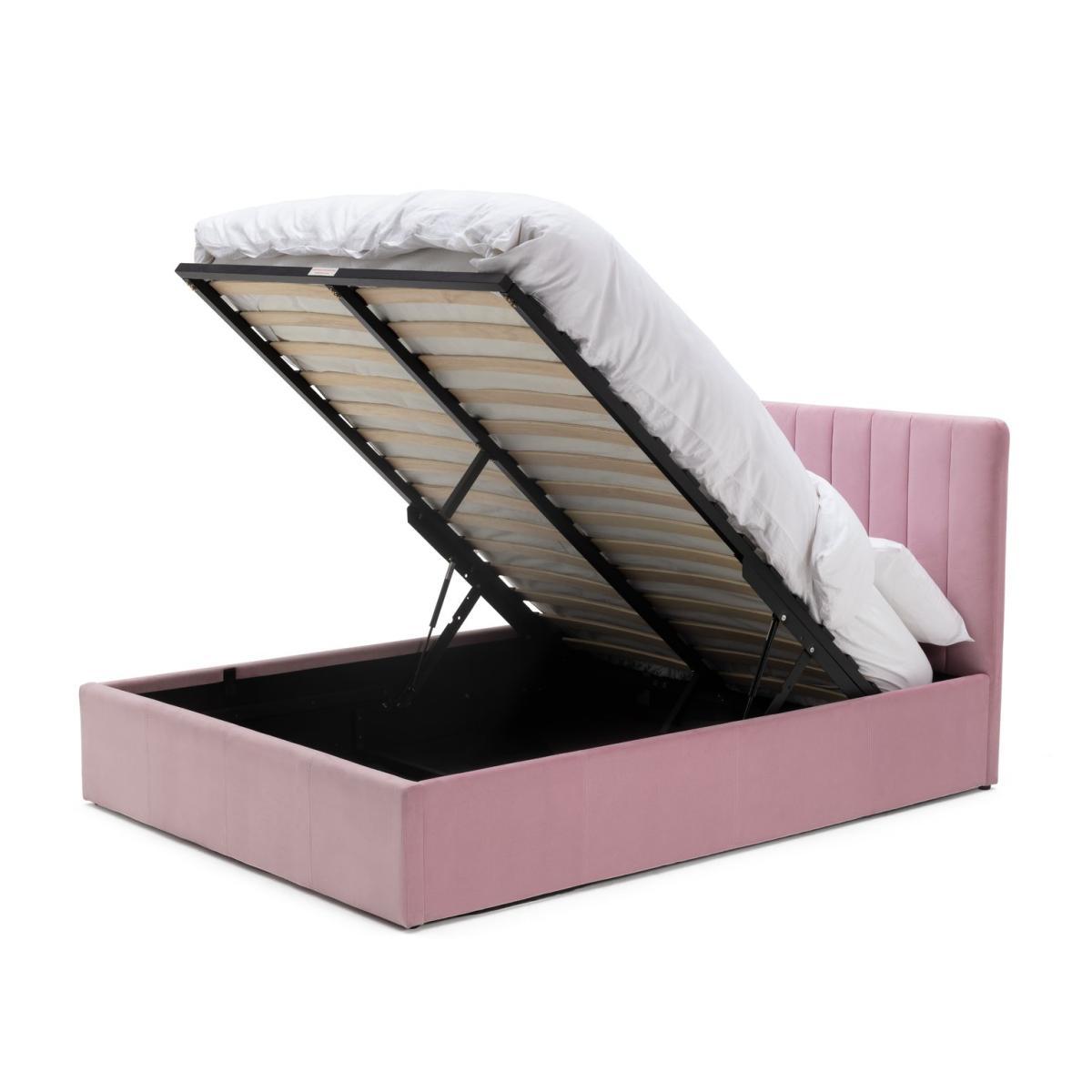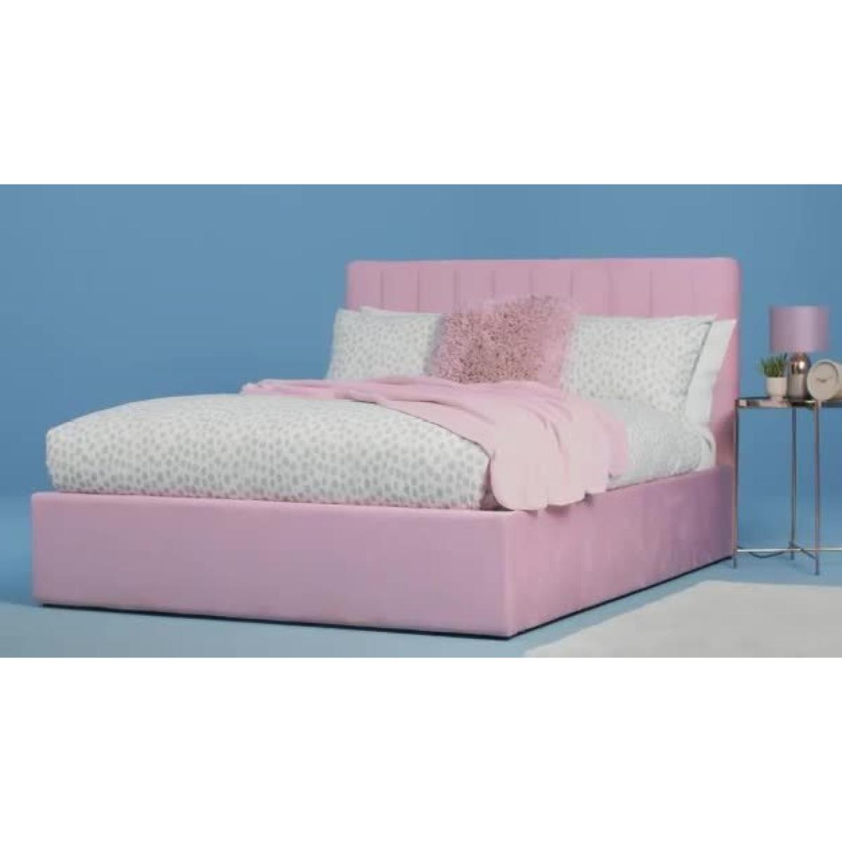 Sleep and store in style. Our Pandora bed frame in blush pink is as functional as it is fabulous. Time for a tidy? Lift up the end of the bed to reveal lots of space for clothes, pillows and bedlinen. The soft fabric headboard has a subtle groove design that offers a clean, modern look. While sprung wooden slats offer a strong foundation for your mattress. Ideal for nap times and neat times.