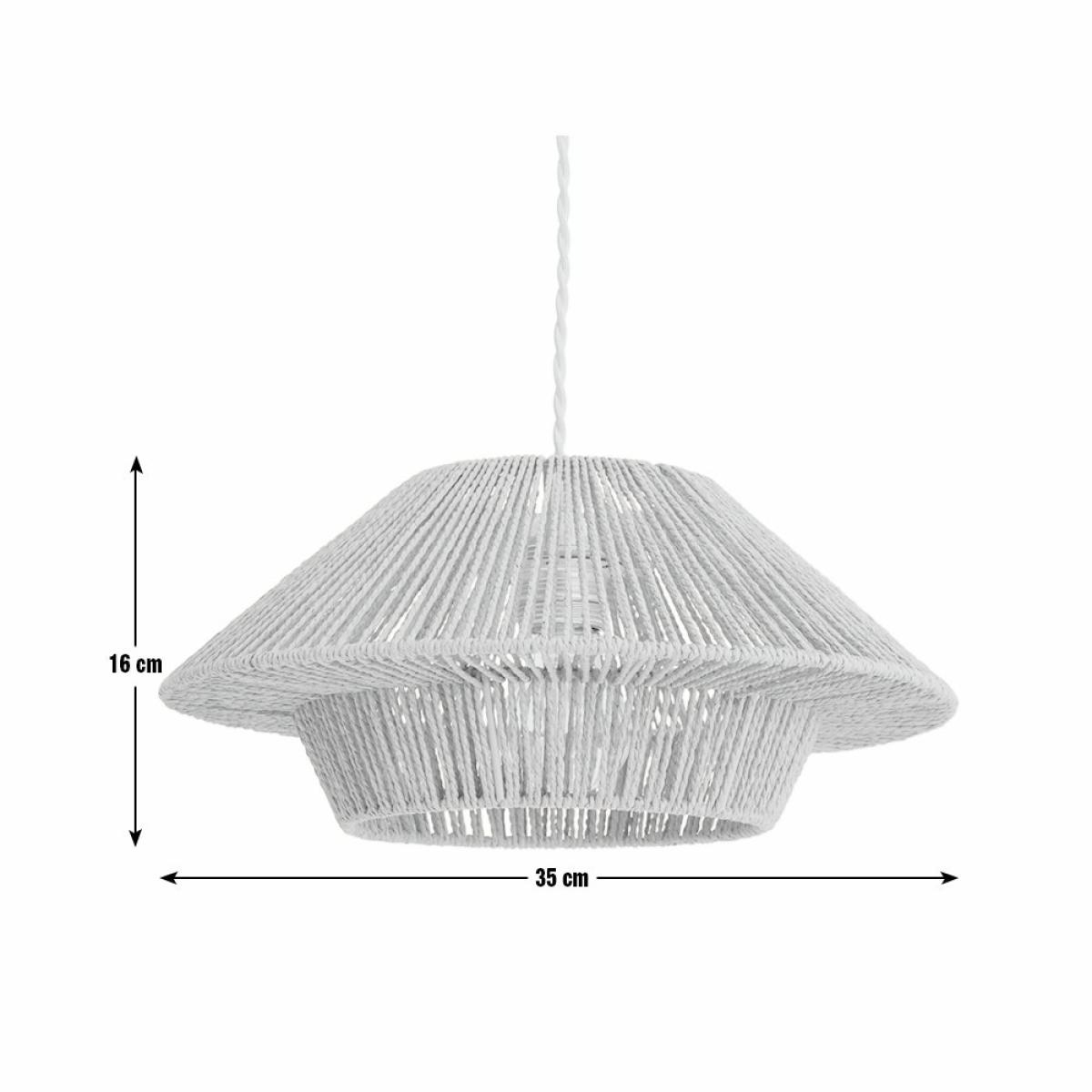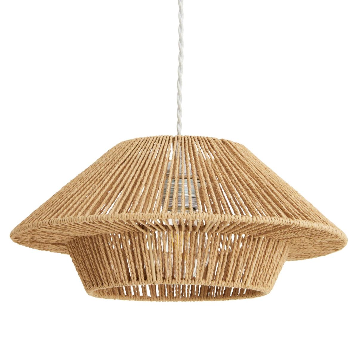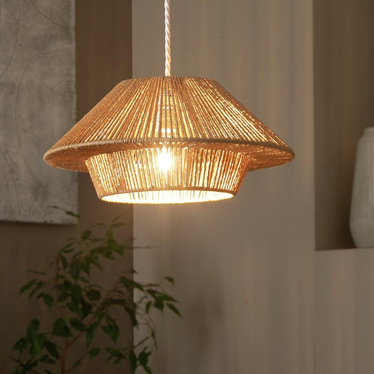 A touch exotic and a whole lot of natural. That's the beauty of this striking rope like shade. The cleverly fashioned 2-tier design teases with glimpses of a bare bulb. It's got that cool cocktails and sultry nights feel. Put it on show in the lounge. Or hang 2 or 3 over a dining table or breakfast bar. One to relax with. Made from paper. Size H16cm, Diameter 35cm. Recommended maximum bulb wattage 10 watts. Fully assembled. Easy fit shade. By choosing FSC certified products, you are supporting responsible management of the world's forests. Manufacturer's 2 year guarantee.