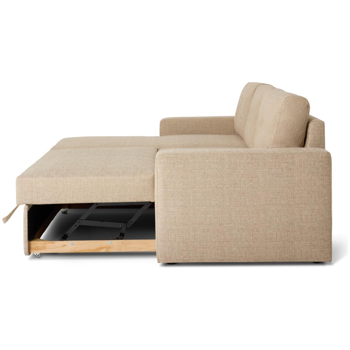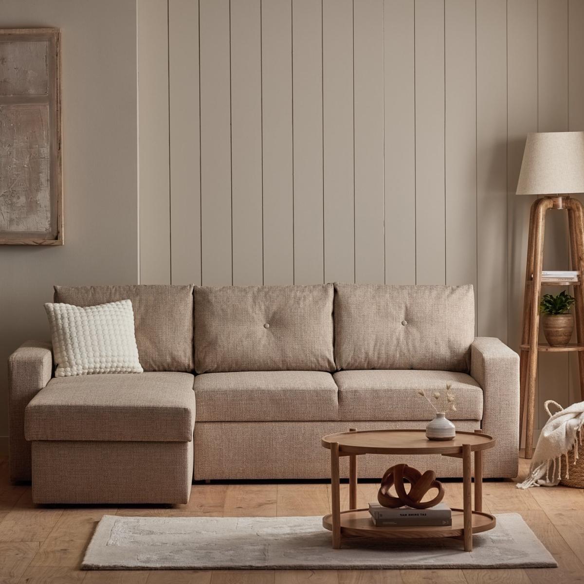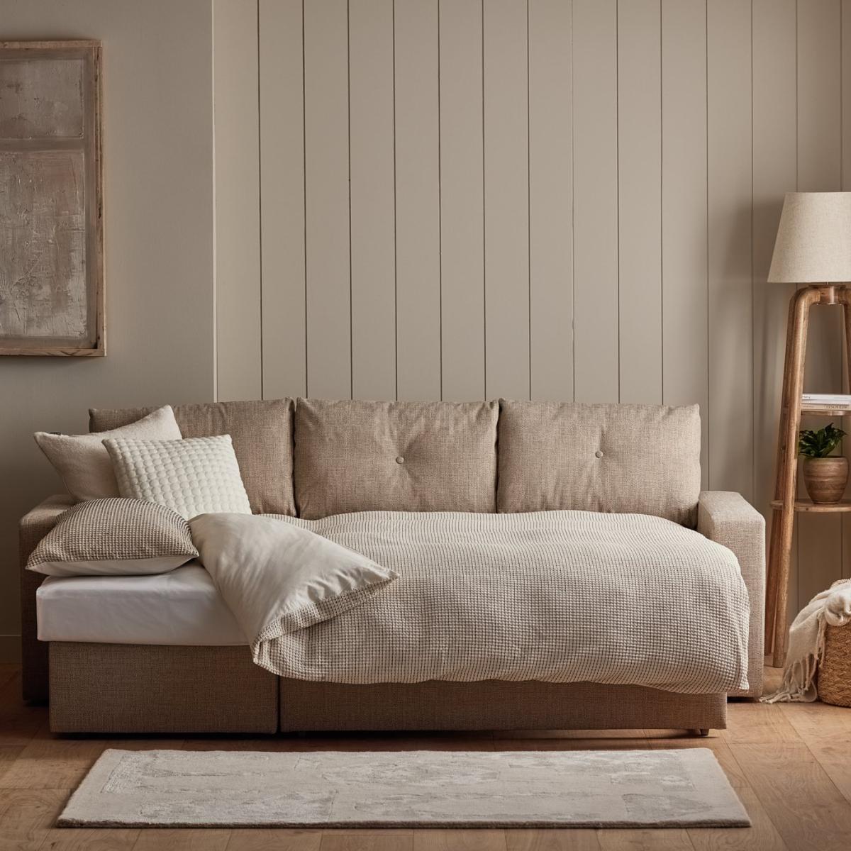 A place to chat, lounge and snooze. Deep foam fibre wrapped seating, button back cushions and that feet up and relax L-shape makes Parker a top sofa spot. But that's not all. This smart chaise also opens out into a spare guest bed. Upholstered in a multi-tonal fabric, the neutral hues give it a naturally easy to get along with style. And there's even more. Underneath this comfy corner sofa bed is plenty of hidden storage space. Perfect for tucking away bedlinen ready for any spontaneous sleepovers. Part of the Parker collection. Metal action mechanism. Material: Made from 100% polyester. Plastic feet. Fixed seats with foam and fibre filling. Removable cushion(s) with crumb foam fibre mix filling. Free fabric swatch available on this line. Dimensions: Sofa size H87, W230, D166cm. Size of sleeping area: W132, L197cm. Floor to seat height: 44cm. Depth of seat: 60cm. Height of seat back: 43cm. Width of seating area between arms: 197cm. Weight 109kg. Storage capacity: 210 litres. Dust or wipe with a damp cloth only. Minimal assembly. Maximum individual user weight 110kg. Packaged dimensions: Package size H76, W93, D162cm. General information: Manufacturer's 2 year frame guarantee. FSC certified meaning the materials used for this product are responsibly sourced.
