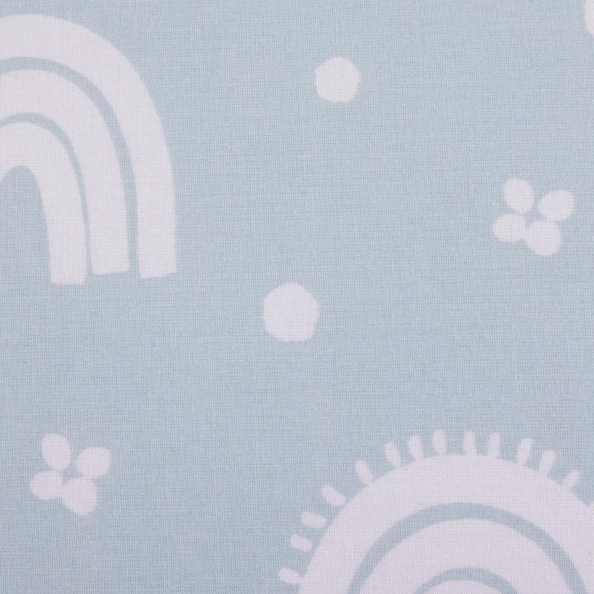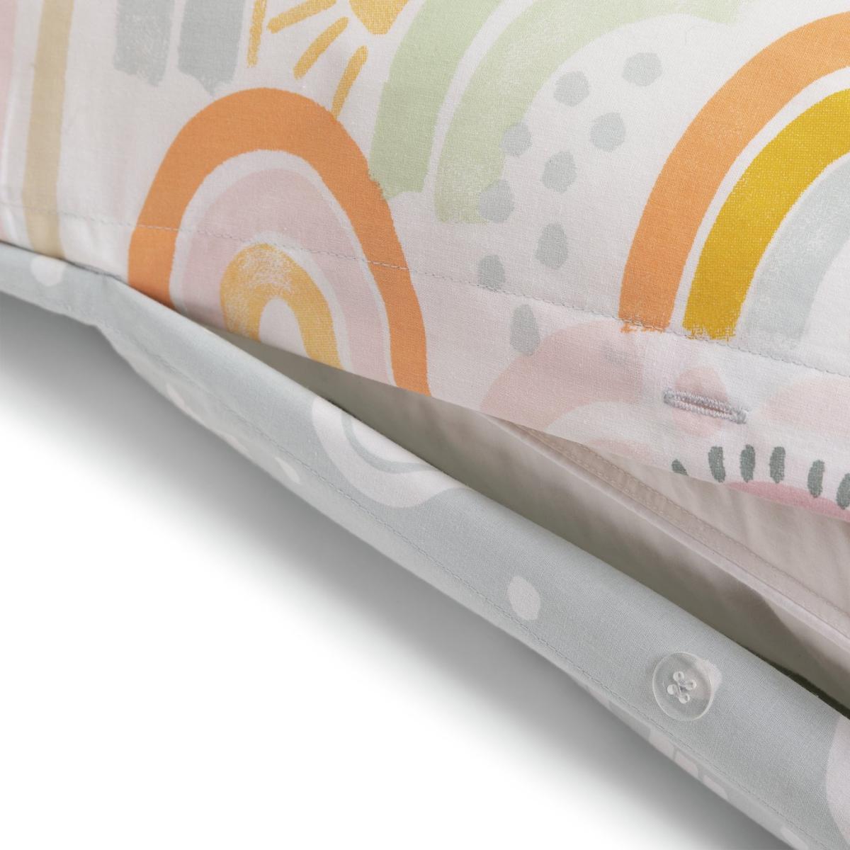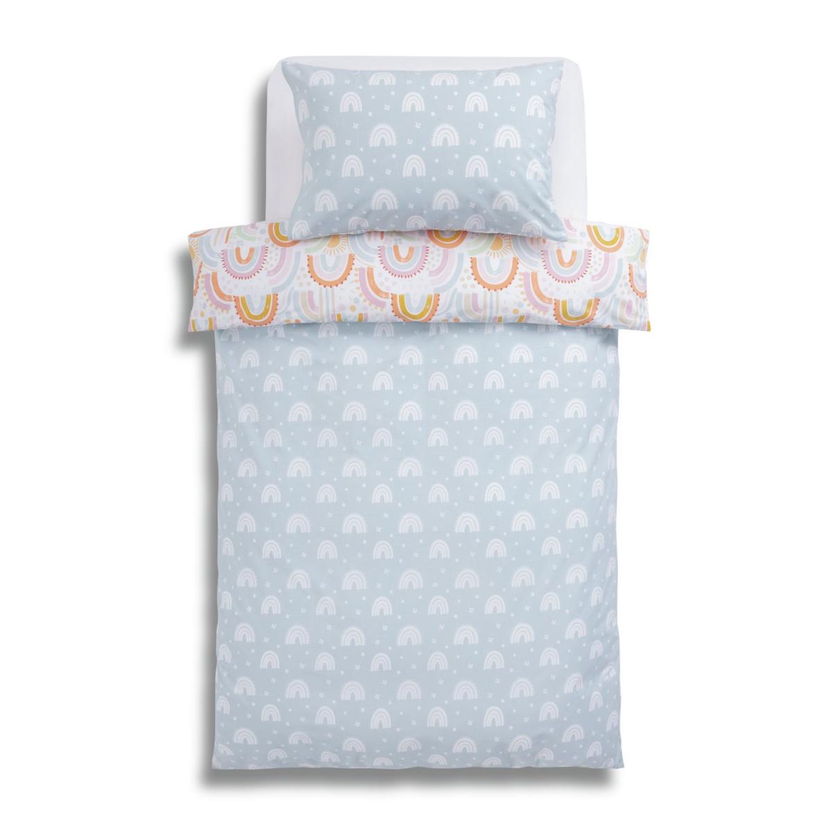 Don't we all wish our lives were full of rainbows and sunshine? Well this kids bedding set is as close as it gets. We love the pastel palette and cheerful graphics that uplift the mood of the bedroom. And reversible too, flip it over to reveal a simpler pale blue pattern. Set comprises of 1 duvet cover and 1 pillowcase. Multicoloured rainbows pattern. Finish: woven. Size L200 x W135cm. Pillow case length 75cm, Width 50cm. Standard pillowcase (s). Reversible pillowcase (s). Buttons for fastening. Machine washable at 40 C. Suitable for tumble drying. 52% recycled polyester, 48% cotton. 144 thread count.