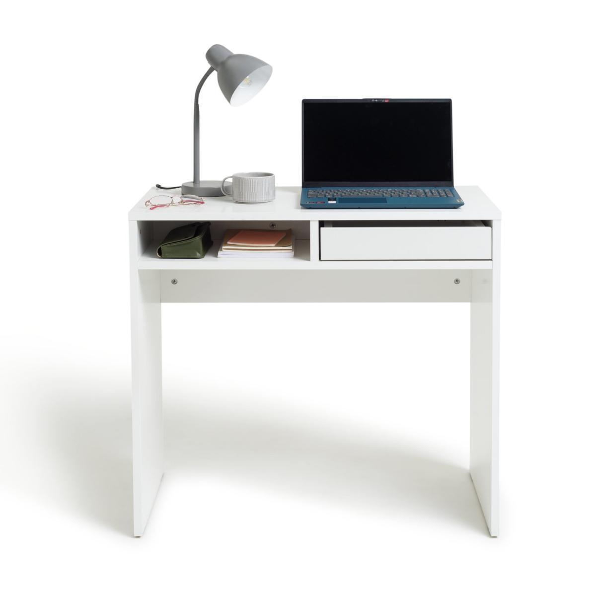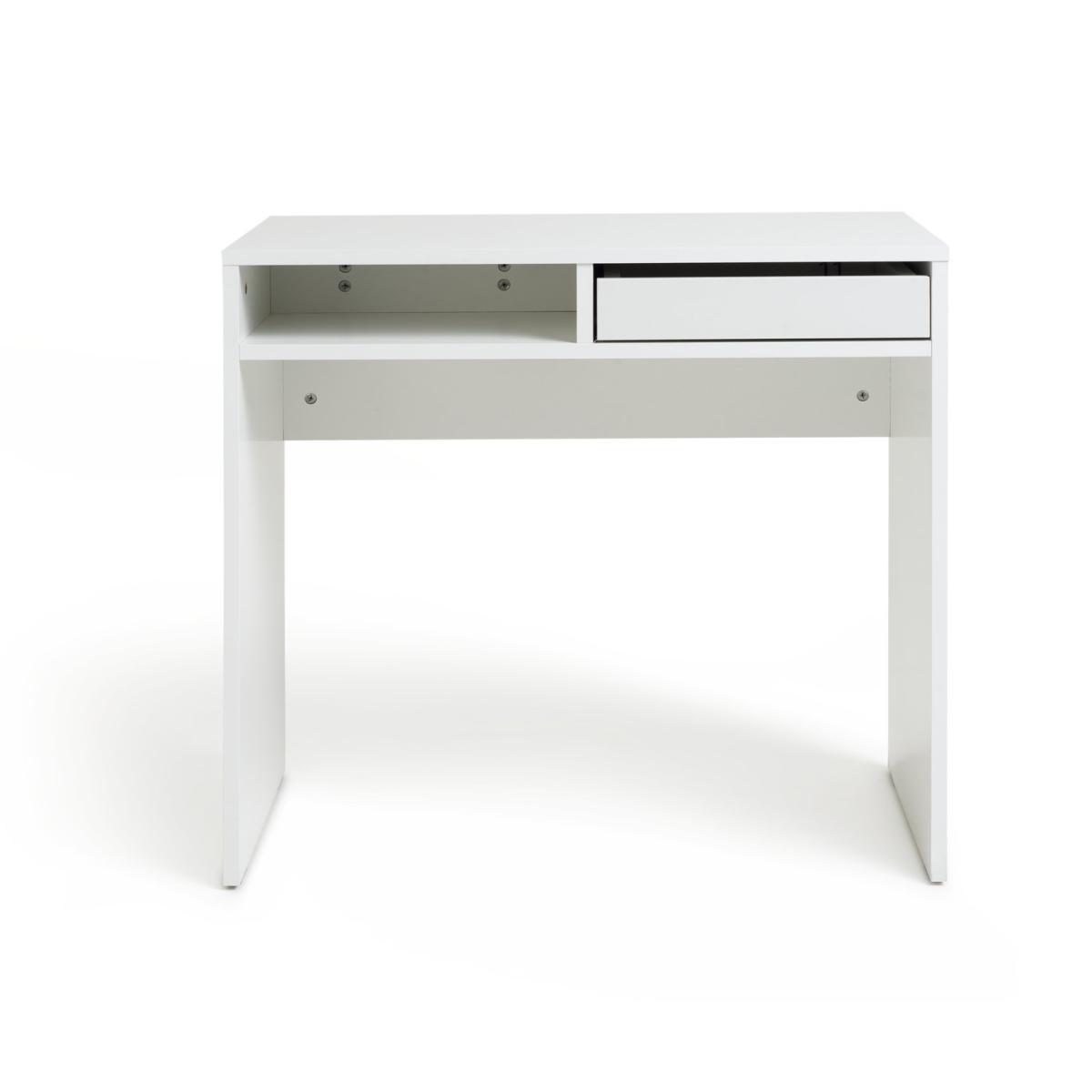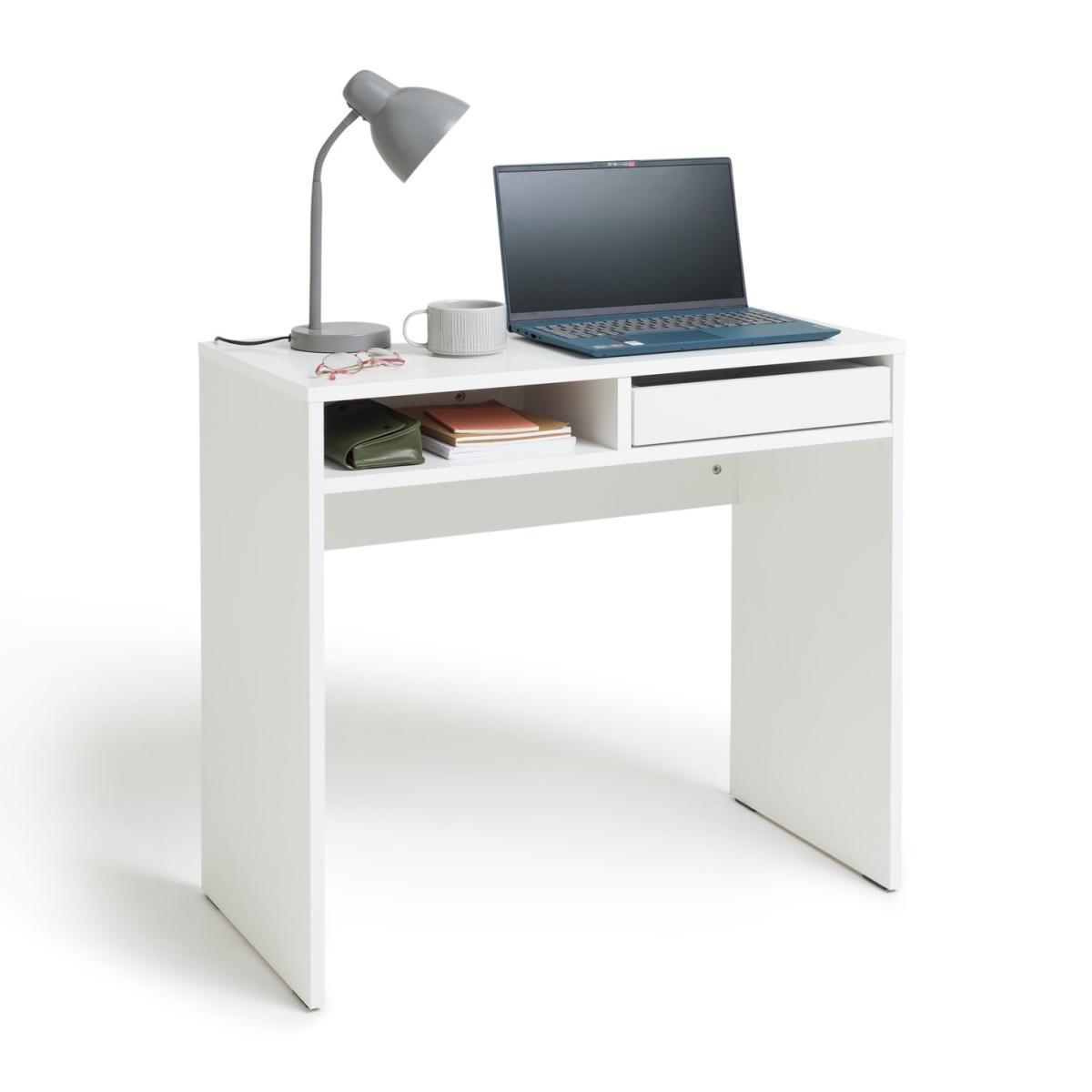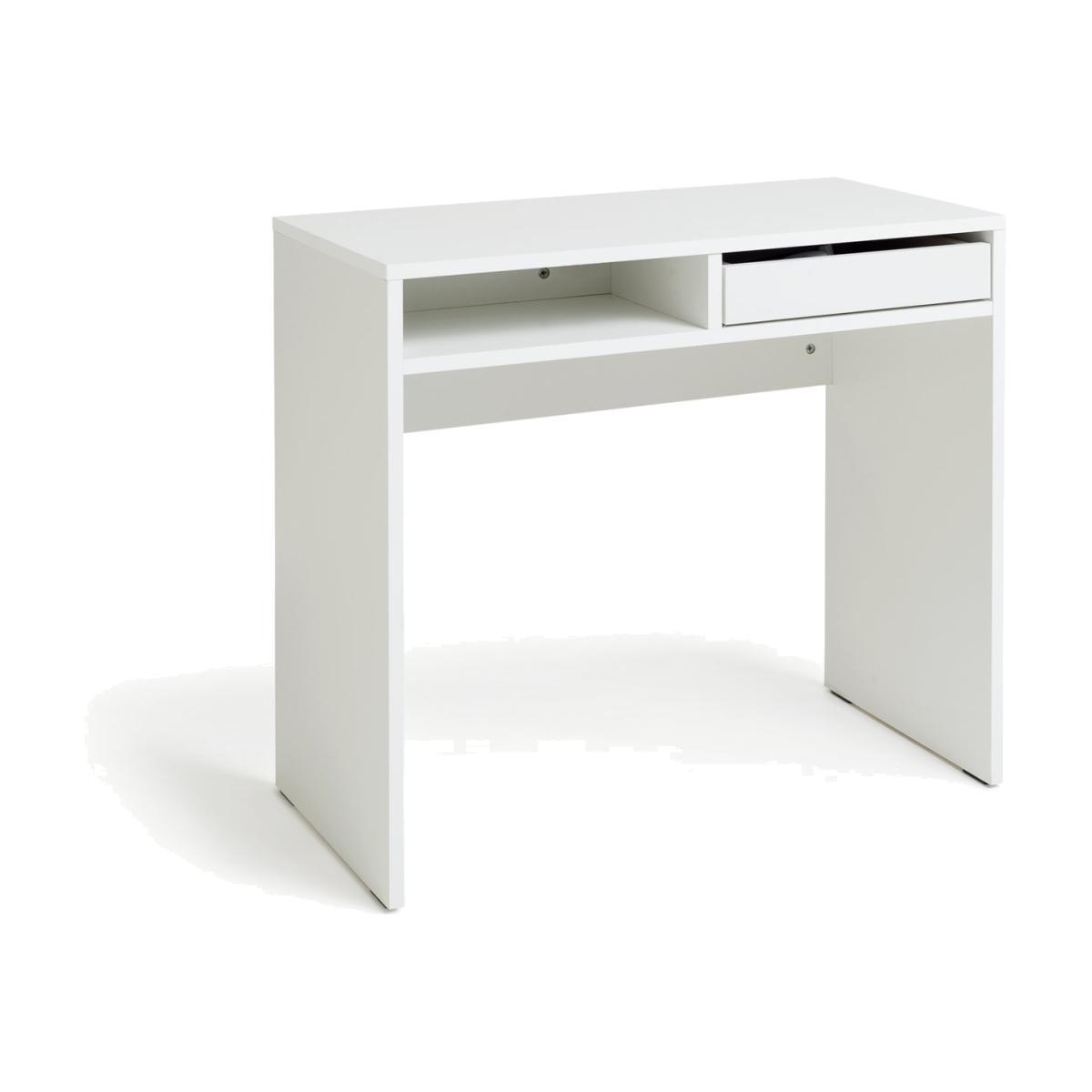 Tight for space but working from home? Here's the solution. Our small white desk is compact at just 80cm in length but still plenty of room for a laptop and phone charger on the work surface. One easy glide drawer lets you tidy away desk top clutter and an under desk shelf is perfect for current papers and essentials you need to hand. Just slide out the chair and you're ready to work. It's the business.