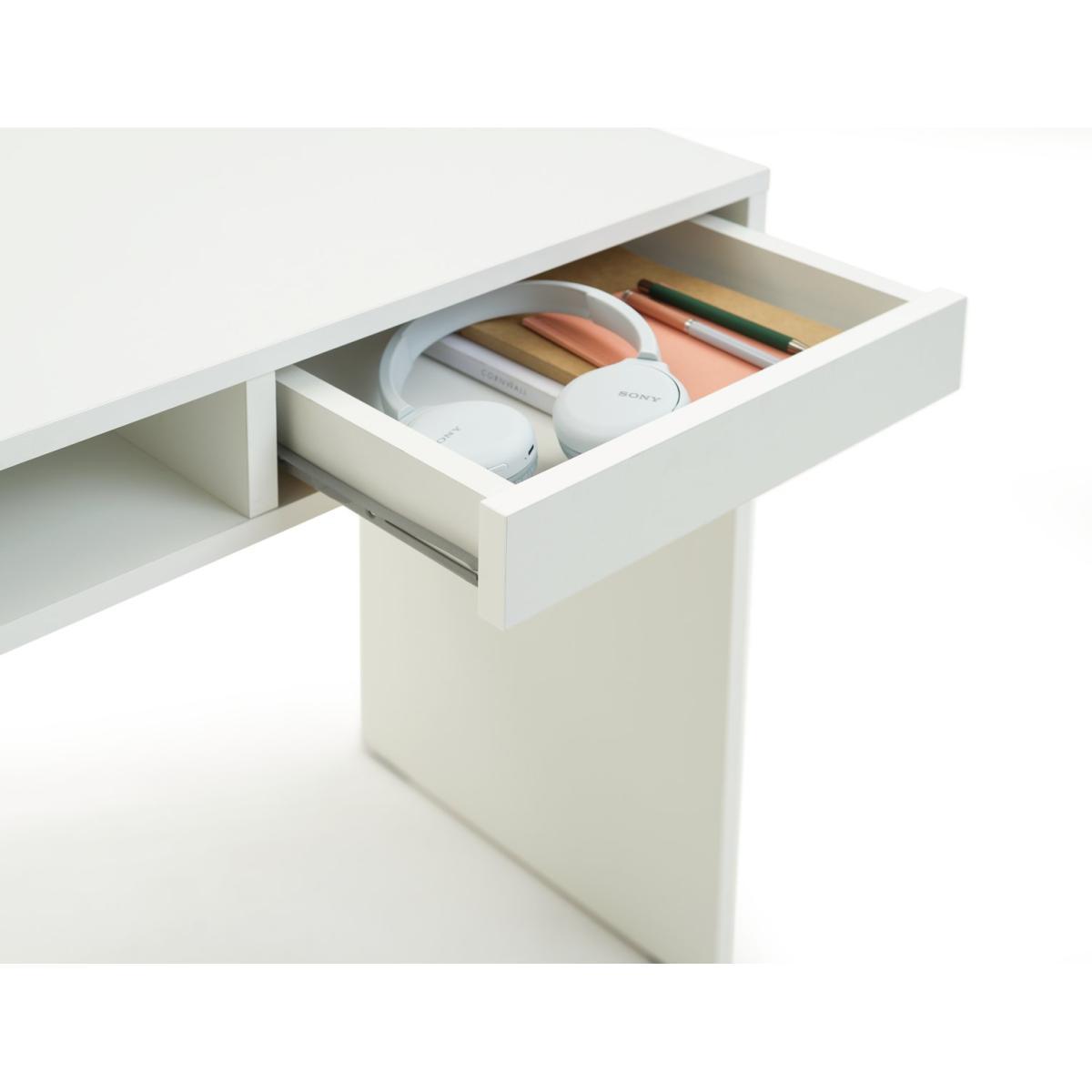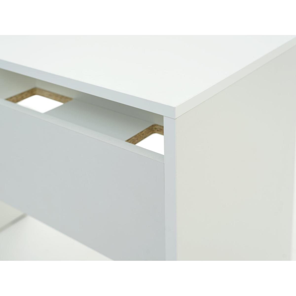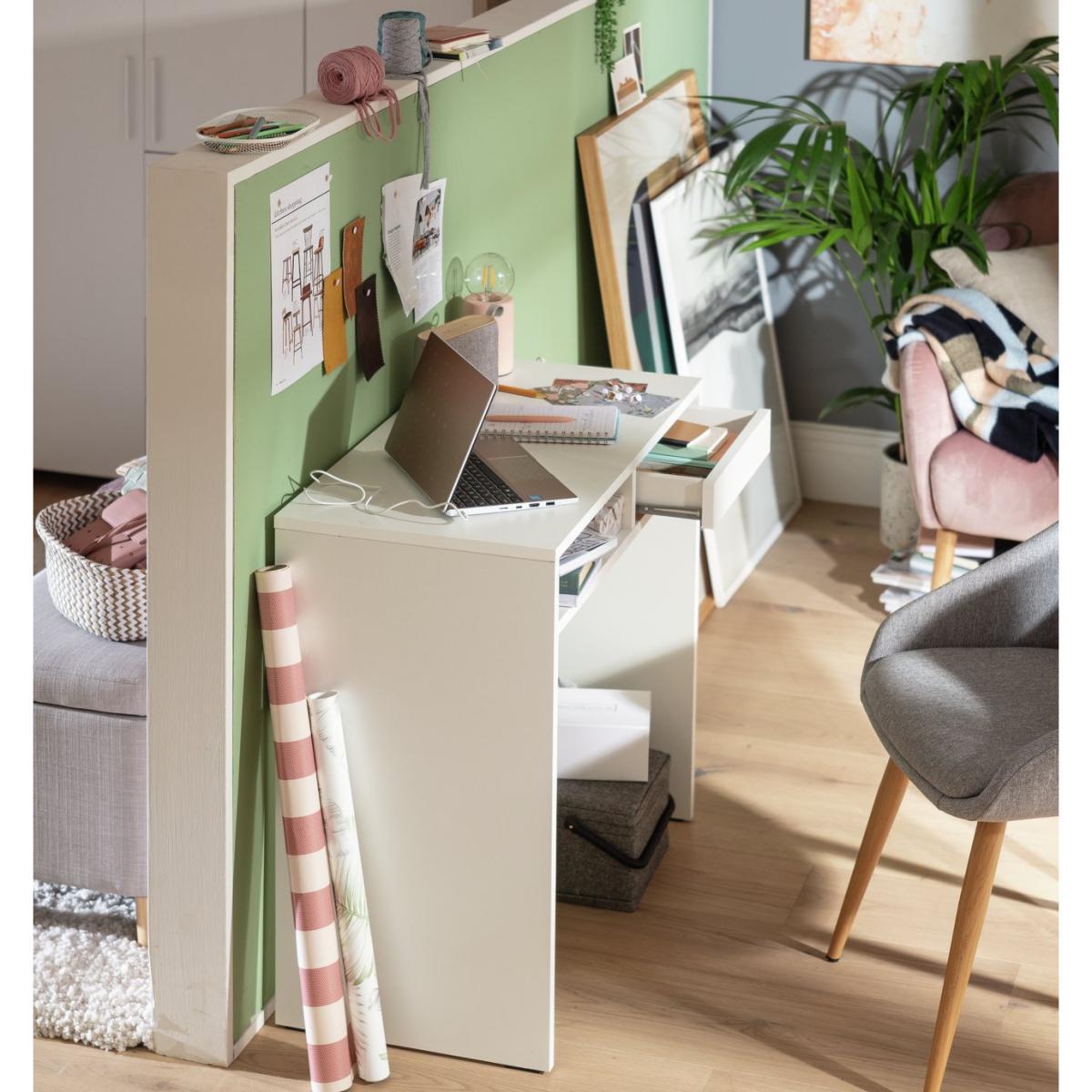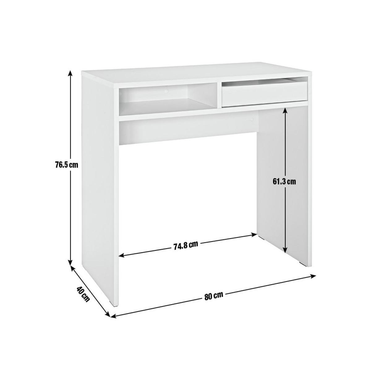 Tight for space but working from home? Here's the solution. Our small white desk is compact at just 80cm in length but still plenty of room for a laptop and phone charger on the work surface. One easy glide drawer lets you tidy away desk top clutter and an under desk shelf is perfect for current papers and essentials you need to hand. Just slide out the chair and you're ready to work. It's the business.