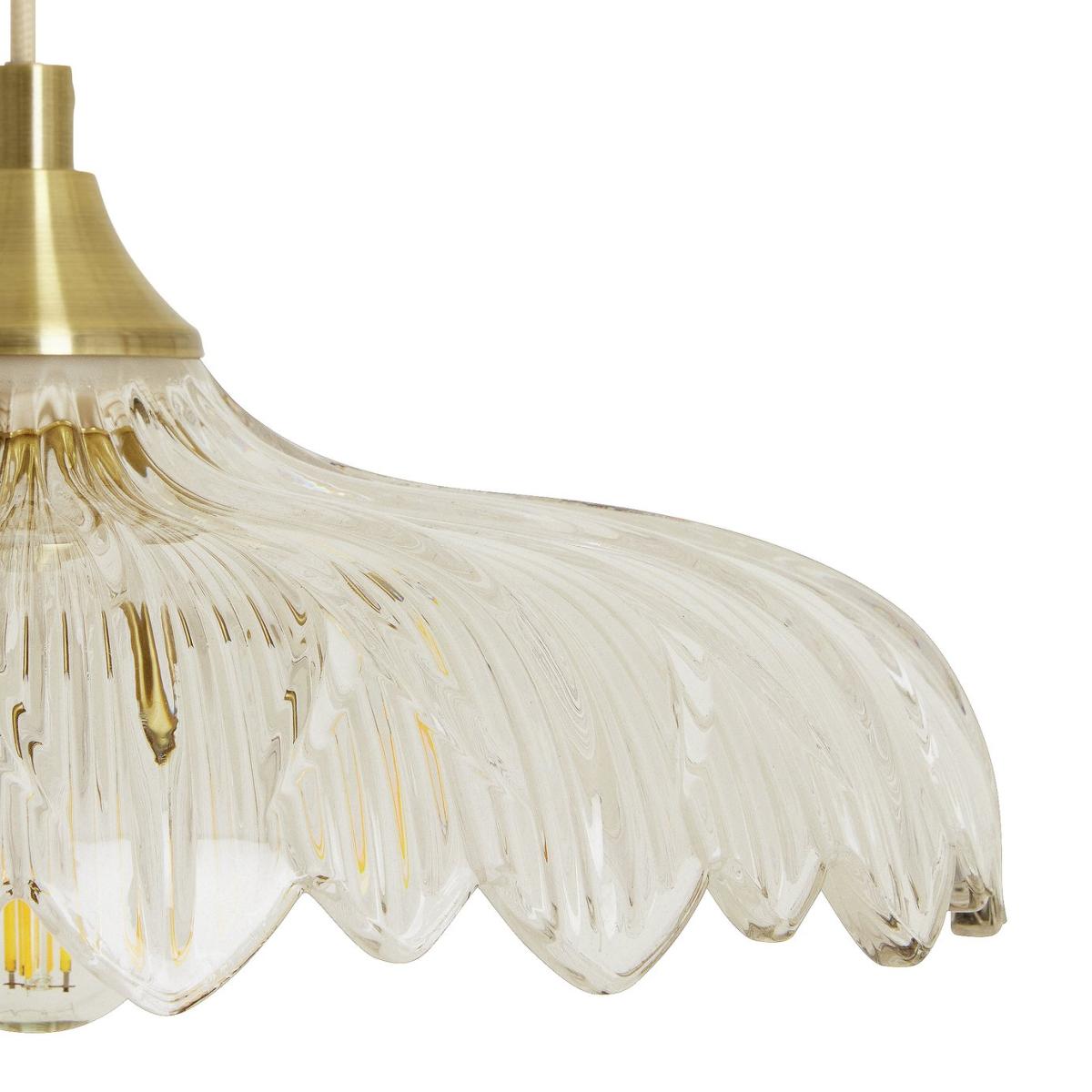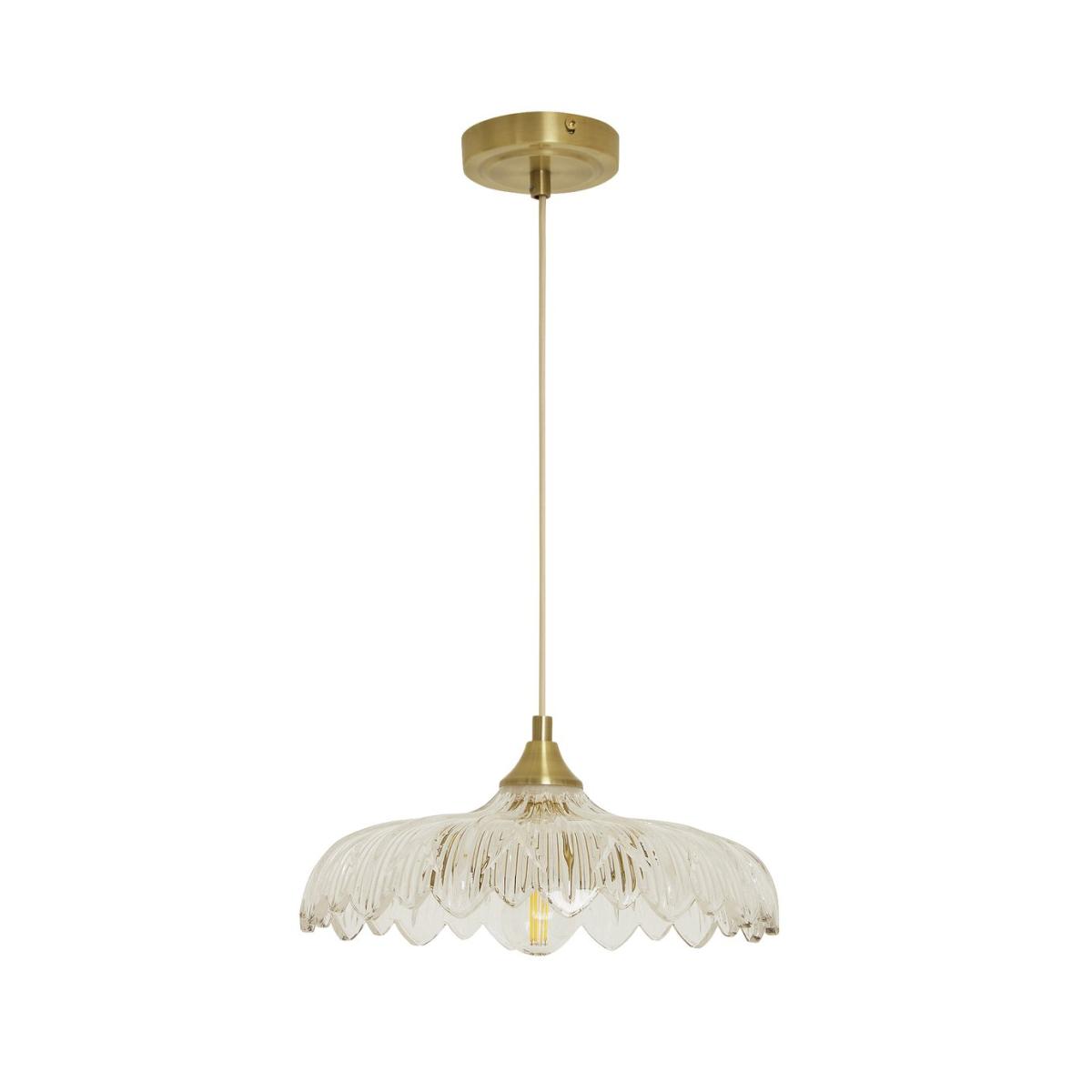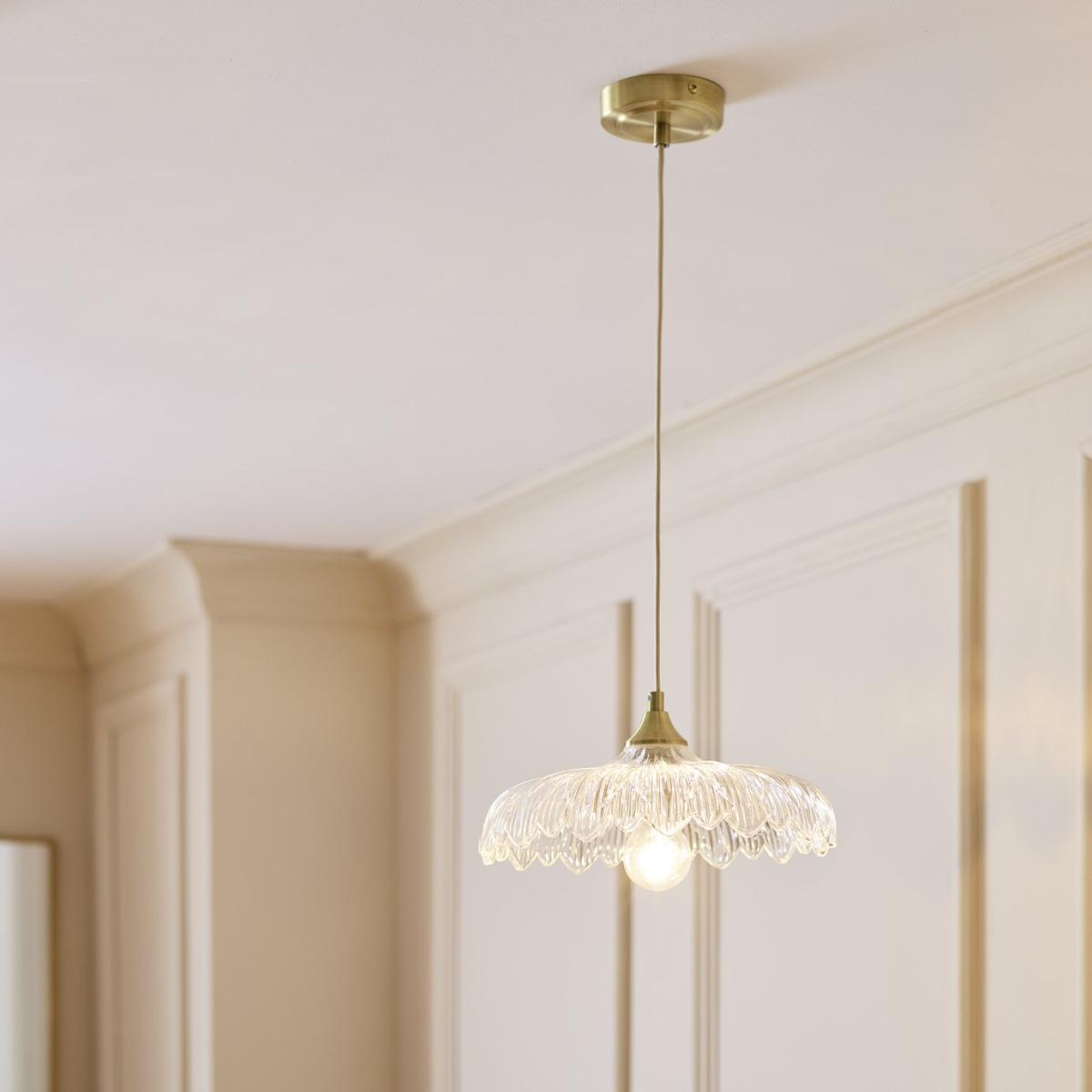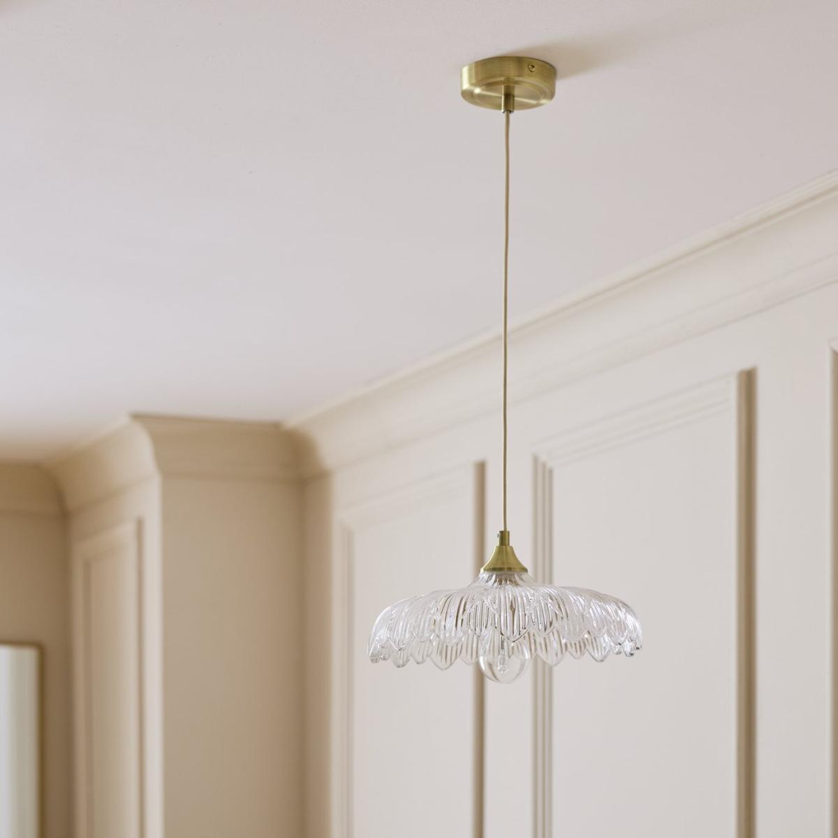 Graceful glow. With its fluted petal glass shade and brushed brass fitting, this ceiling light brings soft glamour to your overhead lighting. A vintage-inspired piece that adds warmth and elegance to timeless decor. Style it in a hallway, bedroom or above a dining table for an elegant atmosphere. Dimensions: Size H120, W29.5, D29.5cm. Diameter 29.5cm. Bulb Information: Bulbs required 1 x GLS E27 GLS bulb LED (not included). Recommended maximum wattage: 13 watts. Can not be used with a dimmer switch. Dimmable LED bulb. LED bulb only. General Information: Material: 40% Iron, 55% Glass, 5% Plastic. IP rating 20. Not suitable for bathroom use. Weight: 2.27kg. Self-assembly. Product is hard-wired into electrics. This lighting product is a class 2 fitting. Manufacturer's 1 year guarantee.