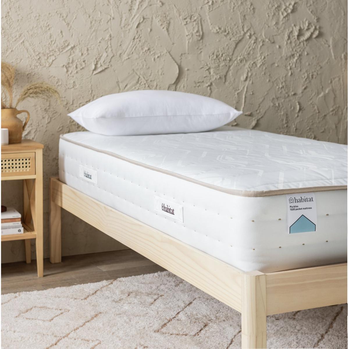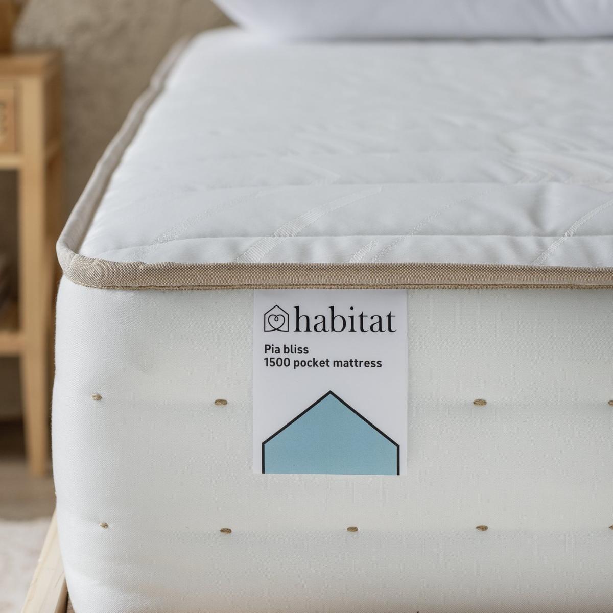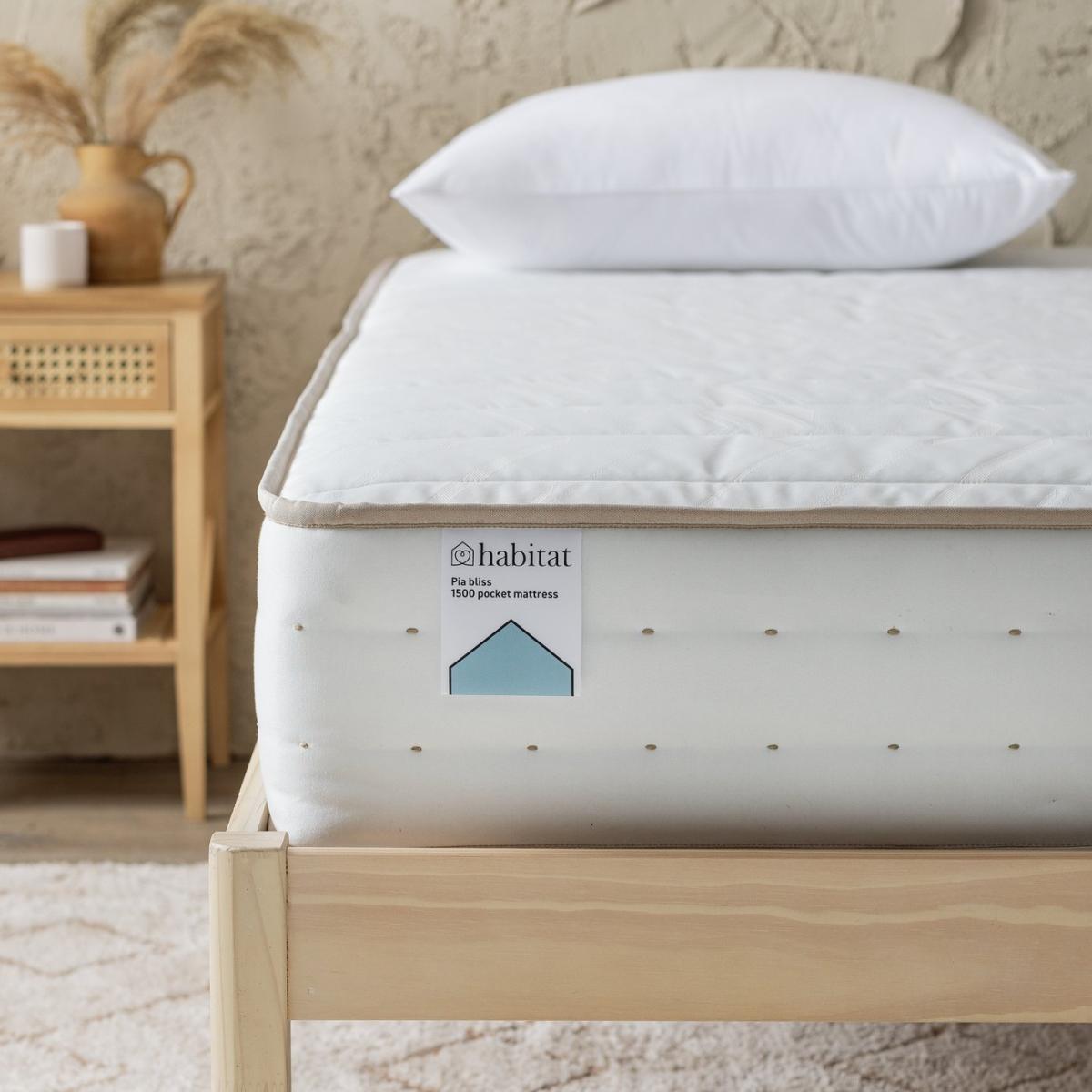 Sleep naturally. Our ultra-comfortable Pia mattress is filled with organic cotton, plus bamboo, Tencel, flax and hypoallergenic, breathable cushioning layers. The fabric also has an anti-allergy treatment. Foam free and quilted, the 1500 individually responsive pocket springs mellow any movement. No wonder this mattress is called Bliss. Easy to care for. No need to turn this mattress. A simple, regular rotation keeps it in tip top shape. At Argos Home we want you to get the best night's sleep possible, so we offer a 100 night comfort promise on our mattresses. Try your new mattress for up to 100 nights and if you aren't sleeping soundly, we'll offer you an exchange for one that suits you better. Part of the Pia collection. Firm feel. Pocket sprung mattress with 1500 springs. Damask cover with quilted finish. No roll together. Anti allergy. Mattress size W90, L190, D25cm. No-turn mattress. Rotate mattress regularly. Made in the UK.