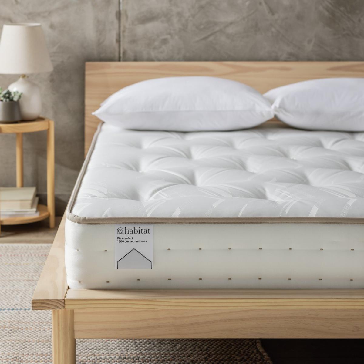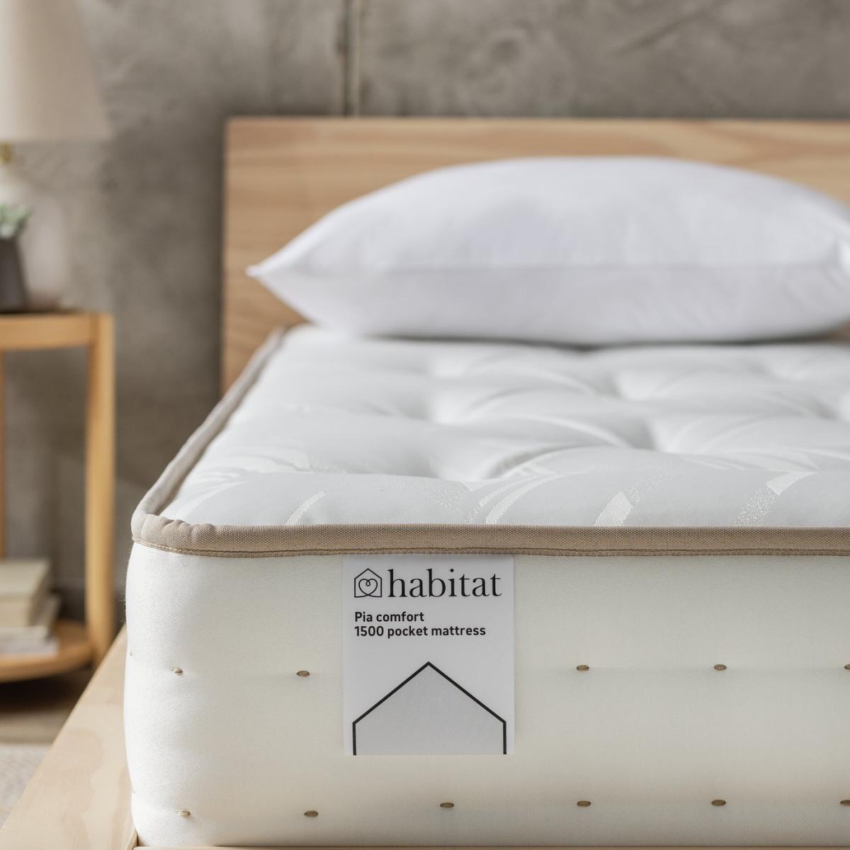Naturally relaxing. Certified 100% British wool is the deep hero filling inside our Habitat exclusive Pia mattress. Hypoallergenic and breathable. Foam free and quilted. With a knitted cover and tufted finish, and 1500 individually responsive pocket springs that mellow any movement. No wonder this mattress is called Comfort. Easy to care for. No need to turn this mattress. A simple, regular rotation keeps it in tip top shape. At Argos Home we want you to get the best night's sleep possible, so we offer a 100 night comfort promise on our mattresses. Try your new mattress for up to 100 nights and if you aren't sleeping soundly, we'll offer you an exchange for one that suits you better. Part of the Pia collection. Medium feel. Pocket sprung mattress with 1500 springs. Knit cover with tufted finish. No roll together. Anti allergy. Mattress size W150, L200, D24cm. No-turn mattress. Rotate mattress regularly. Made in the UK.