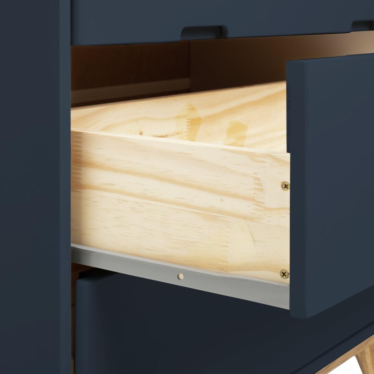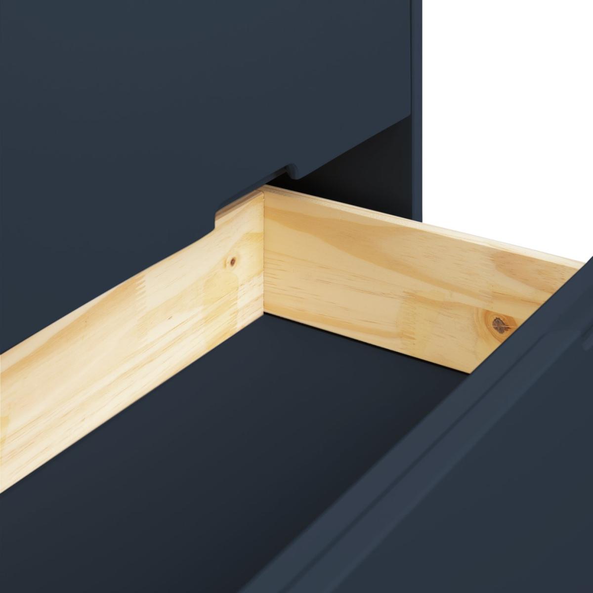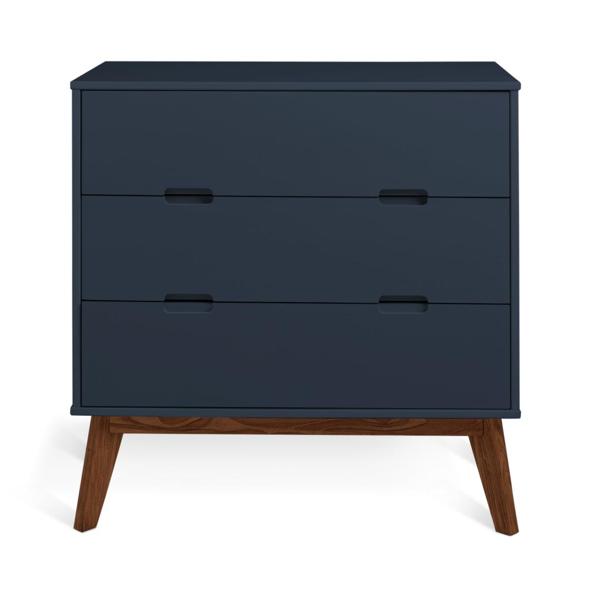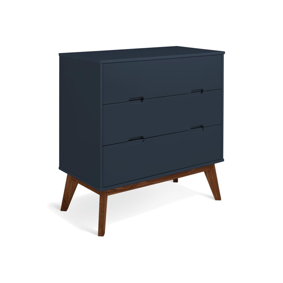 Sitting on splayed solid wooden legs our deep blue chest of drawers is uncompromisingly honest. No fuss, no frills, just uncluttered simple lines. The 3 easy glide drawers have cut-out handles that complement the smooth silhouette. Feel at home with Pimlico? Match with other pieces from the collection for a bedroom with a bold blue hue. Part of the Pimlico collection. Made of MDF and pine. 3 drawers with metal runners. Packed flat - 2 people recommended (includes wall fixings). Dimensions: Size H81.5, W80, D40cm. Internal drawer H9.8, W71.3, D29.7cm. Weight 25.53kg. Package Dimensions: Package 1 dimensions: H16.5, W91, D43.5cm. Package 1 weight: 28.6kg. General information: FSC certified meaning the materials used for this product are responsibly sourced. Manufacturer's 1 year guarantee.