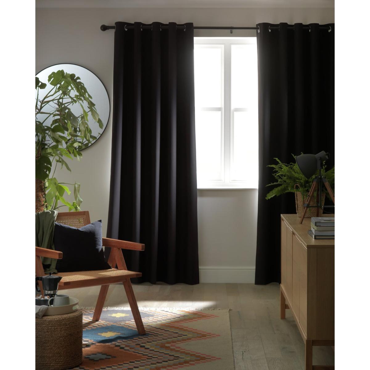 Swishy. Slide our black blackout curtains straight onto your curtain pole. So easy. Fully lined and falling in wide soft folds from the stainless steel eyelet header, they look smart open or closed. And they are a win, win solution. Draw them to block summer light out. Simple and classic. Lovely. Sleep tight. Why not wake up to luxury linen too, we have some adorable options that will look fabulous with these curtains. Black plain Design. Silver stainless steel Eyelets. Features Blackout. Made from 52% polyester and 48% cotton. Unlined. Dimensions Size 229cm (90 inches) wide by 137cm (54 inches) drop. Dimensions provided include header tape. Width refers to one curtain panel before hanging. Eyelet diameter: 4cm. General information Contains one pair of curtains. Suitable for curtain poles. Curtain pole not included. General Information: We are excited to be welcoming some of our favourite HOME products into the Habitat range. Your product may arrive in Habitat or HOME packaging.
