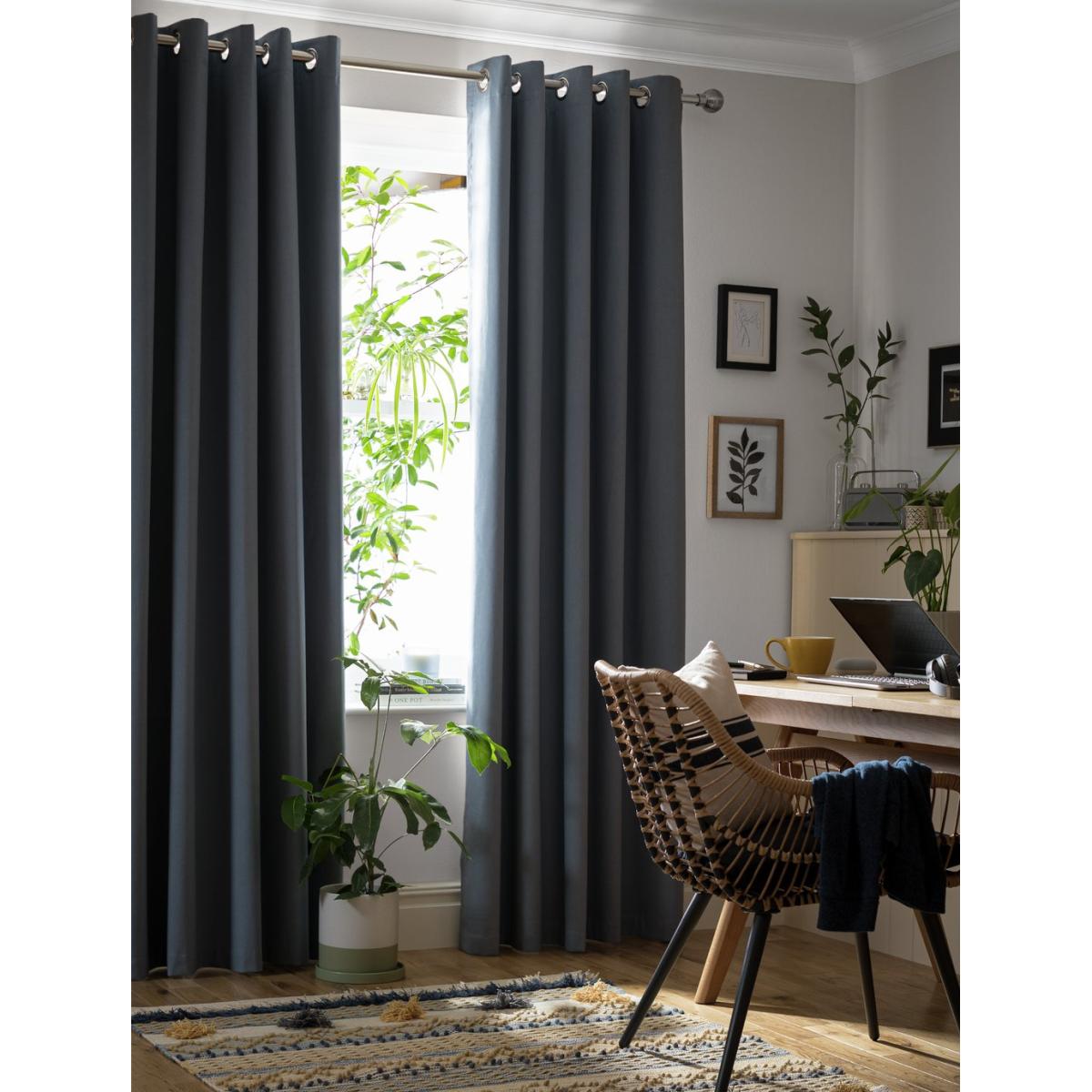 Swishy. Slide our rustic blue blackout curtains straight onto your curtain pole. So easy. Falling in wide soft folds from the stainless steel eyelet header, they look smart open or closed. And they are a win, win solution. Draw them to block summer light out or winter heat in. Simple and classic. Lovely. Sleep tight. Why not wake up to luxury linen too, we have some adorable options that will look fabulous with these curtains. Blue Plain Design. Silver Stainless Steel Eyelets. Features Made from 52% polyester and 48% cotton. Unlined. Dimensions Size 229cm (90 inches) wide by 183cm (72 inches) drop. Width refers to one curtain panel before hanging. General information Contains one pair of curtains. Suitable for curtain poles. Curtain pole not included. General Information: We are excited to be welcoming some of our favourite HOME products into the Habitat range. Your product may arrive in Habitat or HOME packaging.