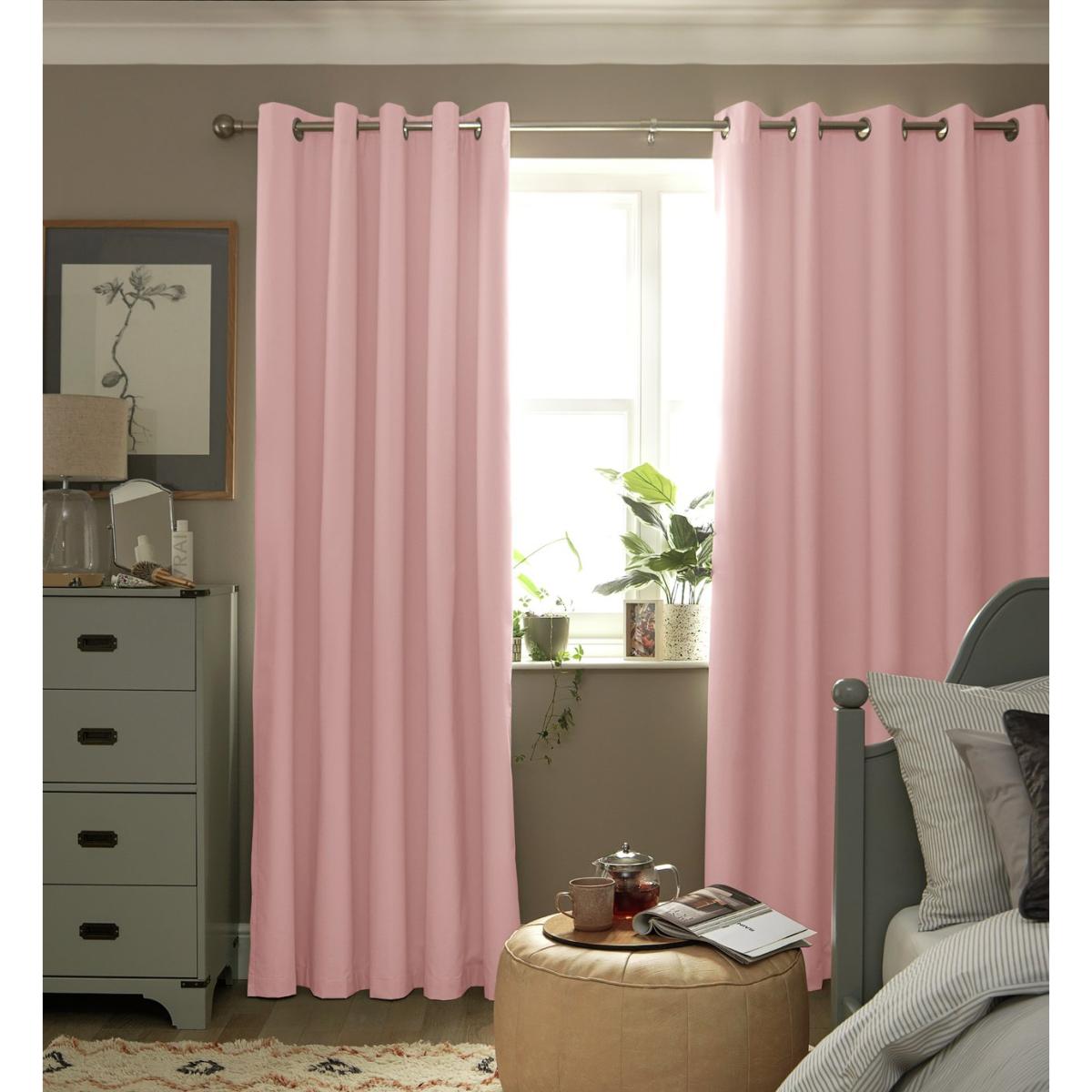Need a nice dark room to get a good night's sleep? Yep, so do we. That's why we love this pair of blackout curtains. They'll help keep the light out, making sure you get a decent rest all year round. We've chosen an eyelet header to give them soft, wide folds and for ease of installation. There's no fiddling required with eyelets, simply slot them onto the curtain pole and you're done. Soft handfeel. Blush pink Plain Design. Silver Stainless Steel Eyelets. Features Blackout. Made from 52% polyester and 48% cotton. Unlined. Dimensions Size 229cm (90 inches) wide by 229cm (90 inches) drop. Width refers to one curtain panel before hanging. Eyelet diameter: 4cm. General information Contains one pair of curtains. Suitable for curtain poles. Curtain pole not included. Machine washable. General Information: We are excited to be welcoming some of our favourite HOME products into the Habitat range. Your product may arrive in Habitat or HOME packaging.